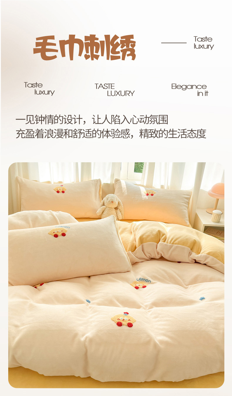 当前位置: 91家纺网 > 商品网购 > 床品套件 > 四件套 > 牛奶绒四件套 > 丽涵家纺 2025秋冬新品210克牛奶绒毛巾绣四件套卡通绣花学生床笠三件套 柠檬宝宝