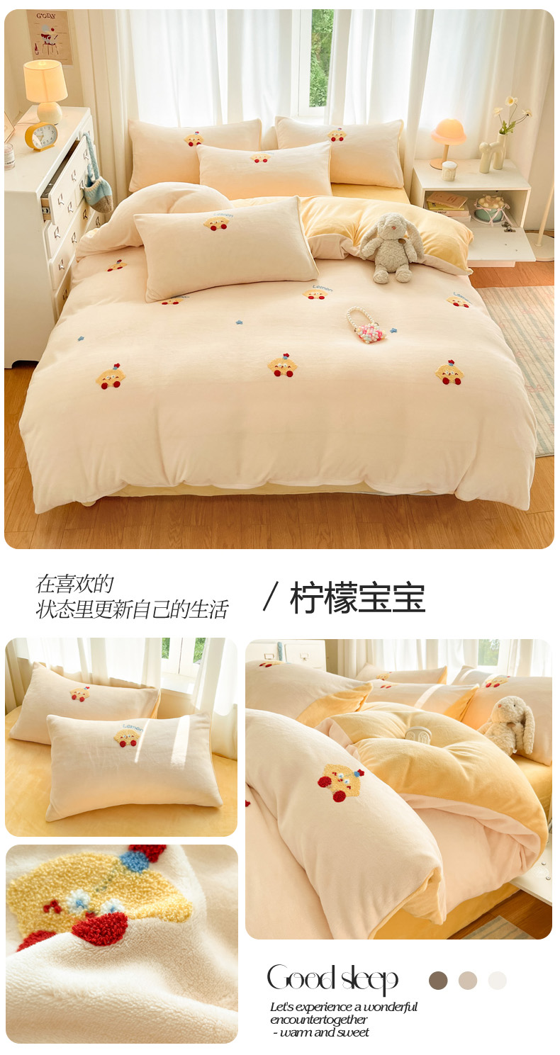当前位置: 91家纺网 > 商品网购 > 床品套件 > 四件套 > 牛奶绒四件套 > 丽涵家纺 2025秋冬新品210克牛奶绒毛巾绣四件套卡通绣花学生床笠三件套 小奶酪