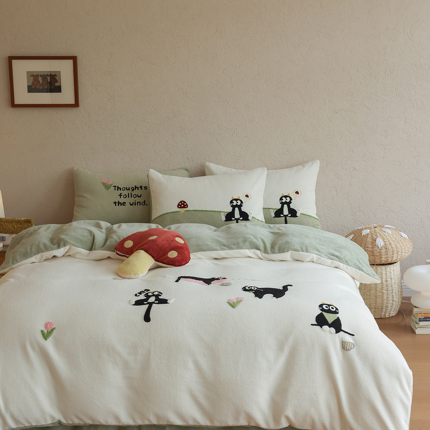 2022锦芙牛奶绒250克全消光绣花四件套,情绪熊猫-绿竹