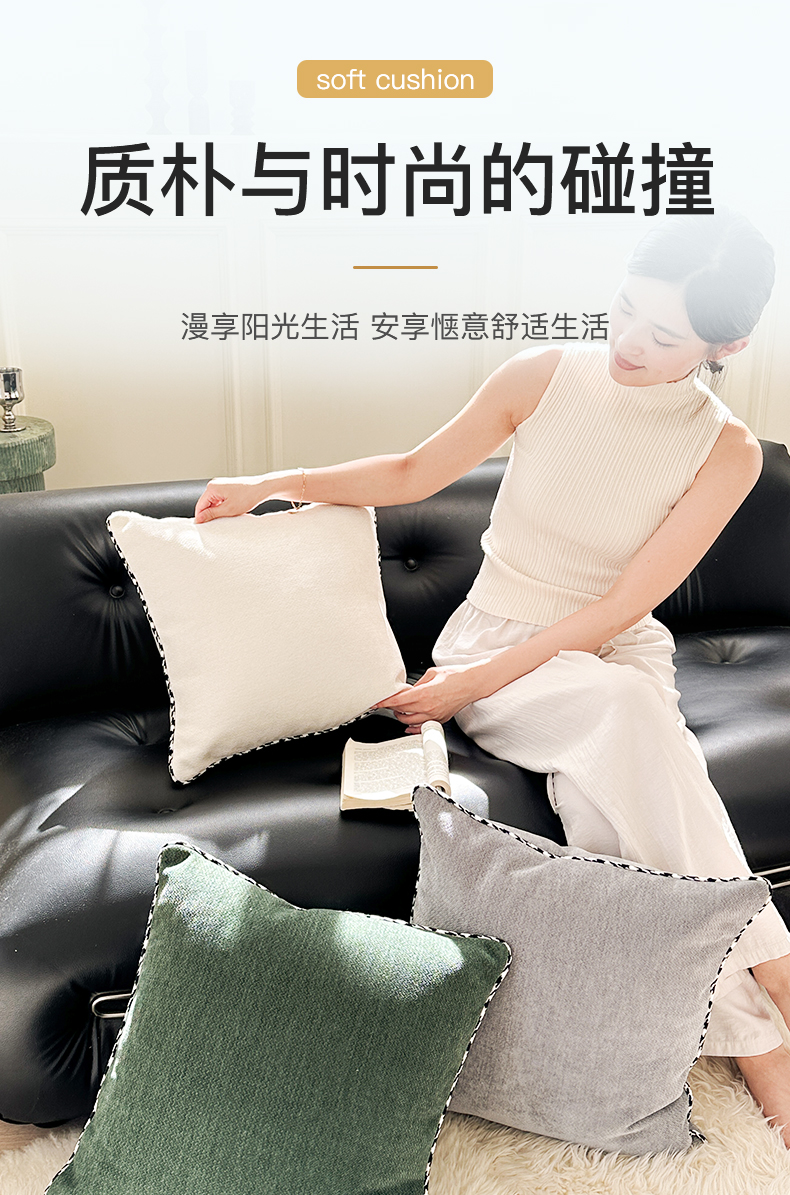 商品名称:美茉家居 2025新款加厚高端沙发布雪尼尔滚边方枕抱枕 珍珠白