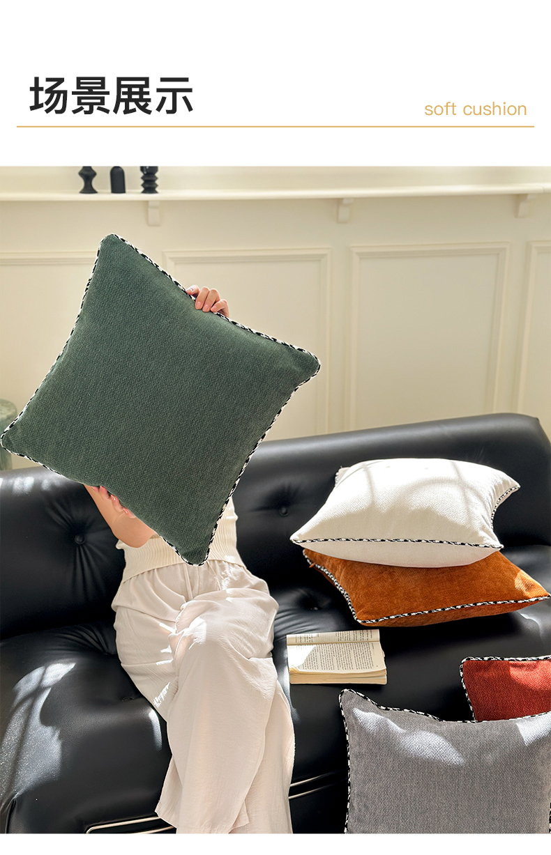 (总)美茉家居 2025新款加厚高端沙发布雪尼尔滚边方枕抱枕,缎面红,孔雀绿,南瓜橘,烟雨灰,珍珠白