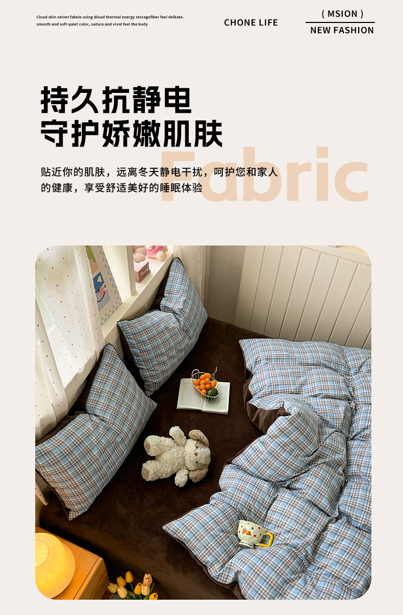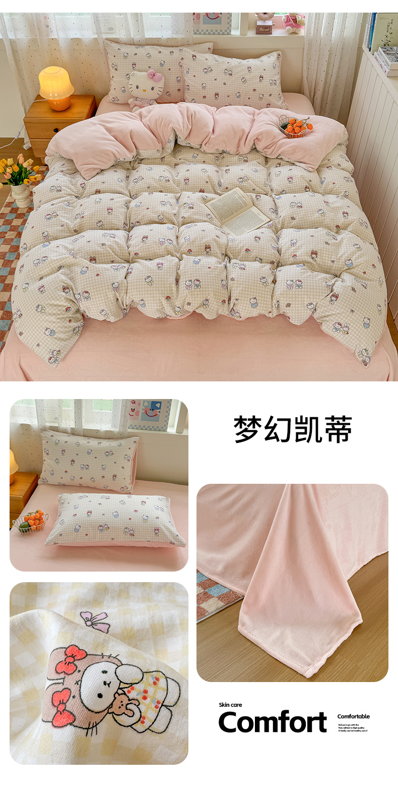 商品名称:十一家居 2025年新款A类云斜棉+牛奶绒春秋冬正反两用四件套—星漾系列 星漾-梦幻凯蒂