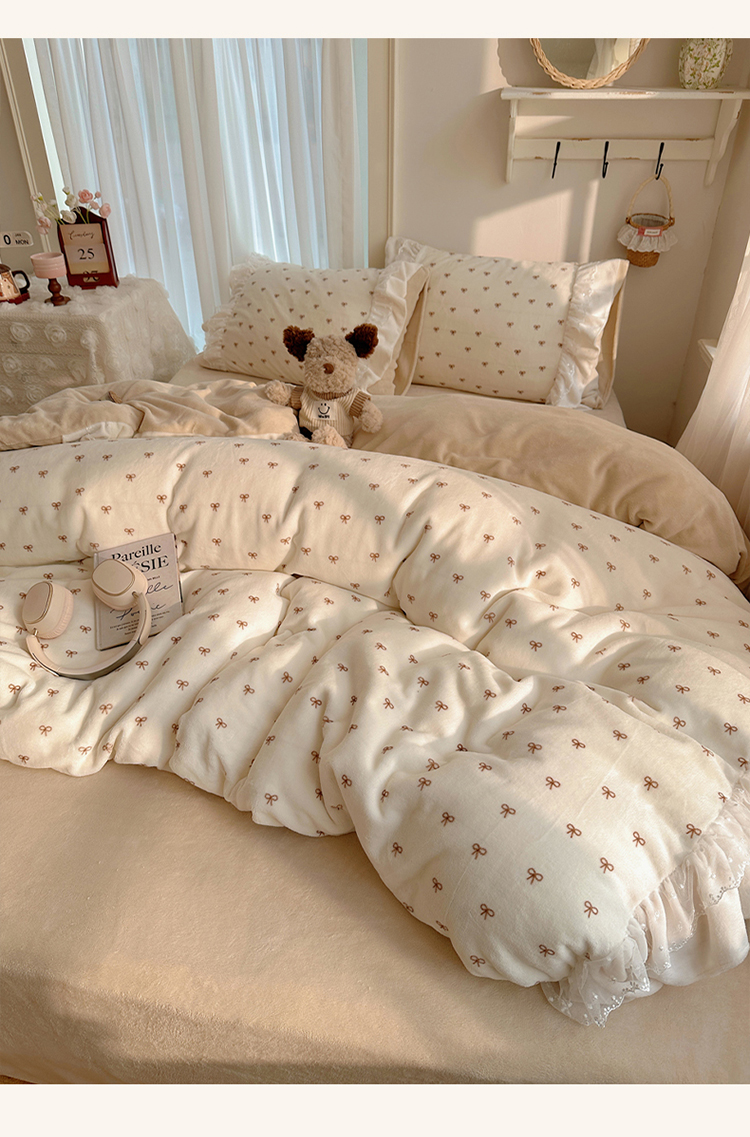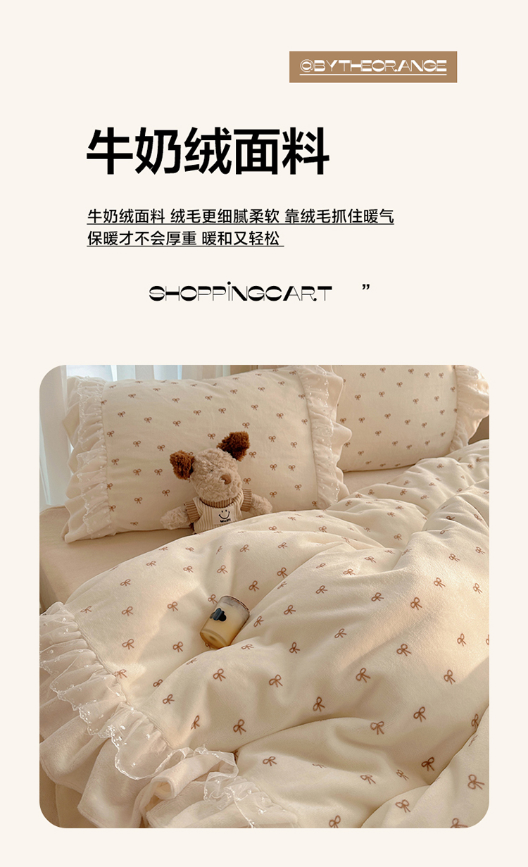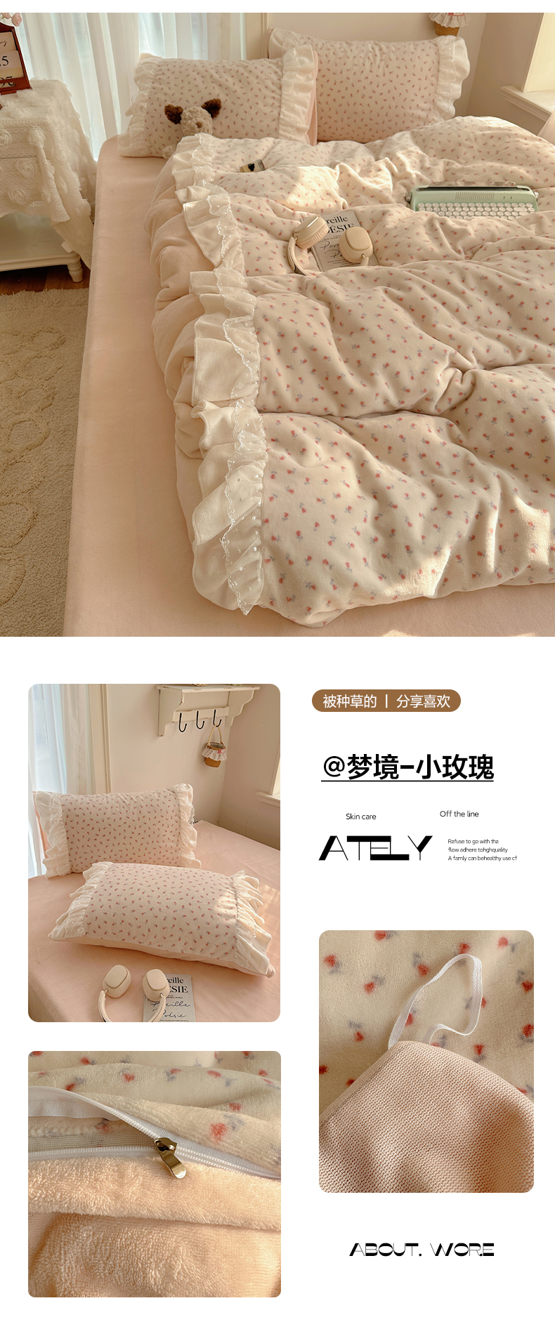 当前位置: 91家纺网 > 商品网购 > 床品套件 > 四件套 > 牛奶绒四件套 > 山茶家纺 2025新款韩系A类牛奶绒花边印花四件套梦境 梦境-小樱桃粉