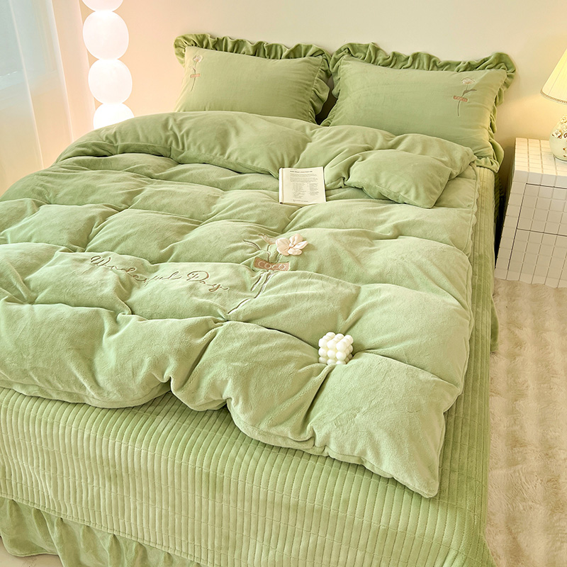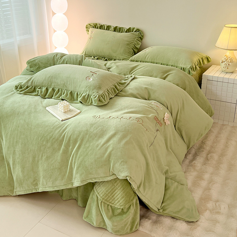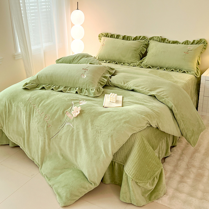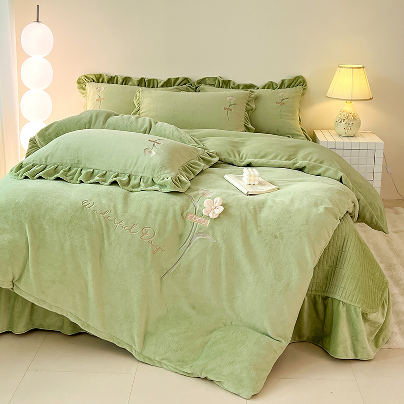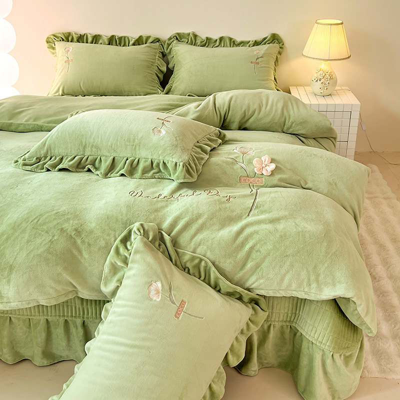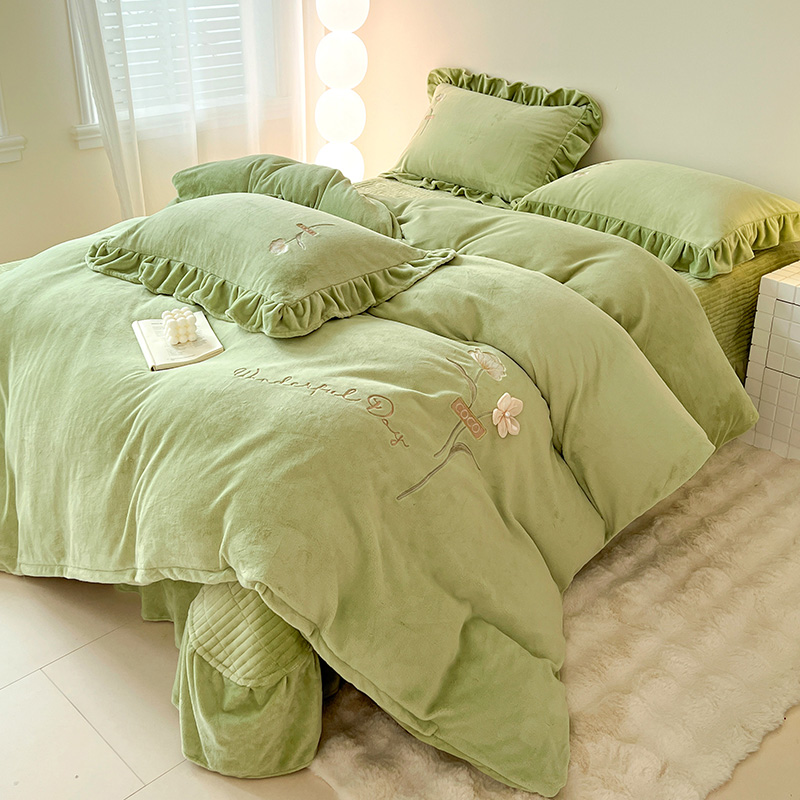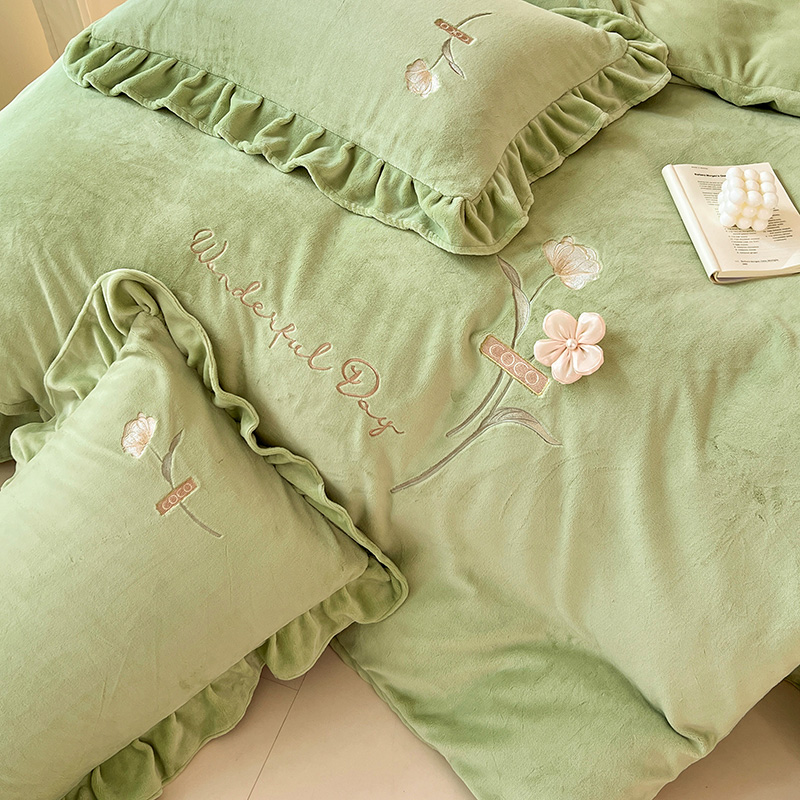 商品名称:梦莱斯 2025新款全消光床盖款牛奶绒刺绣四件套-山茶花 山茶花-绿