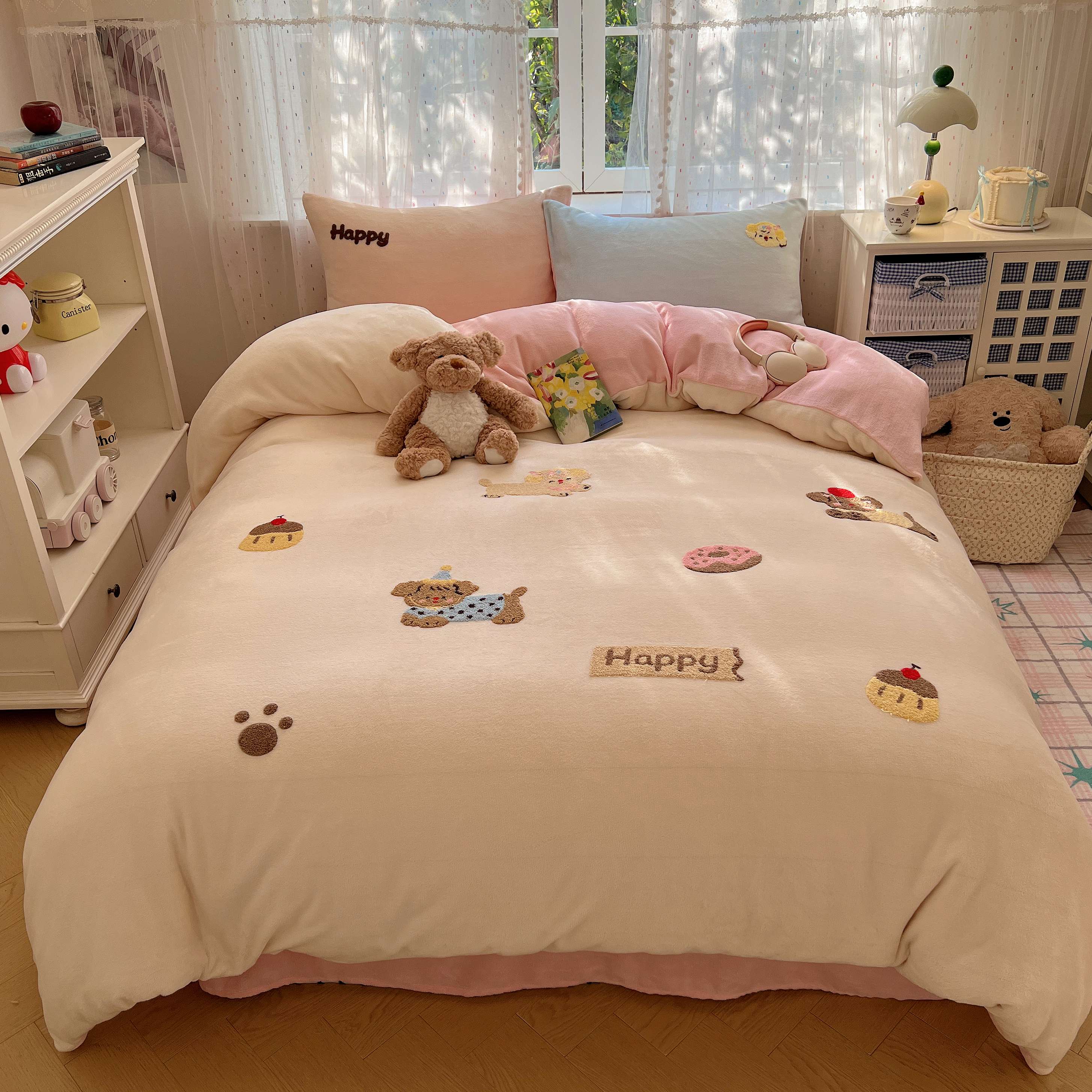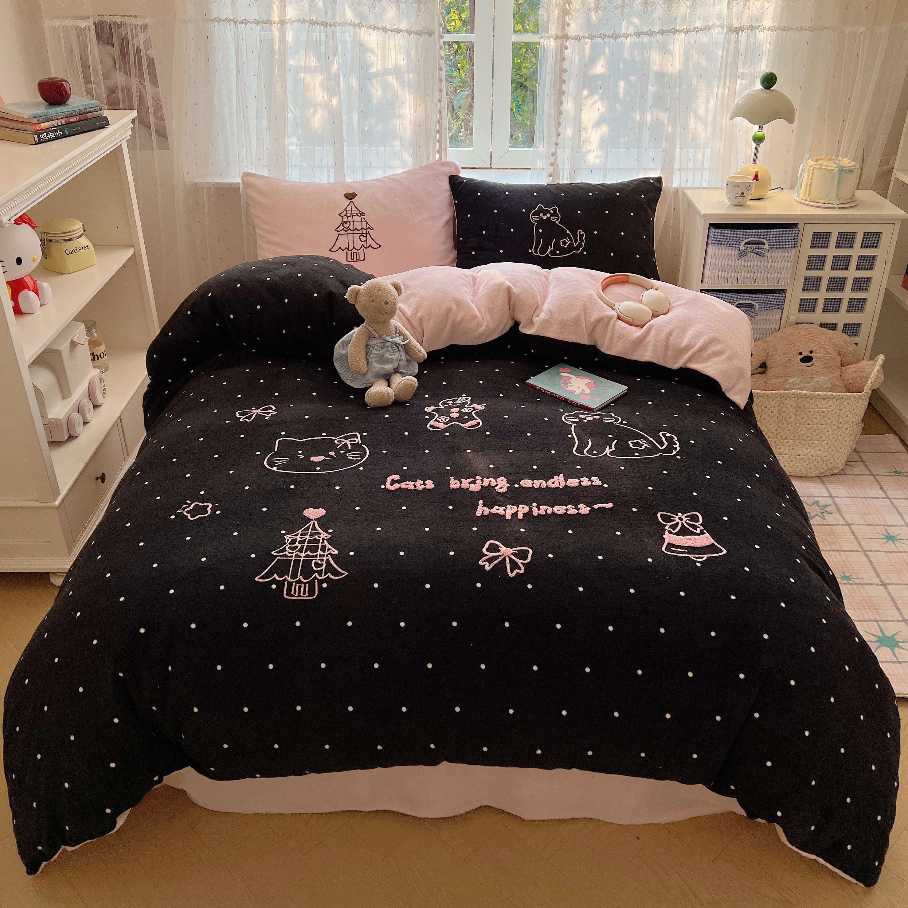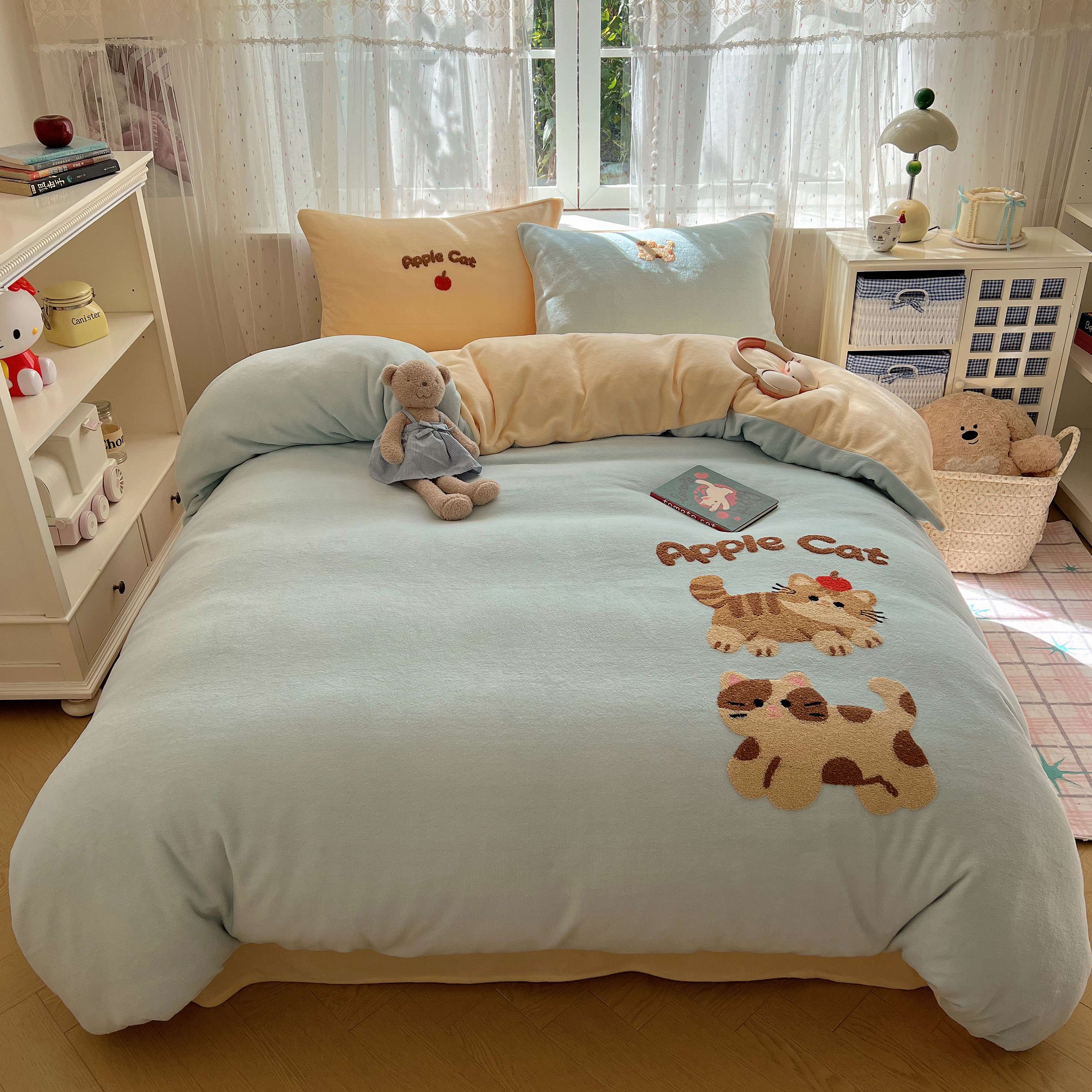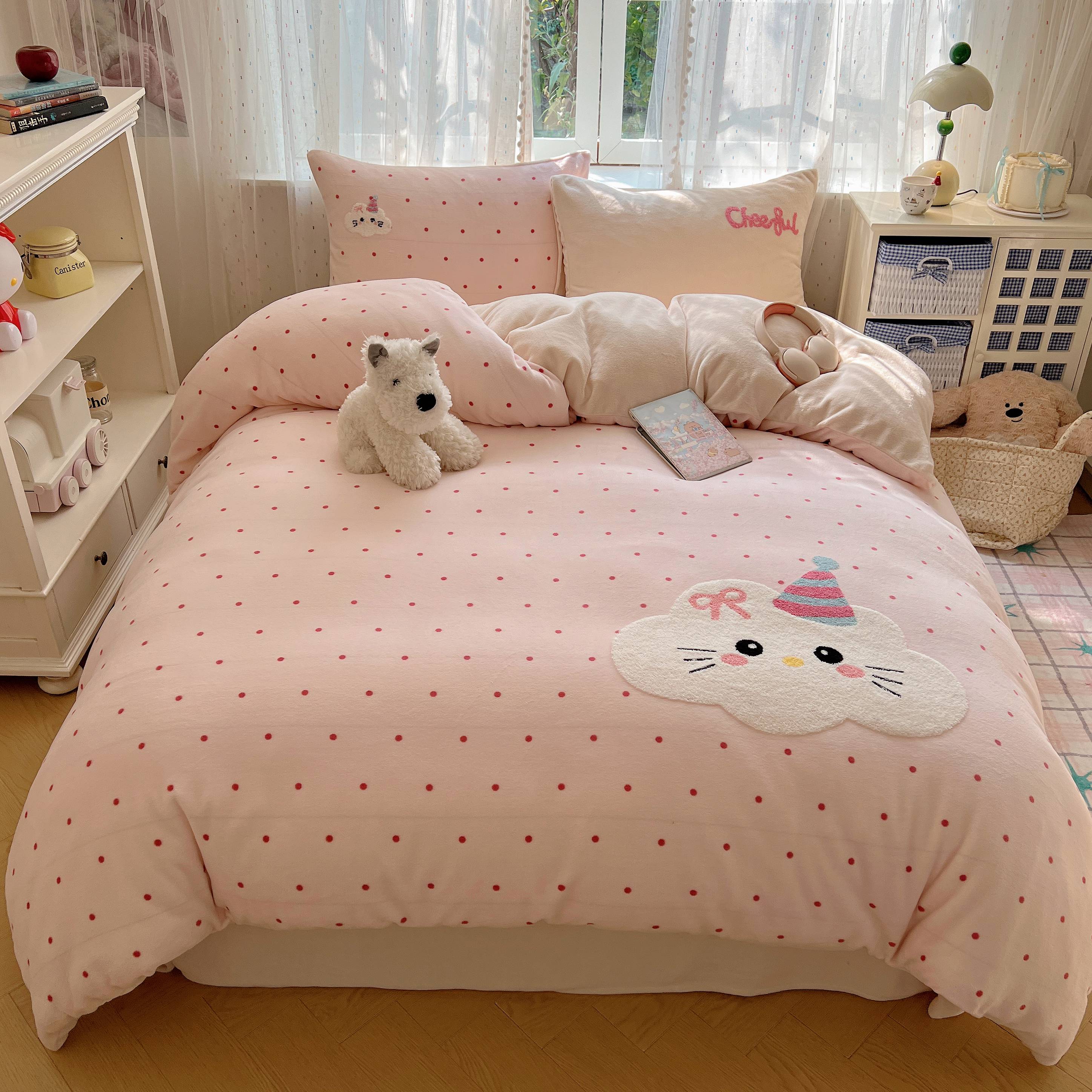 当前位置: 91家纺网 > 商品网购 > 床品套件 > 四件套 > 牛奶绒四件套 > 顾里家纺 2025秋冬新款童趣毛巾绣印花牛奶绒四件套 波点蛋糕猫