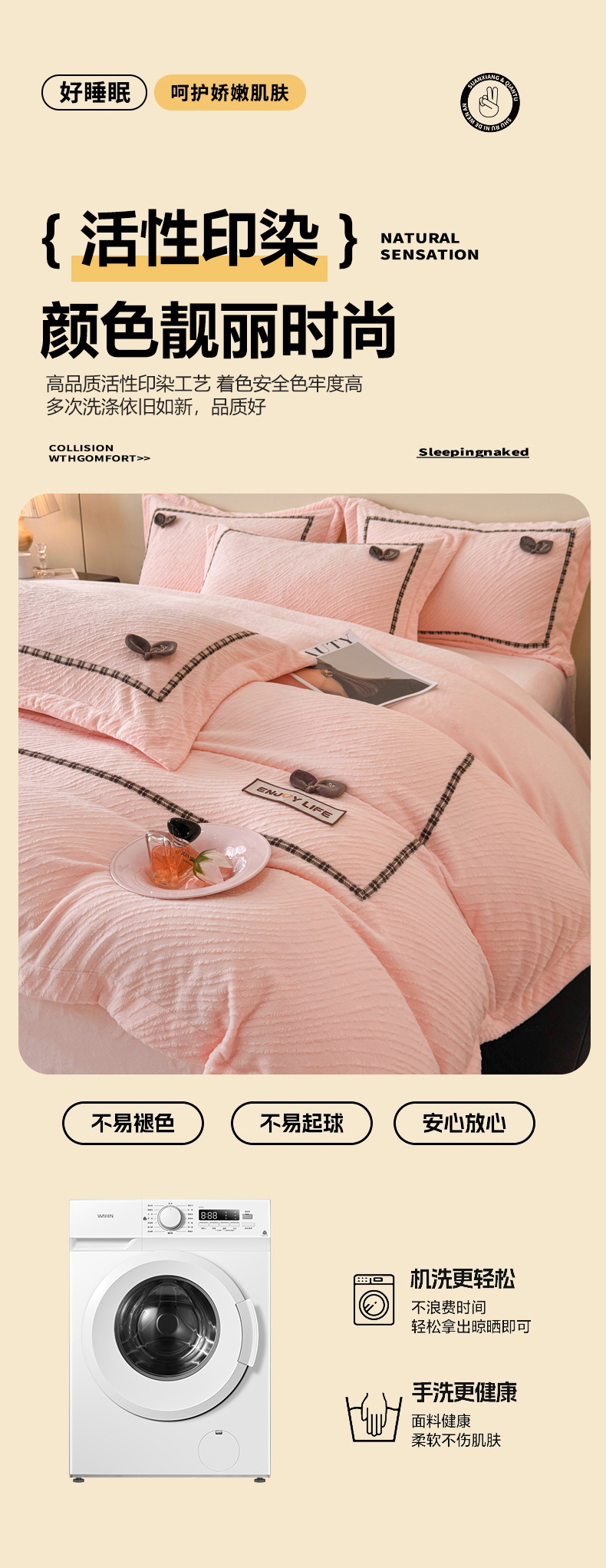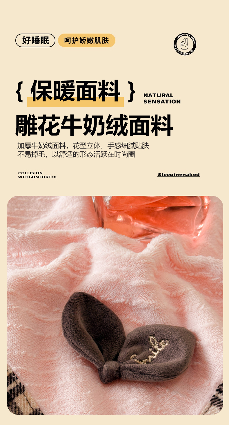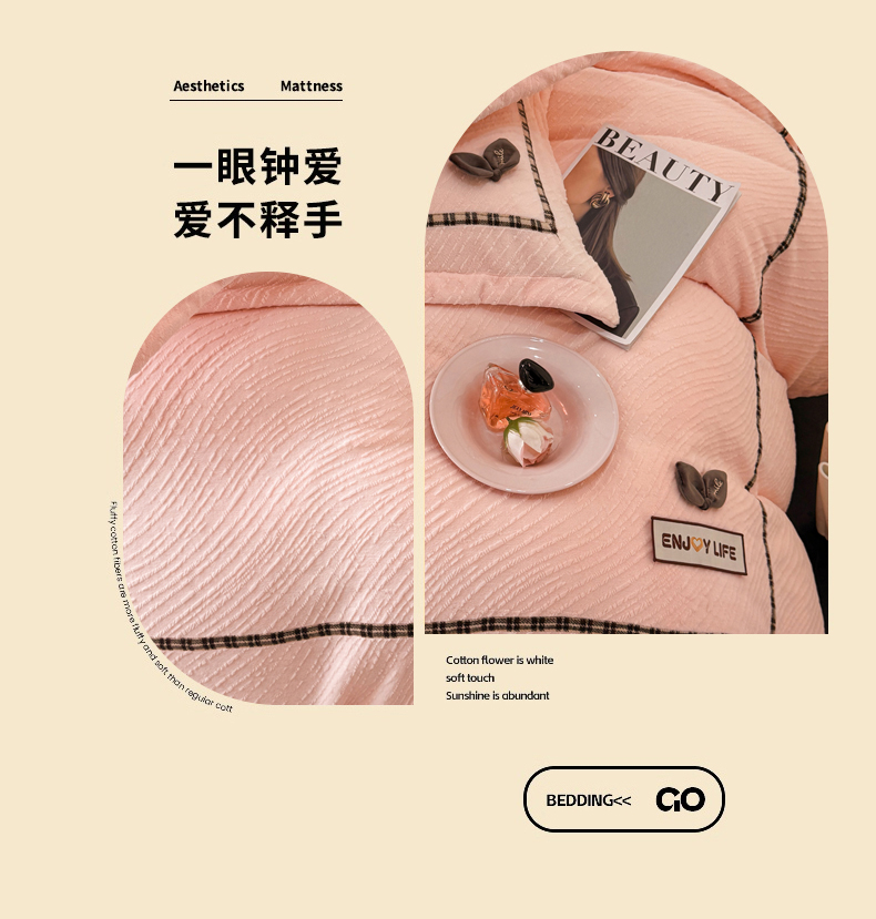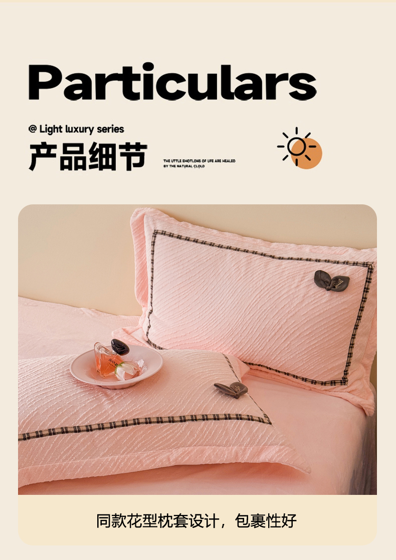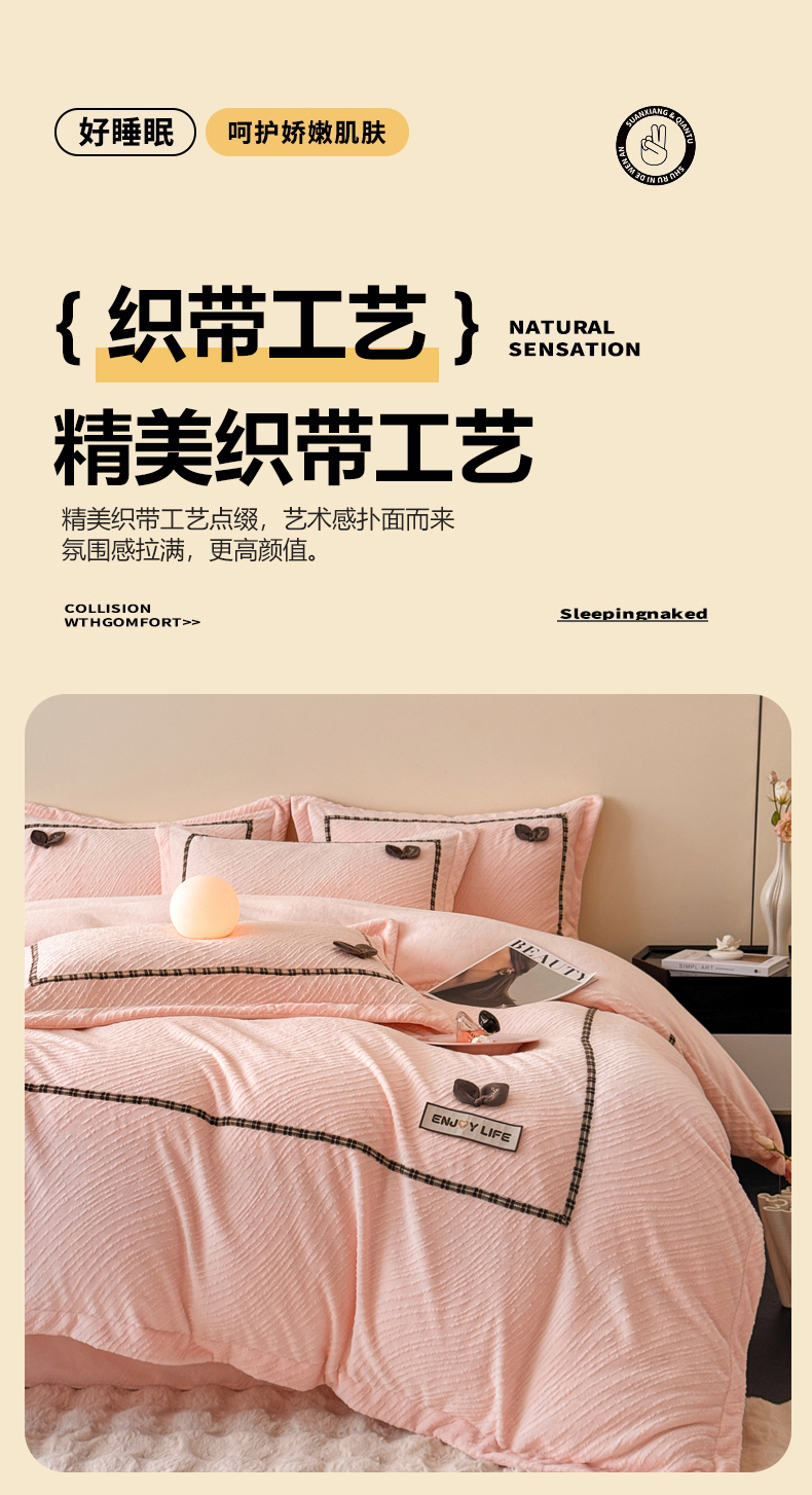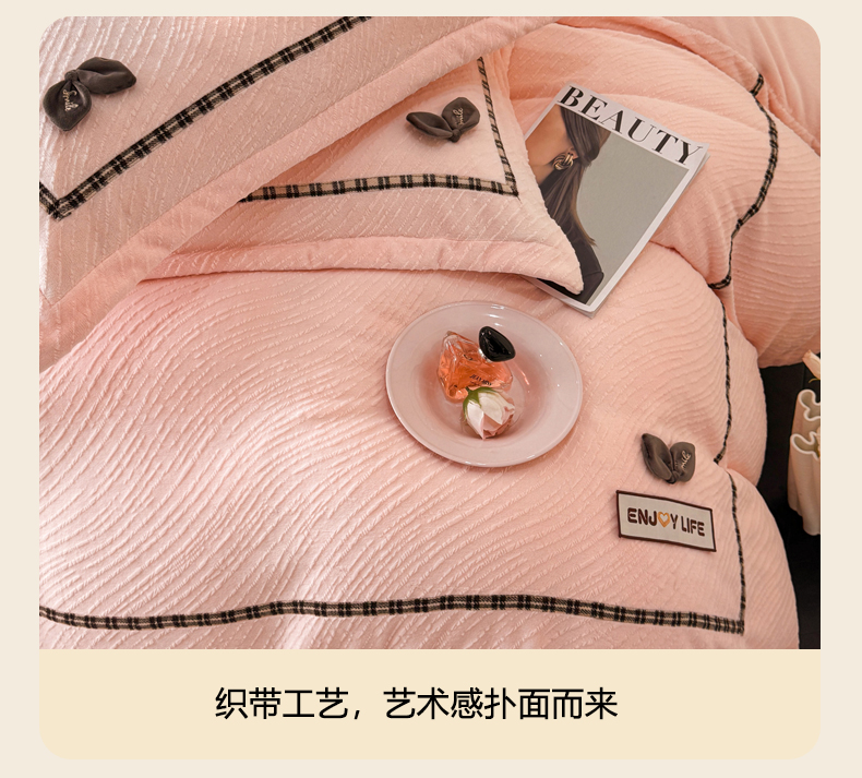 商品名称:慕木家纺 2025新款牛奶绒雕花织带款梦巢系列四件套 梦巢-玉粉