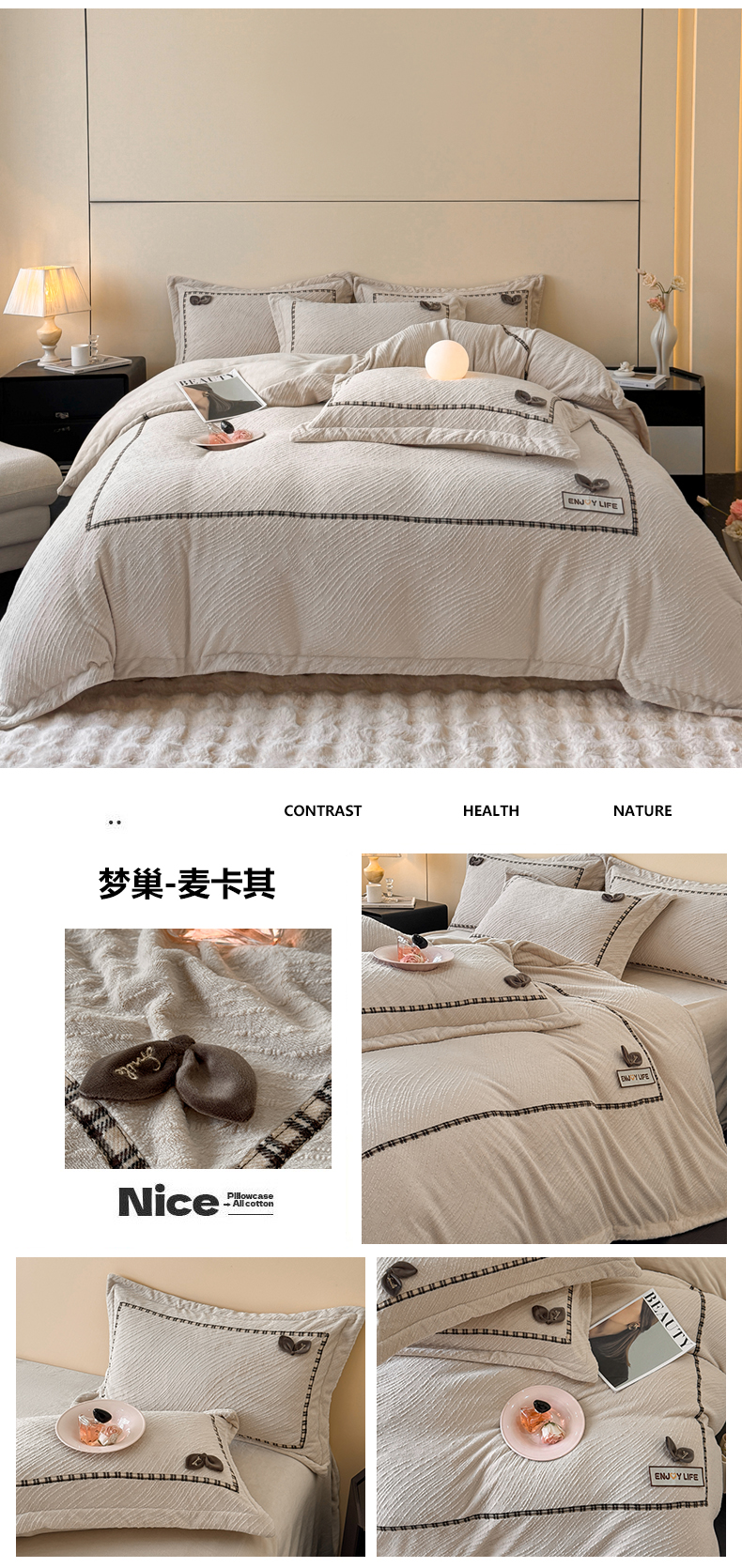 (总)慕木家纺 2025新款高克重简约无印风牛奶绒双拼四件套,宾利蓝+浅灰,米驼+奶茶咖,浅灰+米金,双拼套件-豆沙+灰