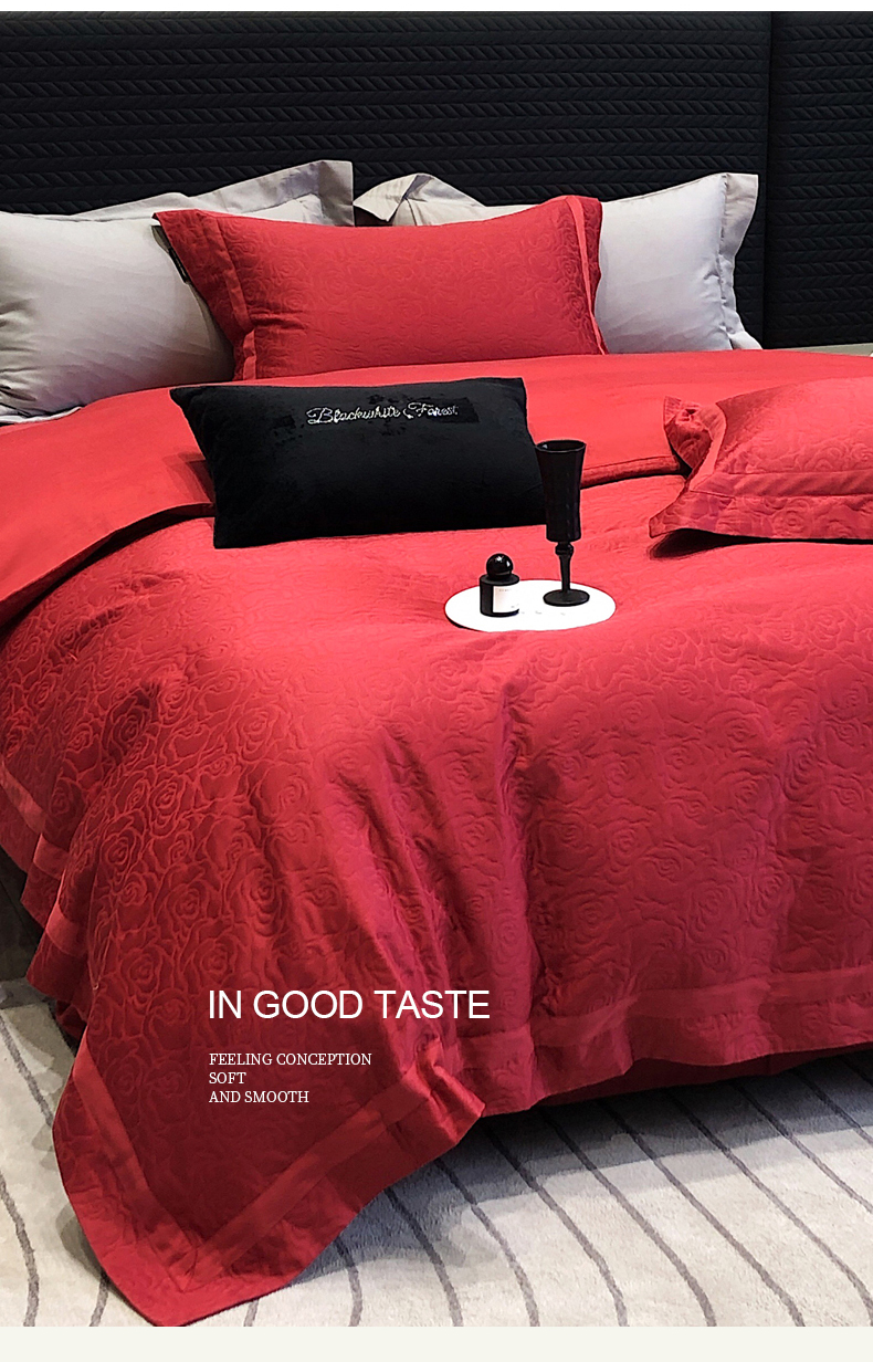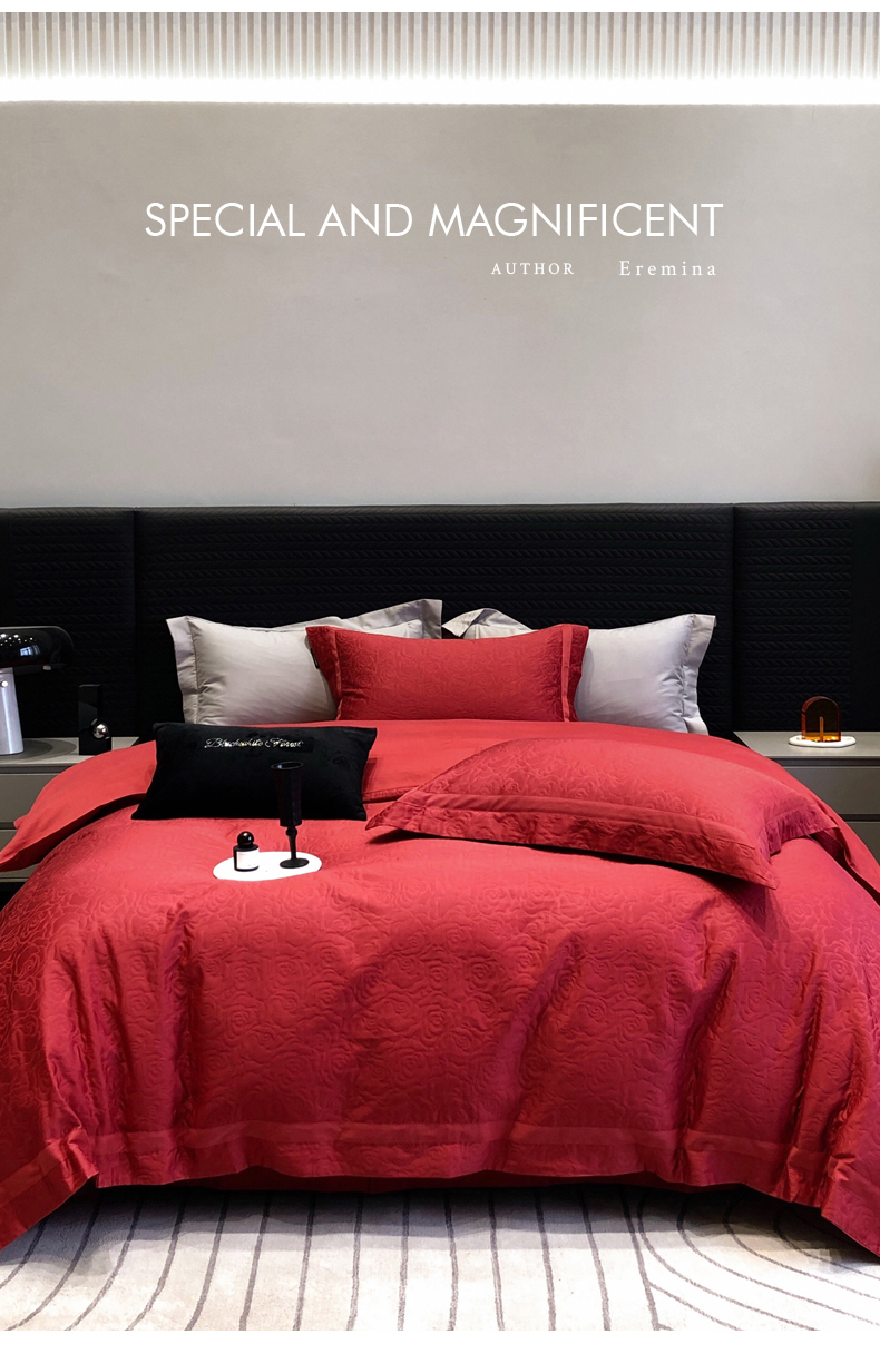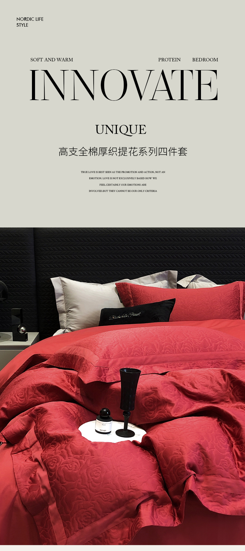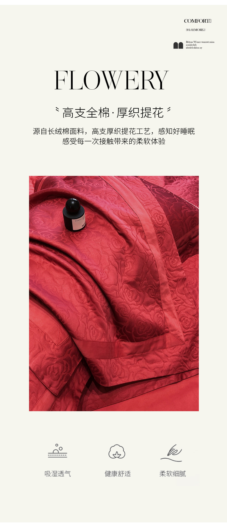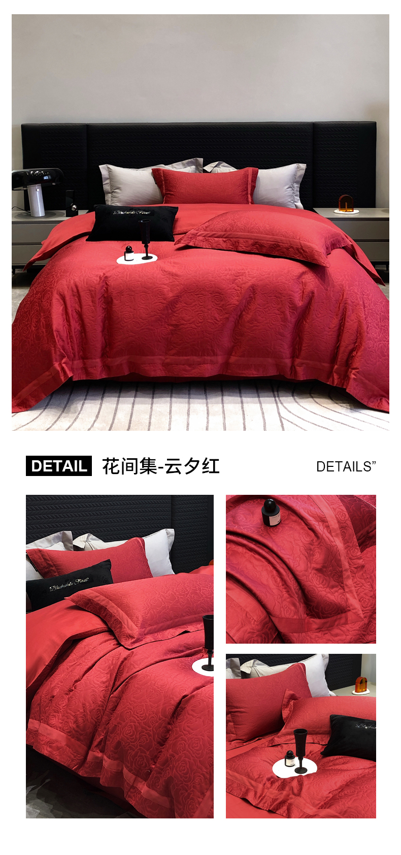商品名称:黑白森林 2025新款高支全棉厚织磨毛提花四件套-花间集 花间集-云夕红