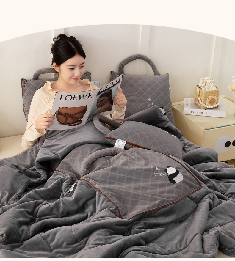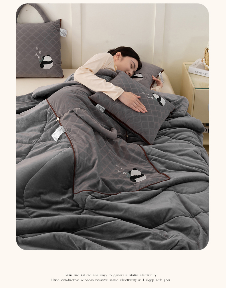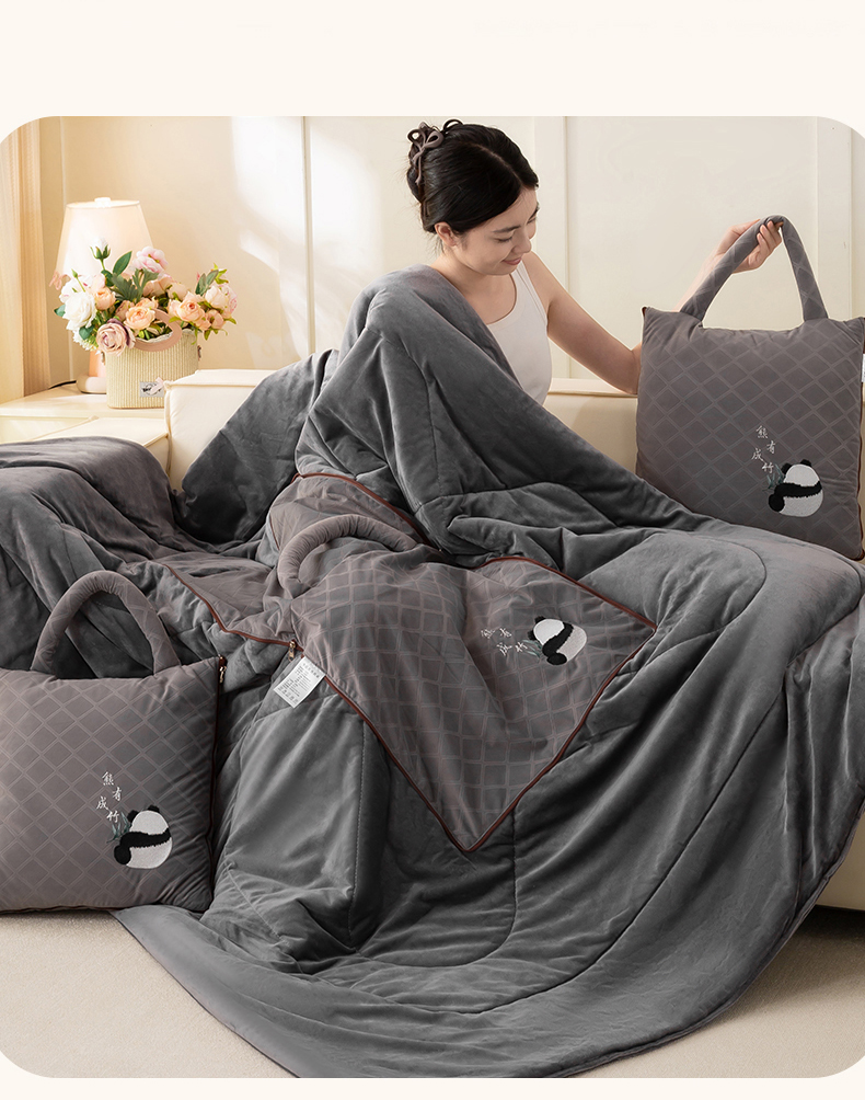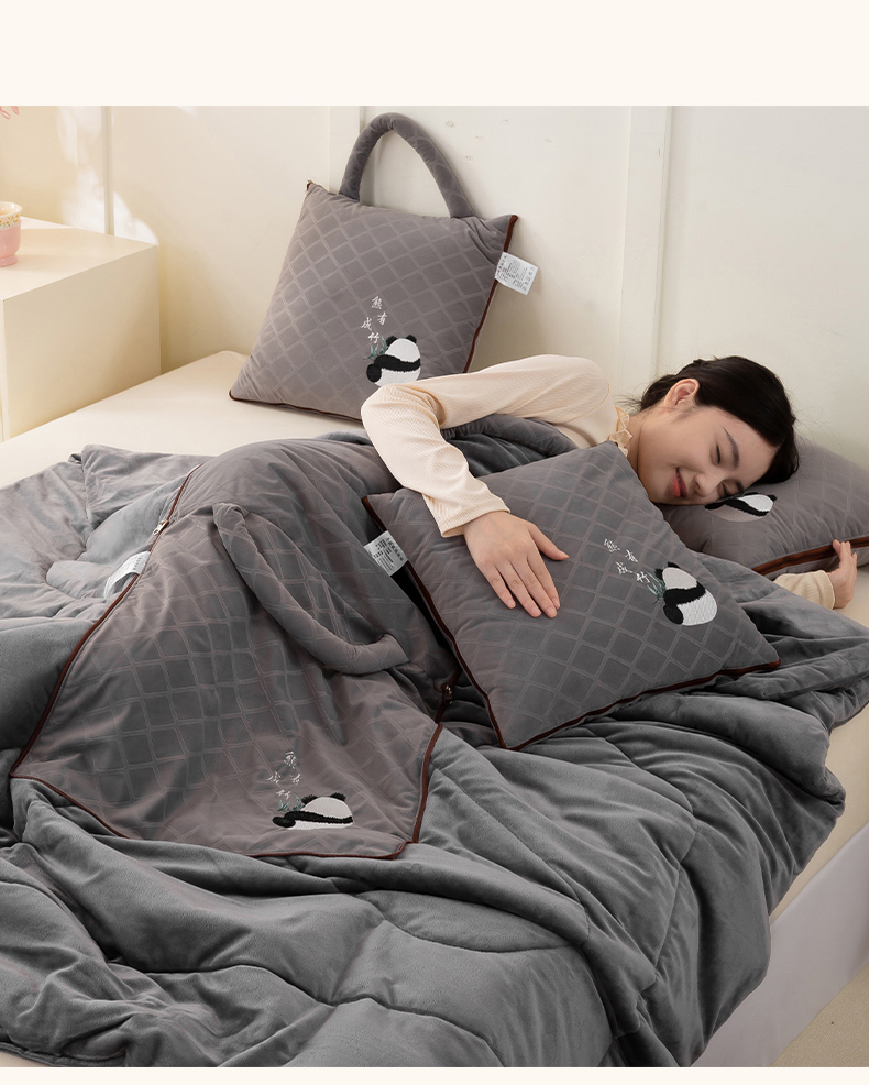 多今家纺 2025新款便携手提式水晶绒玛莎绒刺绣抱枕被子-熊有成竹系列 熊有成竹-石岩灰