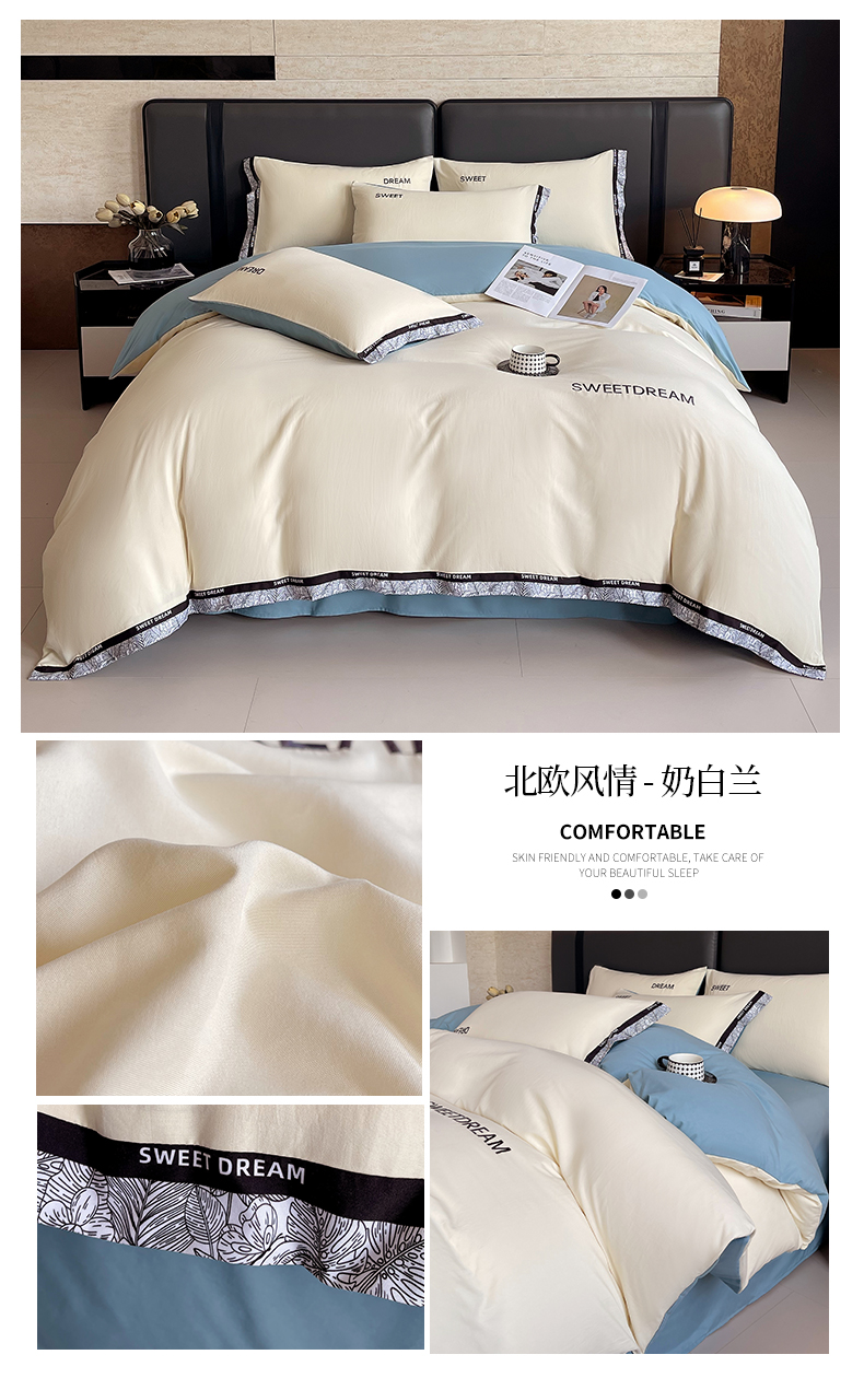 商品名称:大麦乐田 2025新款法式轻奢碳素刺绣磨毛四件套-北欧风情 北欧风情 奶白咖