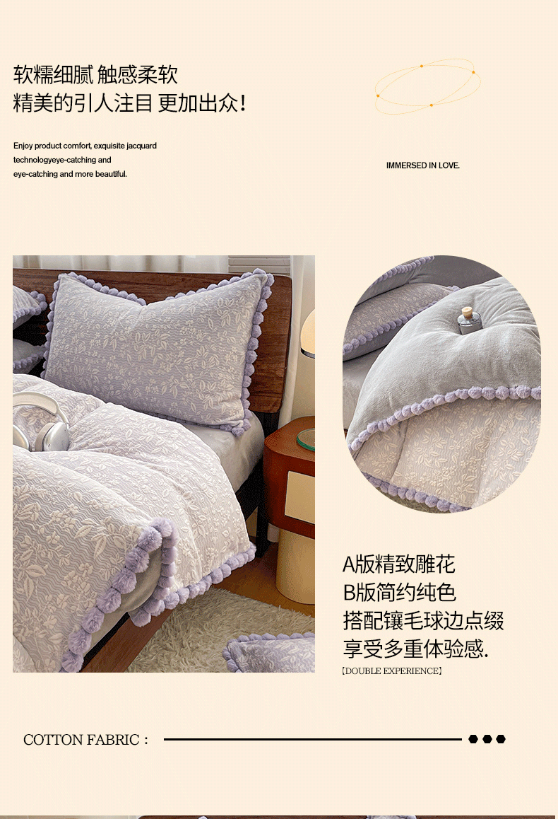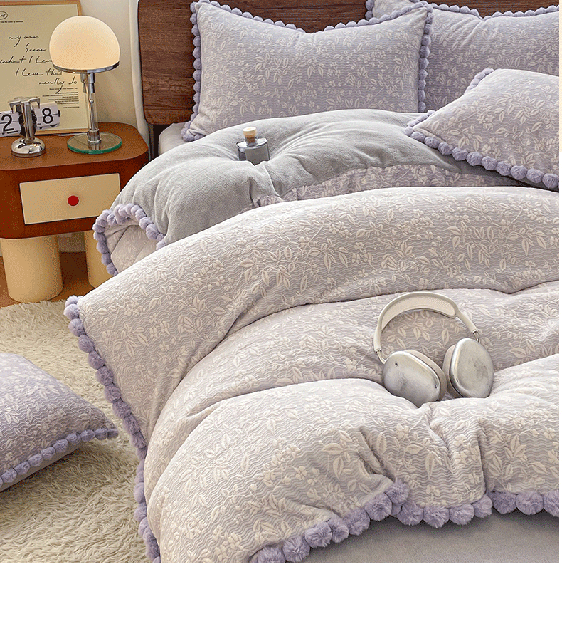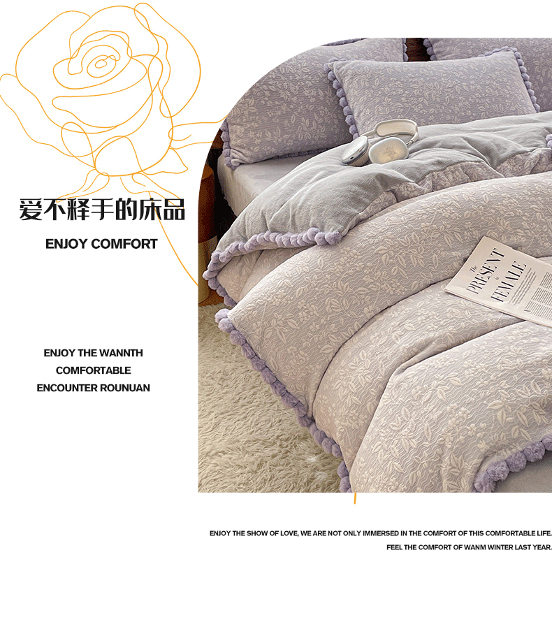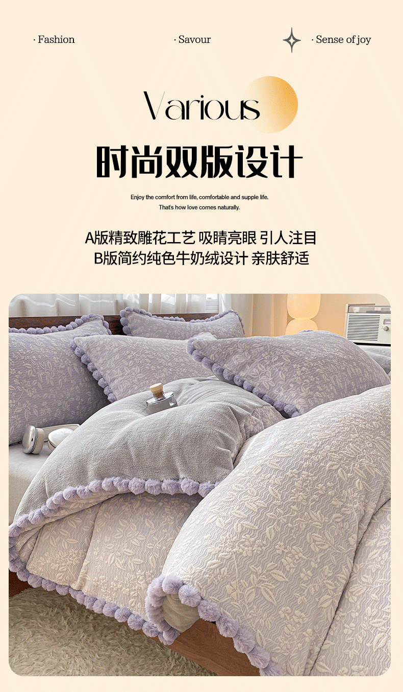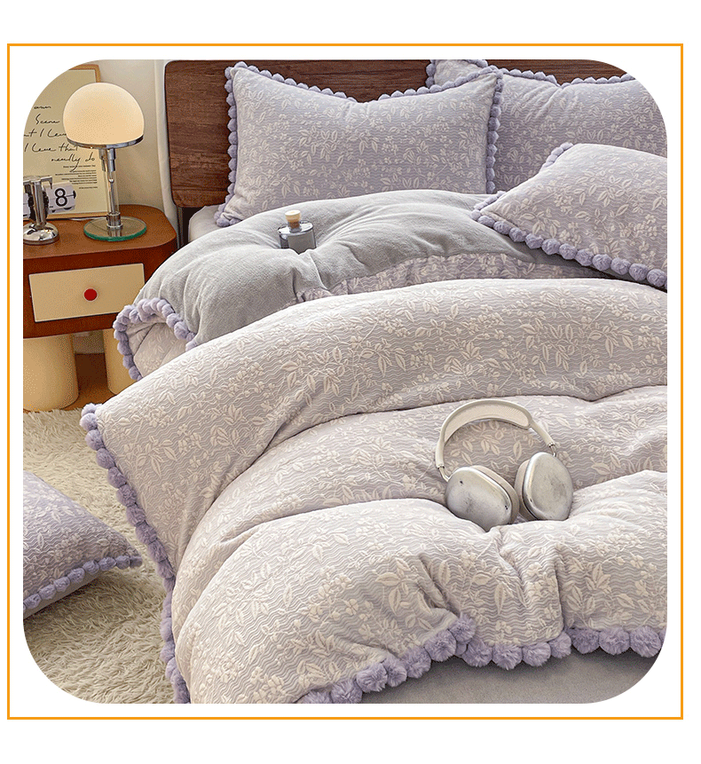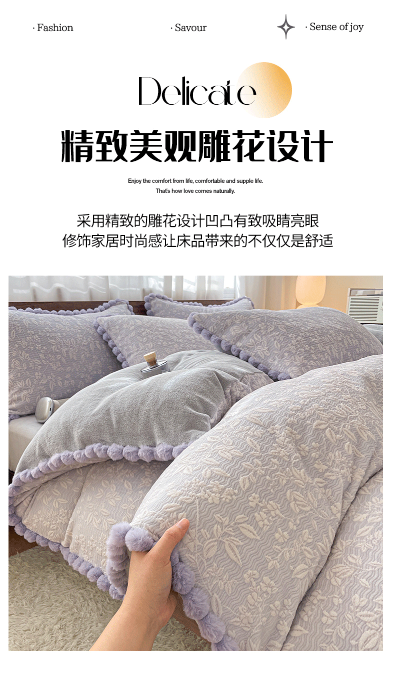 商品名称:羚羊语家纺 2025新款230克全消光雕花绒牛奶绒兔毛球四件套轻奢风立体着色烂花牛奶绒提花加厚保暖床单床笠三件套 蜜绒绒-星云紫