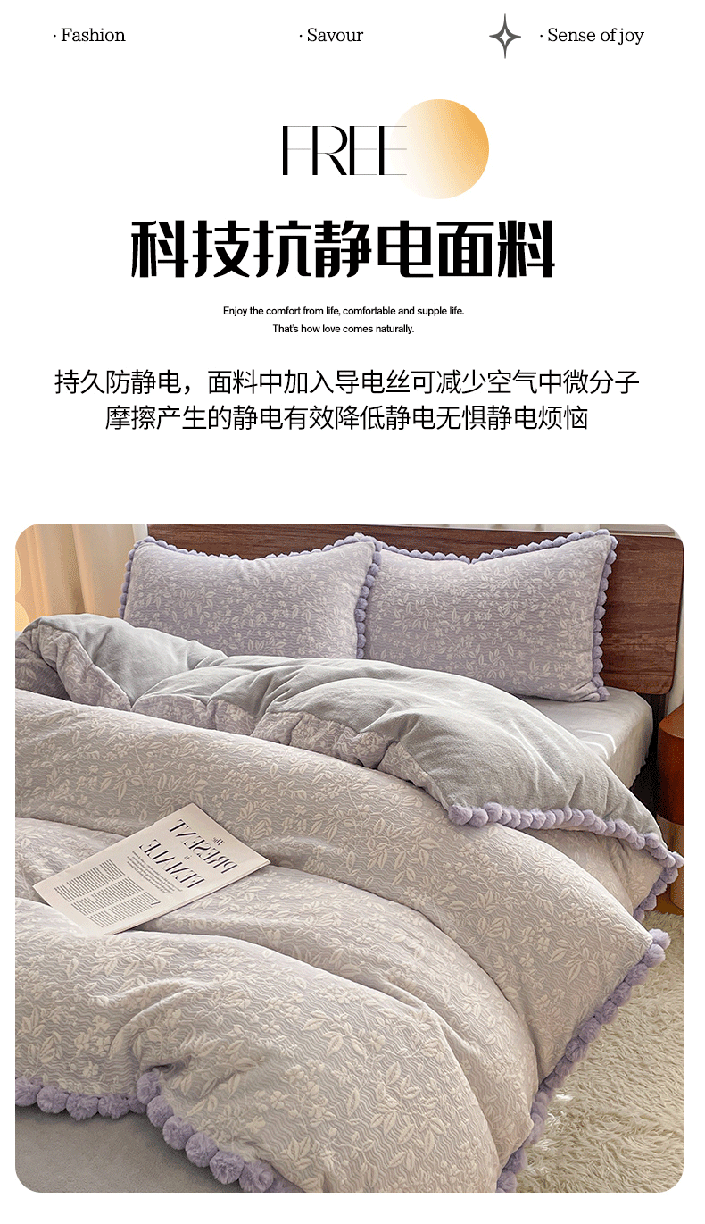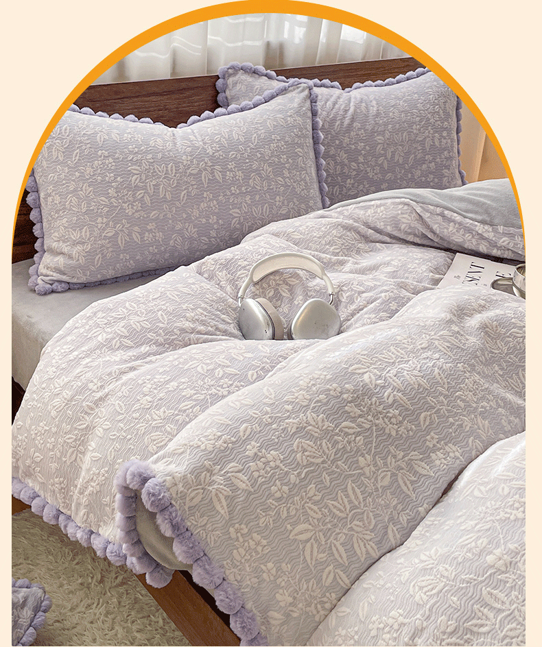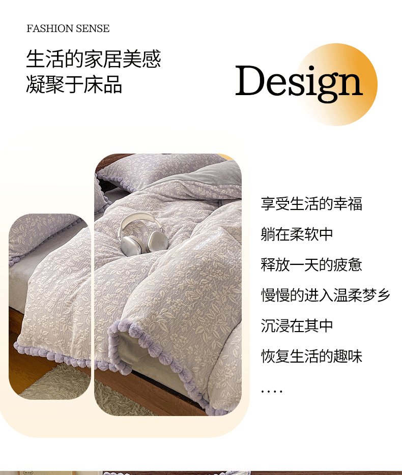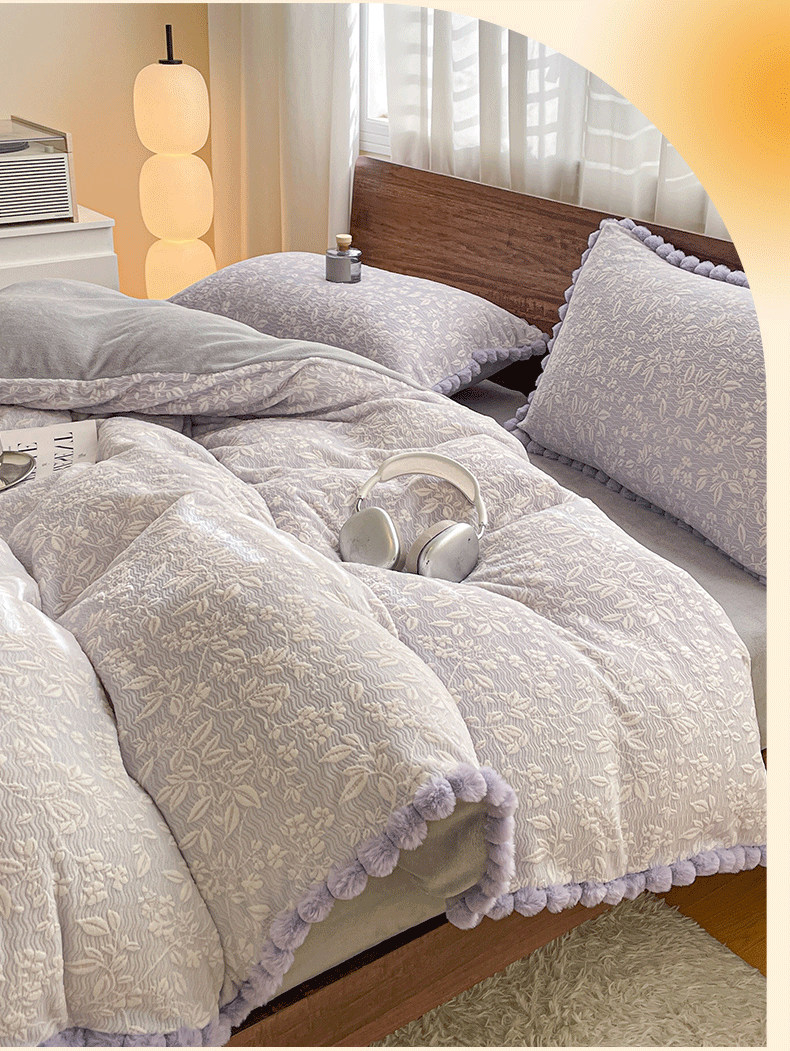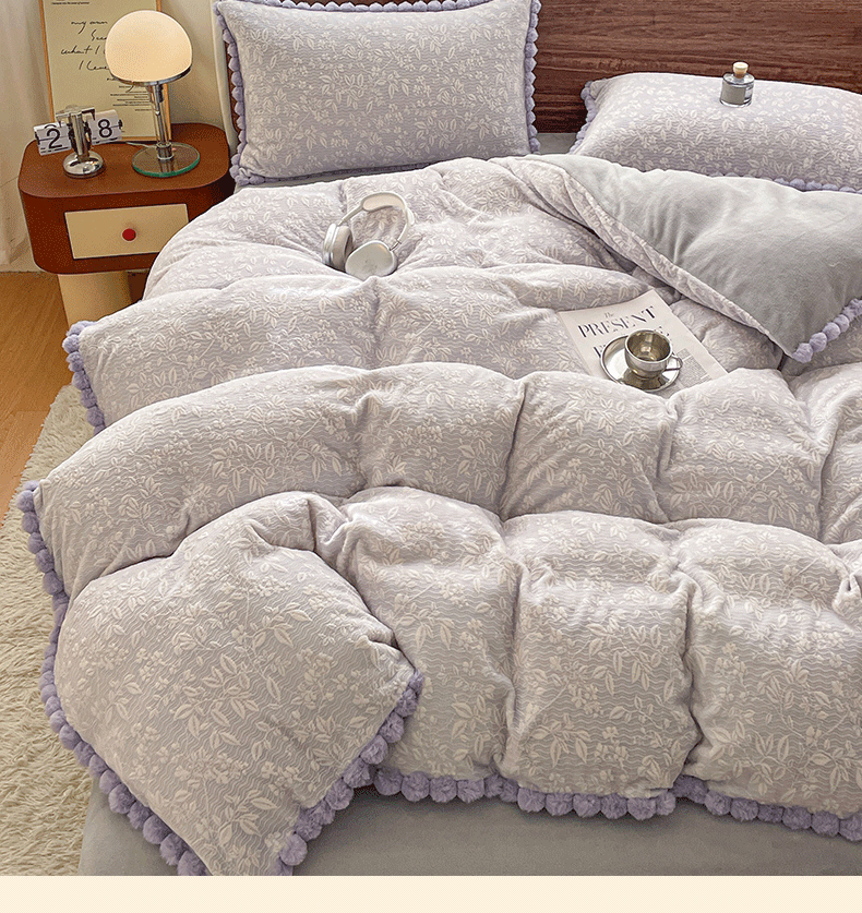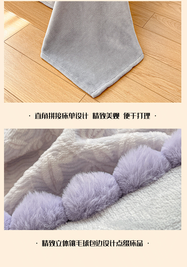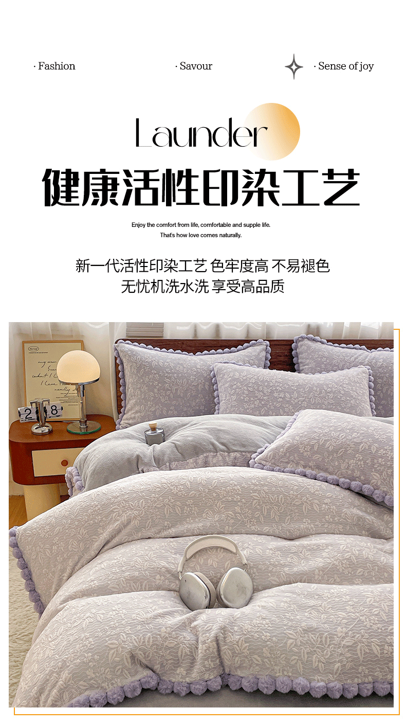 商品名称:羚羊语家纺 2025新款230克全消光雕花绒牛奶绒兔毛球四件套轻奢风立体着色烂花牛奶绒提花加厚保暖床单床笠三件套 蜜绒绒-星云紫