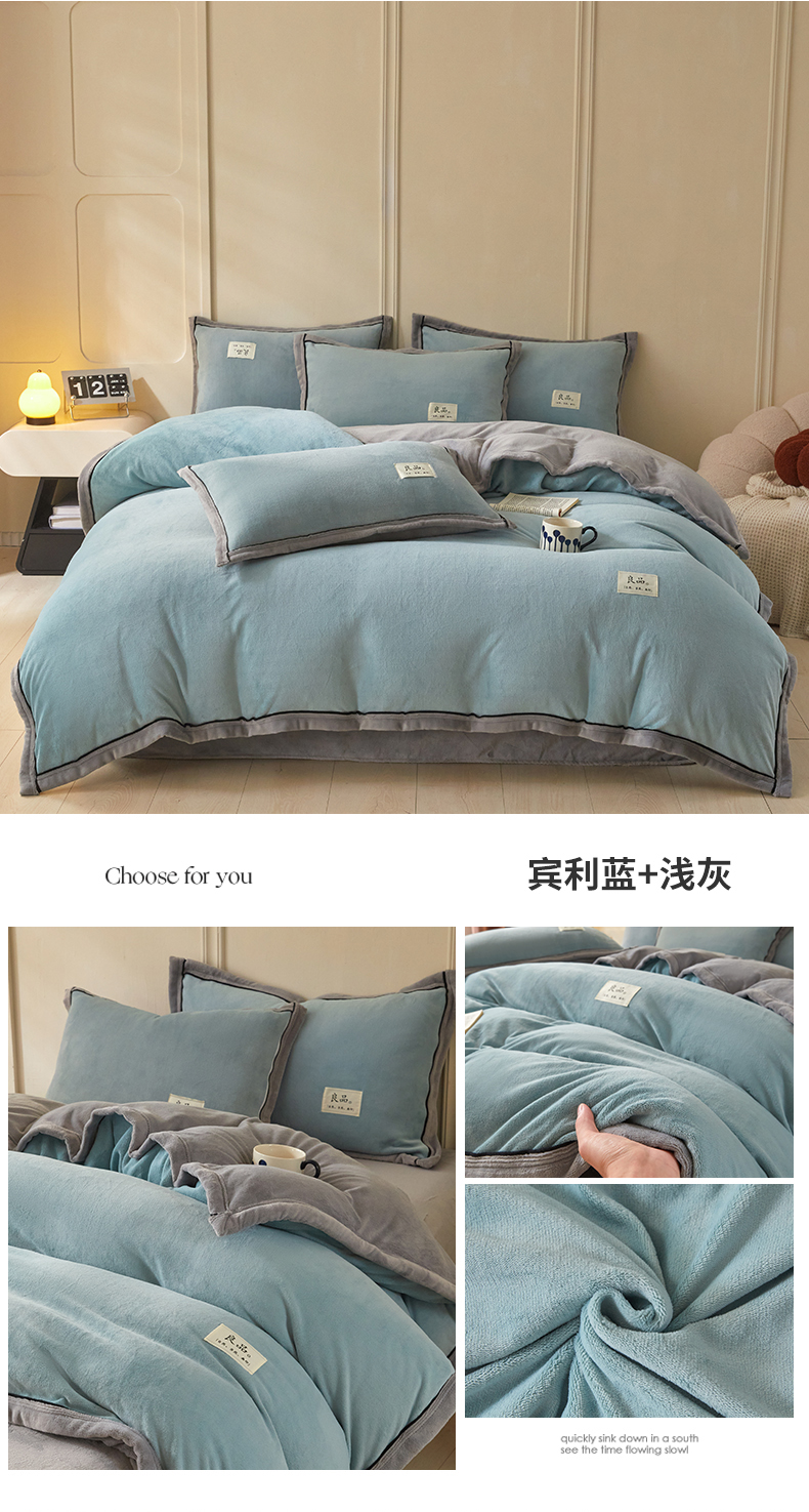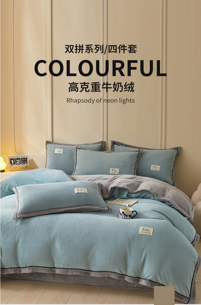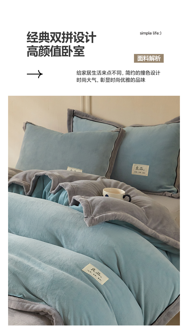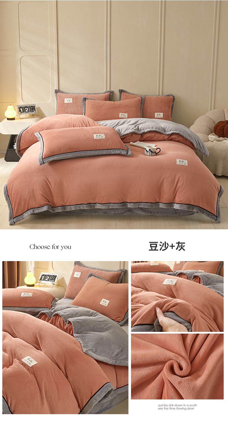 (总)慕木家纺 2025新款高克重简约无印风牛奶绒双拼四件套,宾利蓝+浅灰,米驼+奶茶咖,浅灰+米金,双拼套件-豆沙+灰