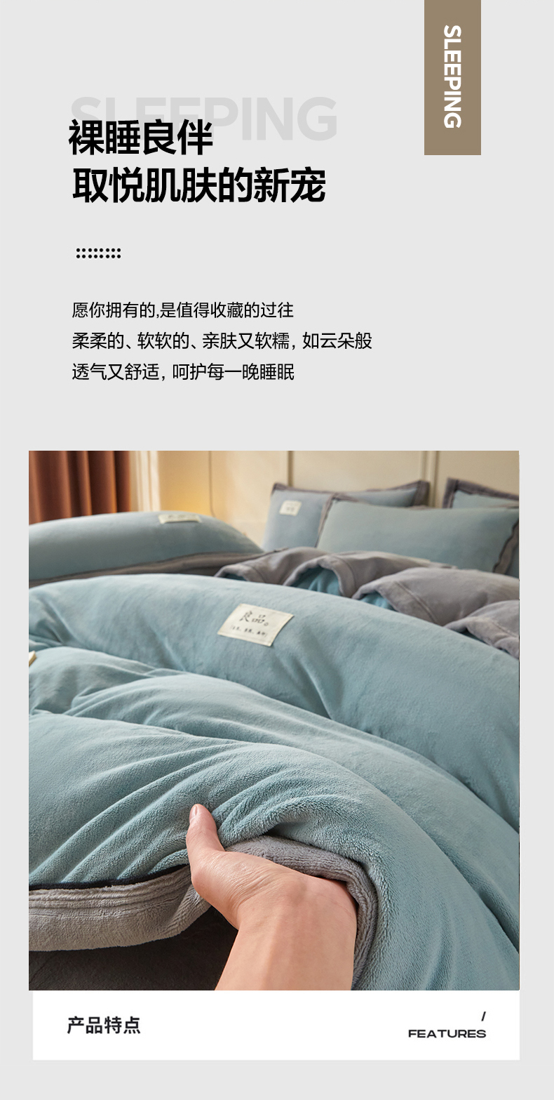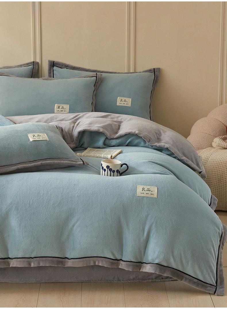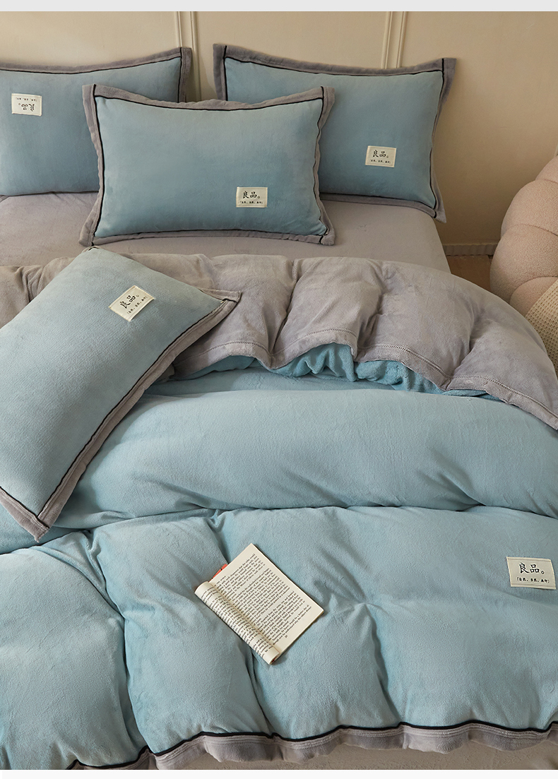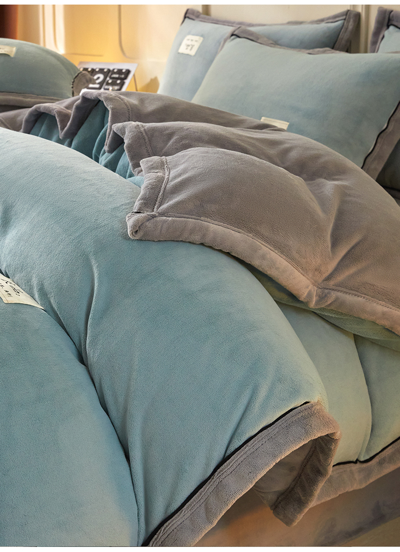 (总)慕木家纺 2025新款高克重简约无印风牛奶绒双拼四件套,宾利蓝+浅灰,米驼+奶茶咖,浅灰+米金,双拼套件-豆沙+灰