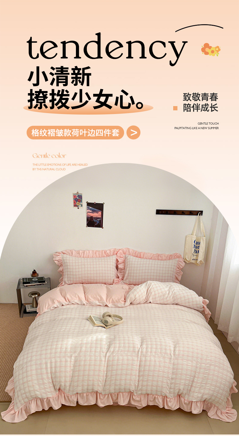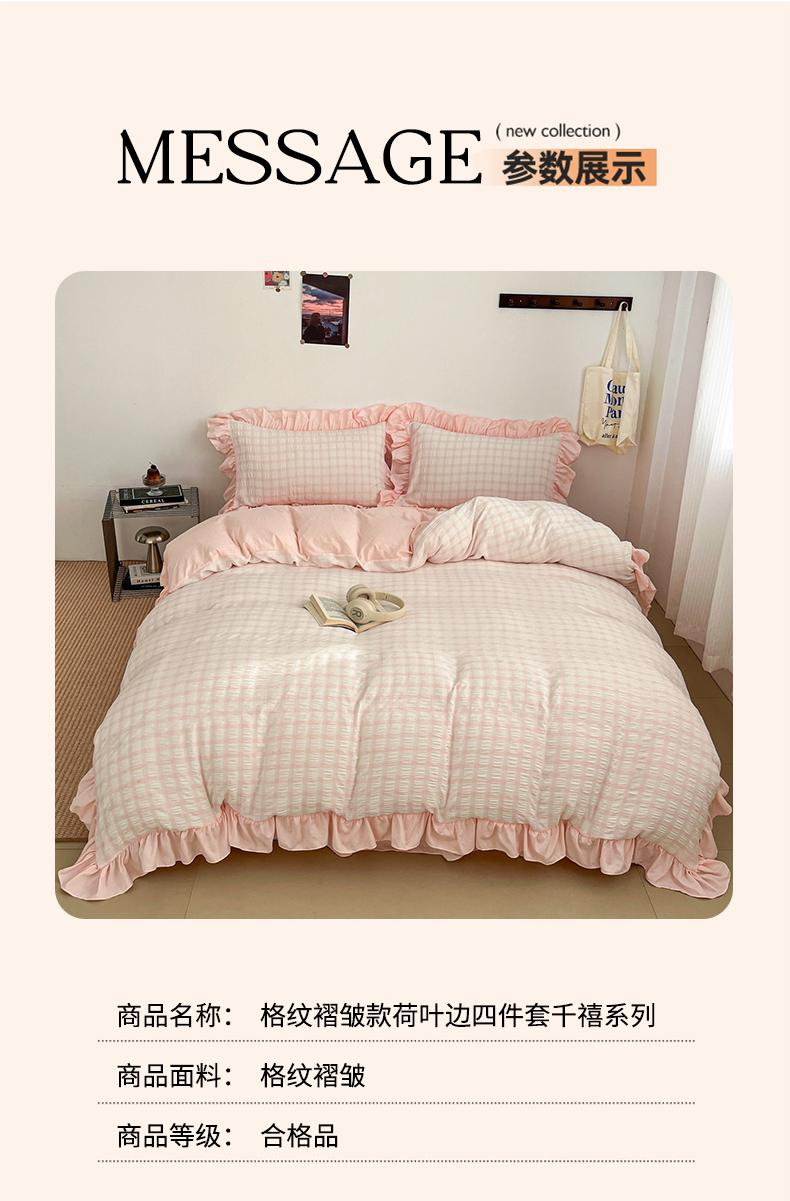 商品名称:乐卧家居 2026新款韩系千禧梦核复古回潮少女感格纹褶皱款荷叶边四件套 千禧-芍药粉