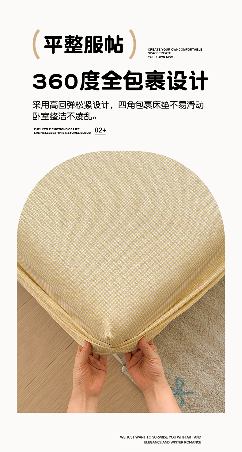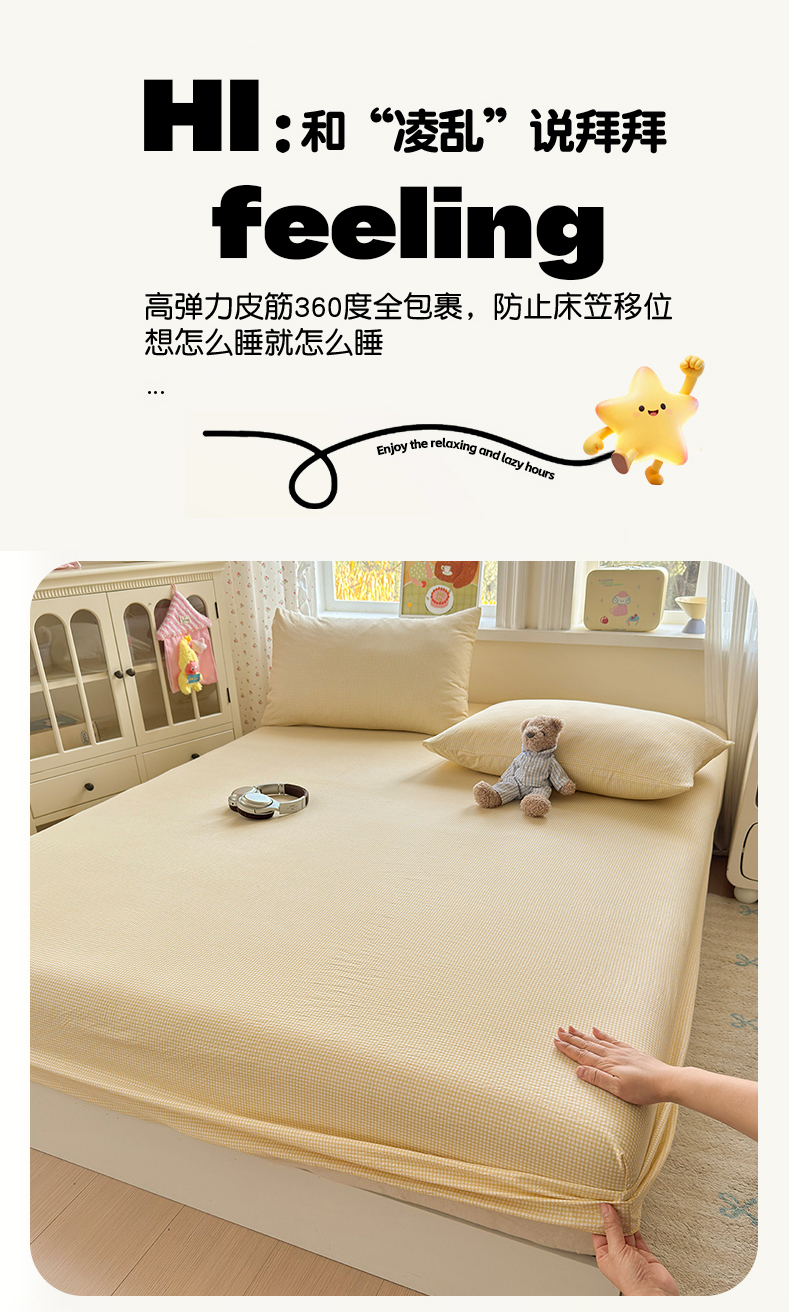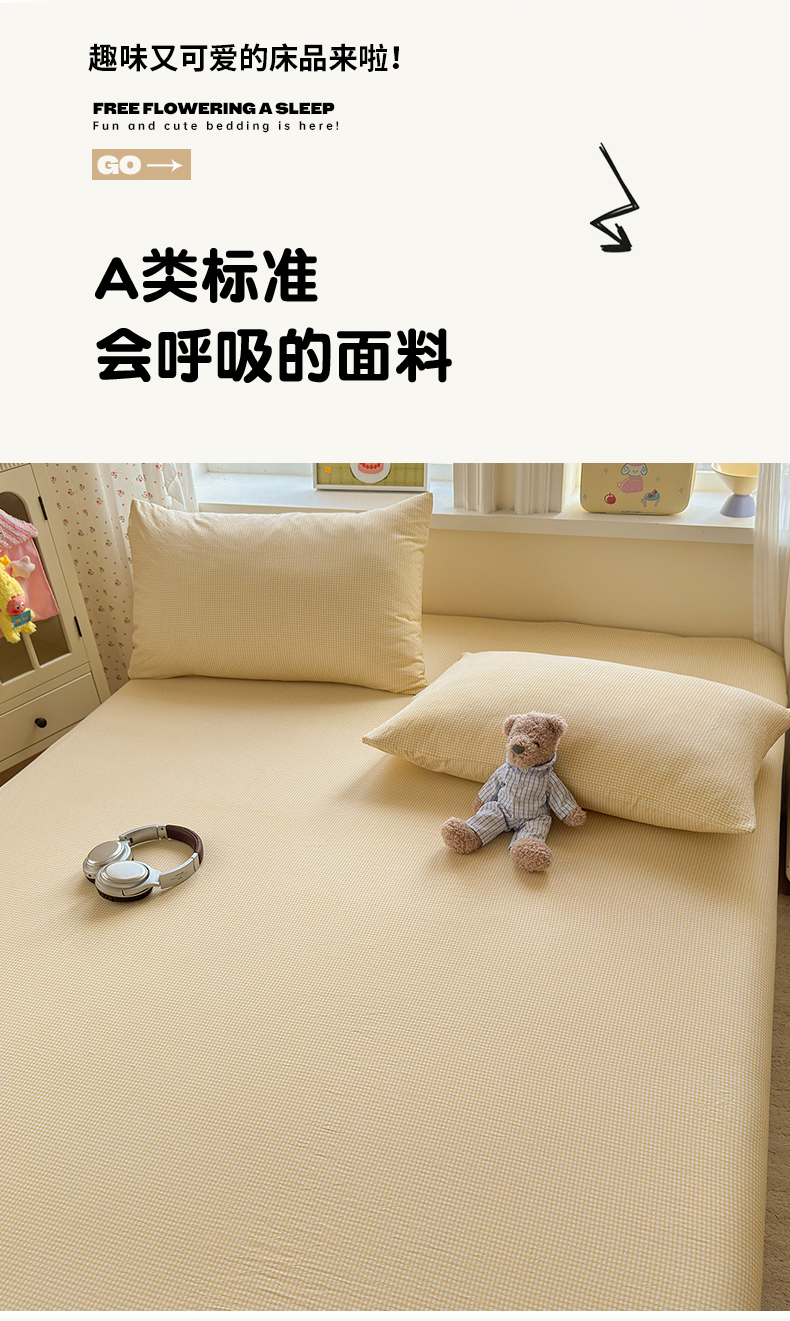 • 91家纺网 家纺一手货源 找家纺 沐芷 2026 【提供买家秀】古法水洗仿棉床笠席梦思床罩床垫防滑床套罩床笠三件套 迷你格-黄