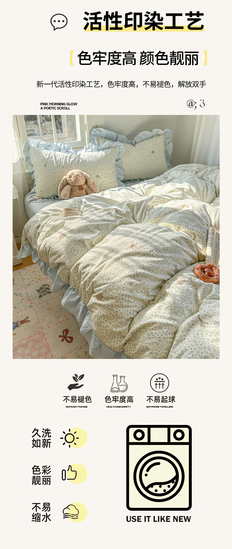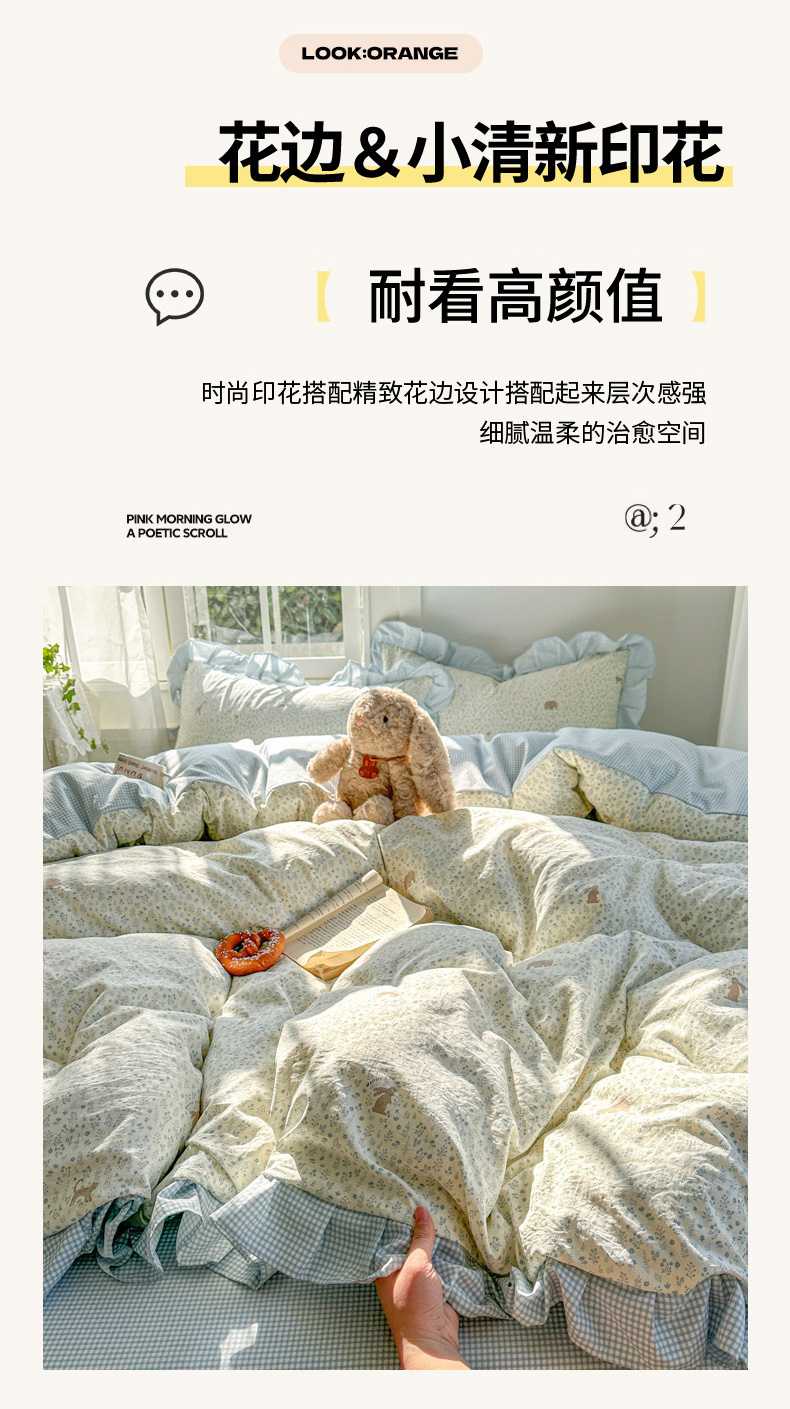 商品名称:柒月家居 2026新款韩系仿棉小格花边四件套 萌物