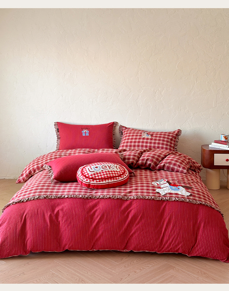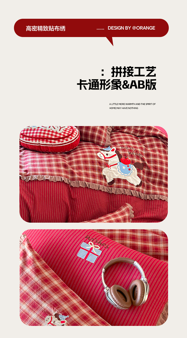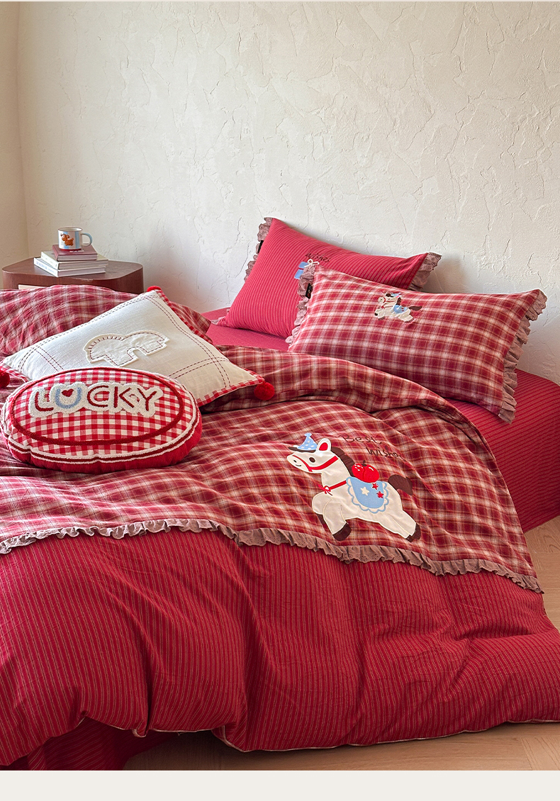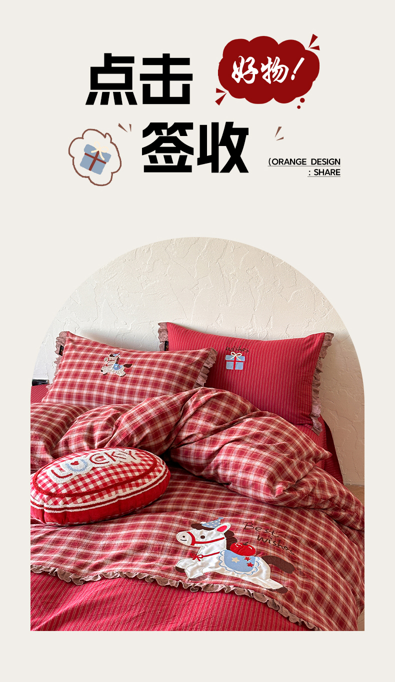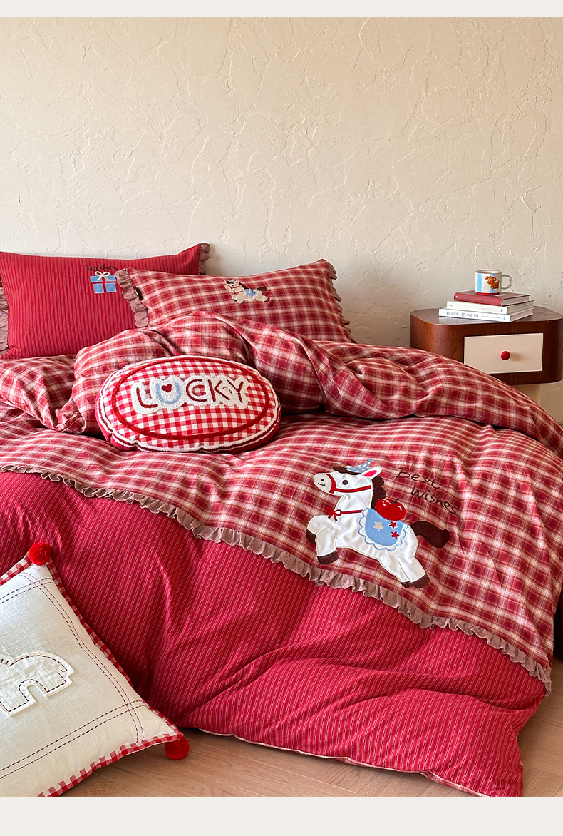 当前位置: 91家纺网 > 商品网购 > 床品套件 > 四件套 > 全棉普通四件套 > RYB红黄兰 2026新款设计师原创全棉色织水洗棉贴布绣三件套四件套 幸福加马