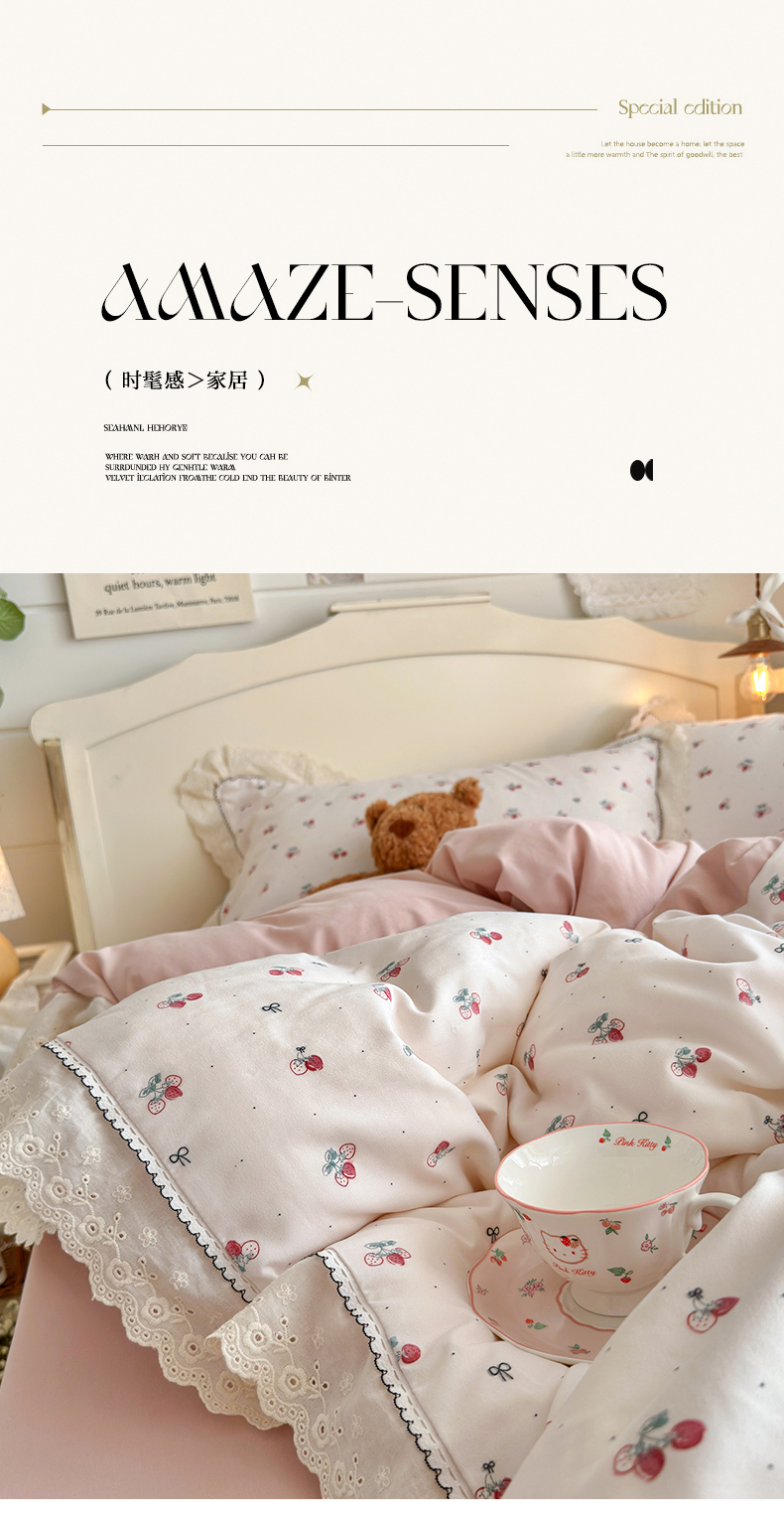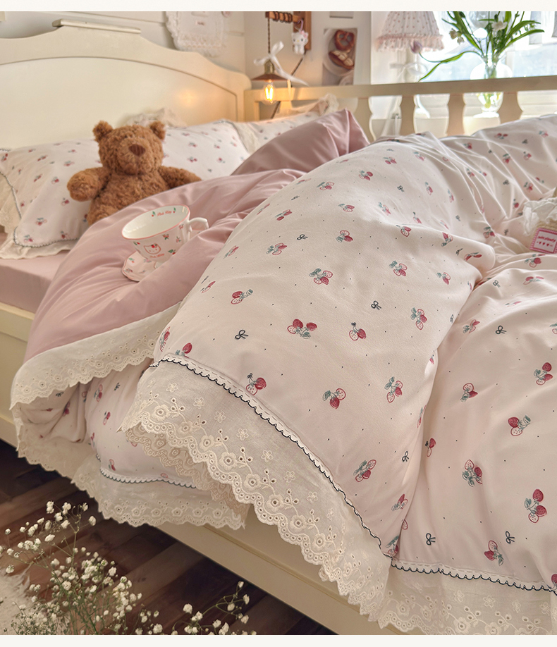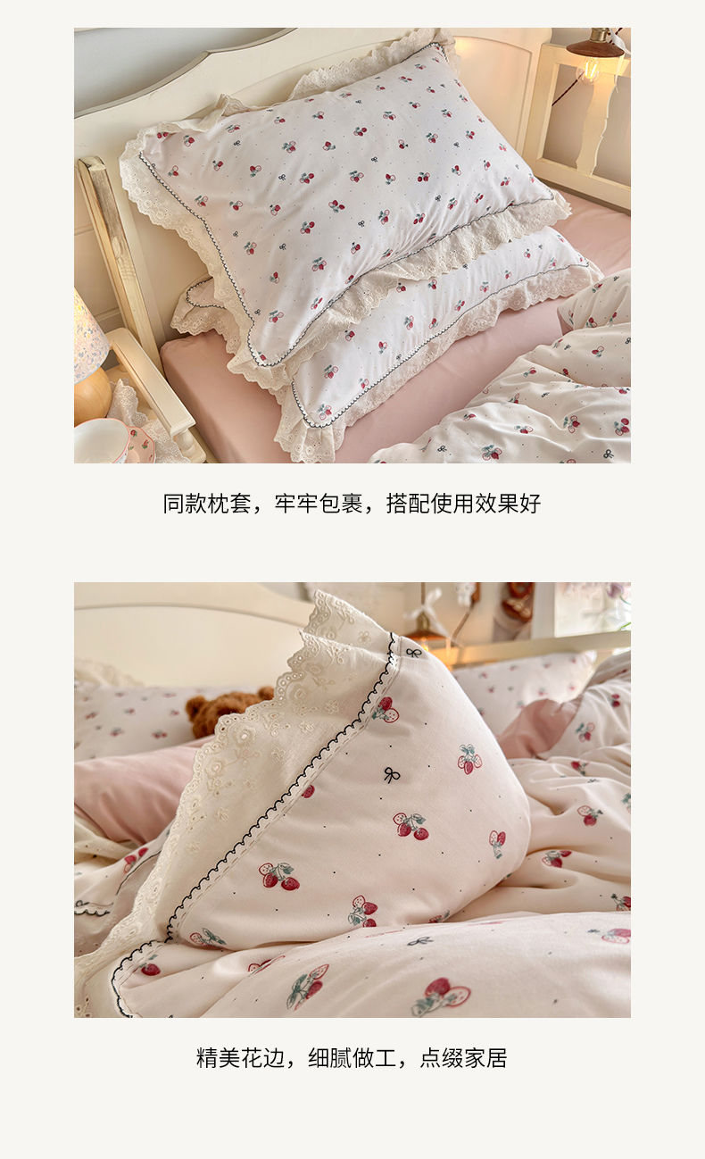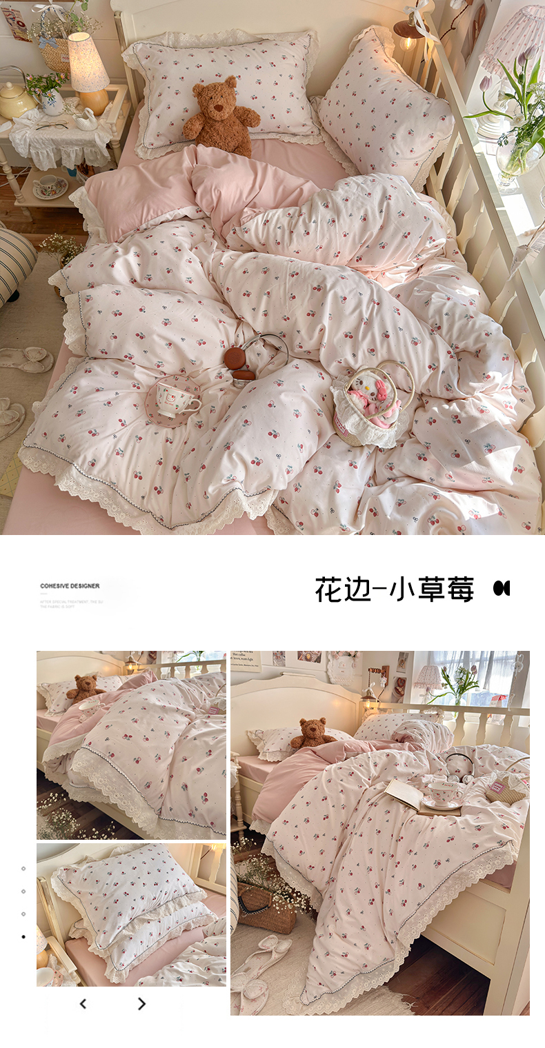 当前位置: 91家纺网 > 商品网购 > 床品套件 > 四件套 > 其它四件套 > 海岛哥哥 2026新款仿棉云柔纱韩版双花边四件套 花边-小草莓