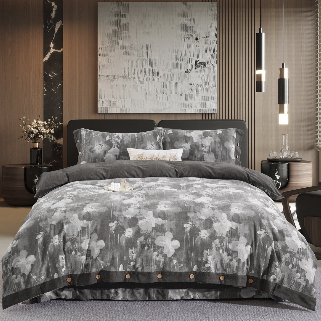 商品名称:(总)仰望棉麻双层纱供应链 2026新款全棉色织提花纽扣款四件套-花都