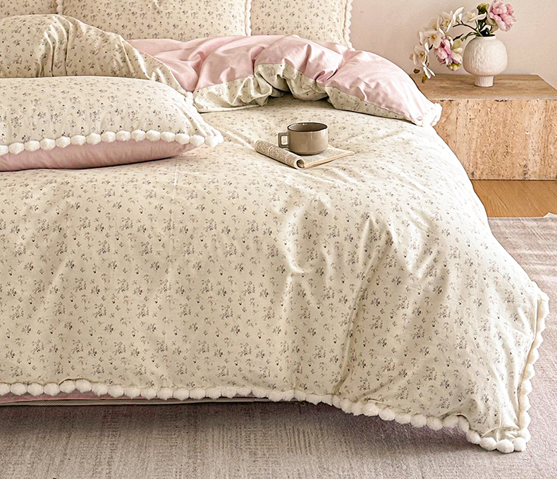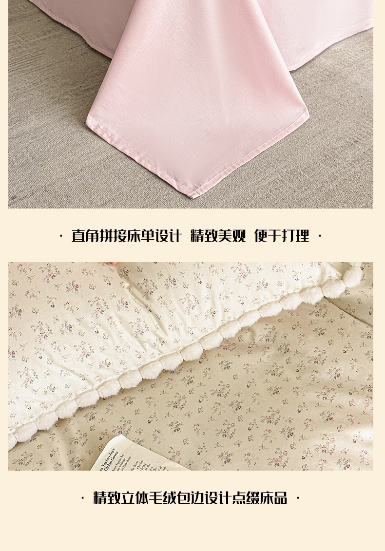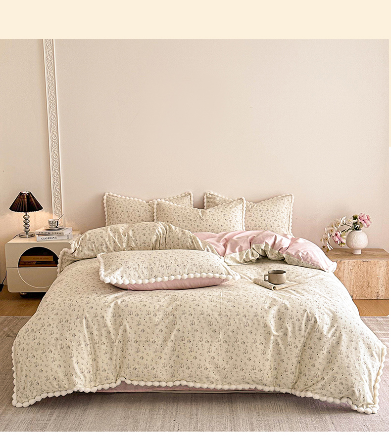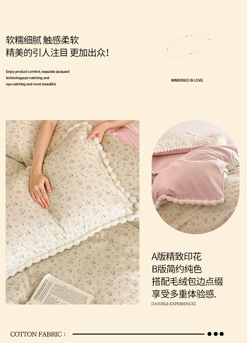 商品名称:羚羊语家纺 2026新款全棉毛球款四件套40支纯棉轻奢13372小清新喷气印花四件套被套床单床笠三件套 伊旬粉