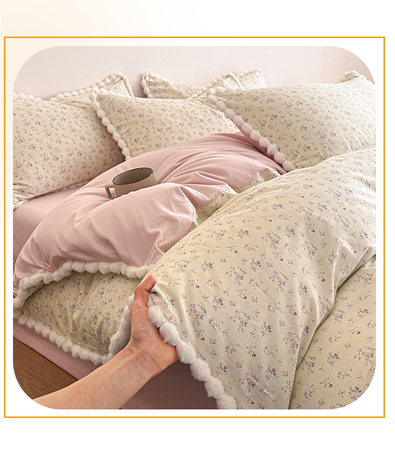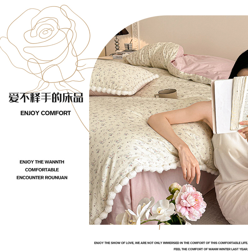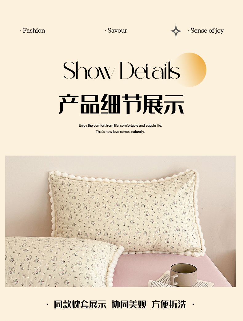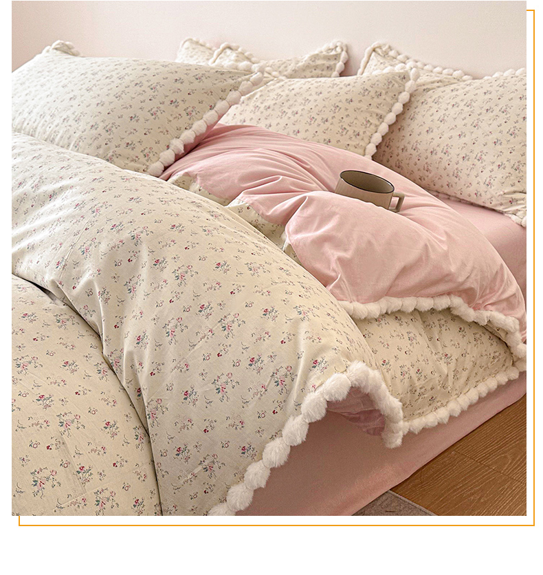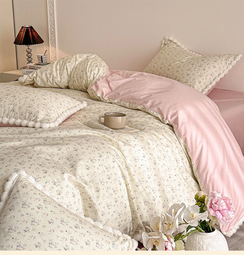 商品名称:羚羊语家纺 2026新款全棉毛球款四件套40支纯棉轻奢13372小清新喷气印花四件套被套床单床笠三件套 伊旬粉