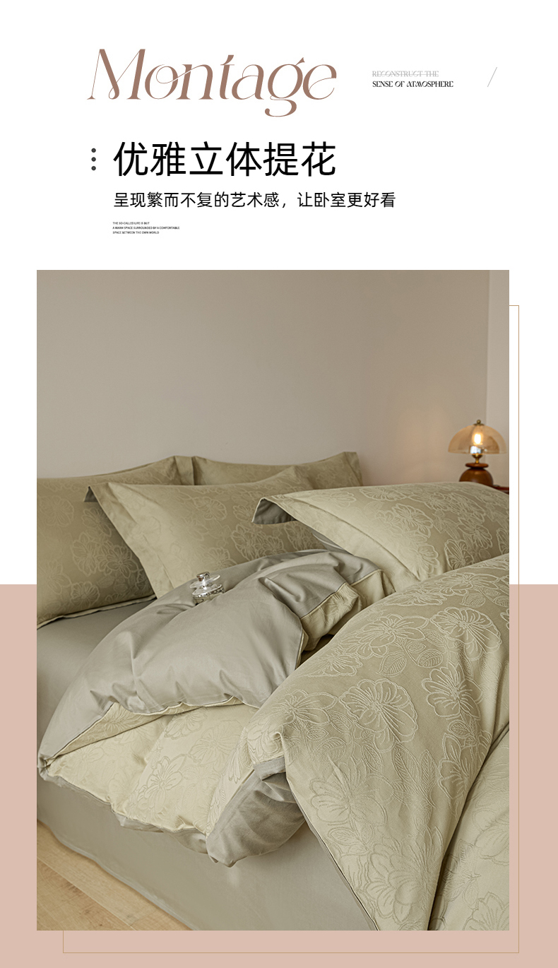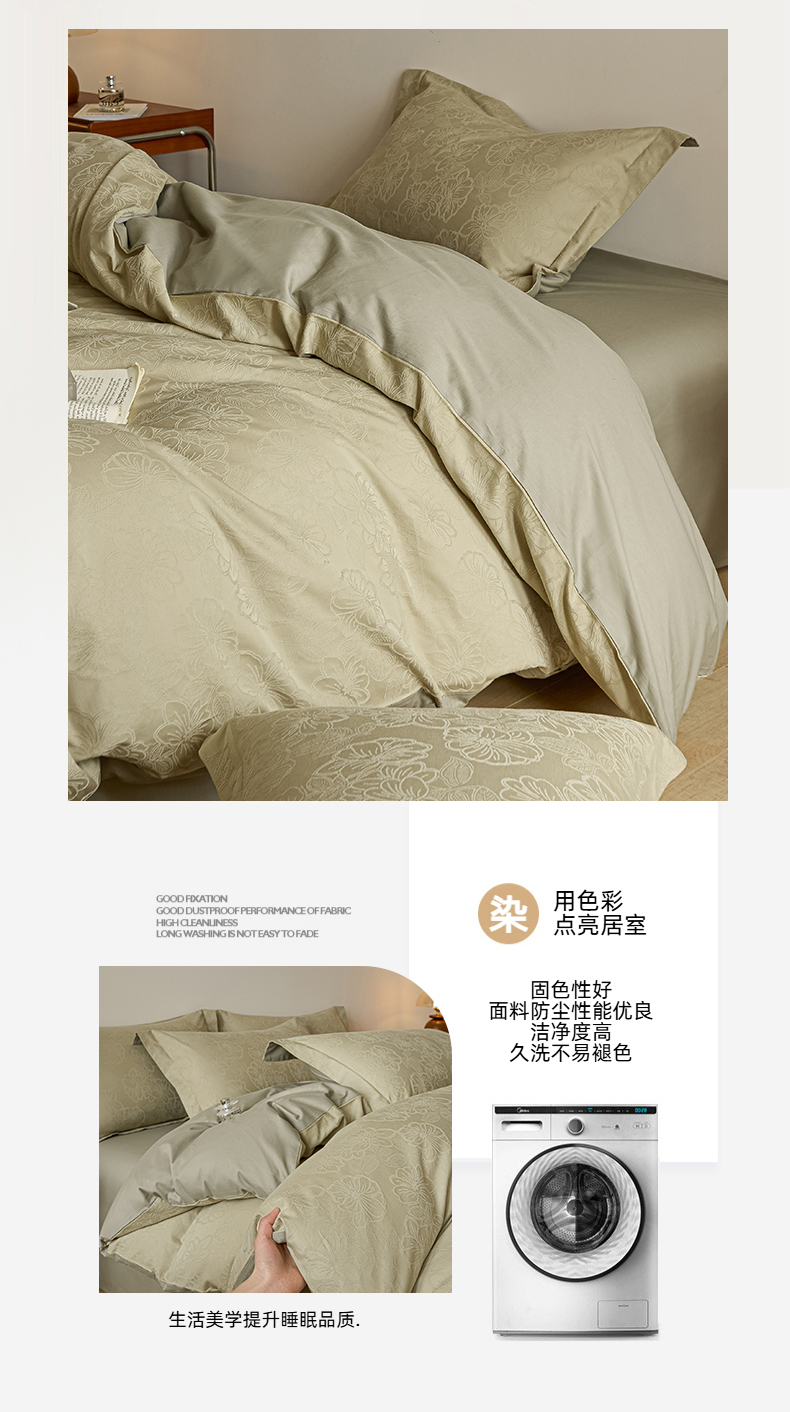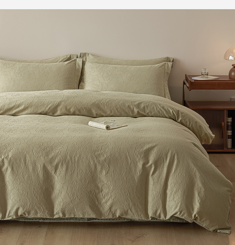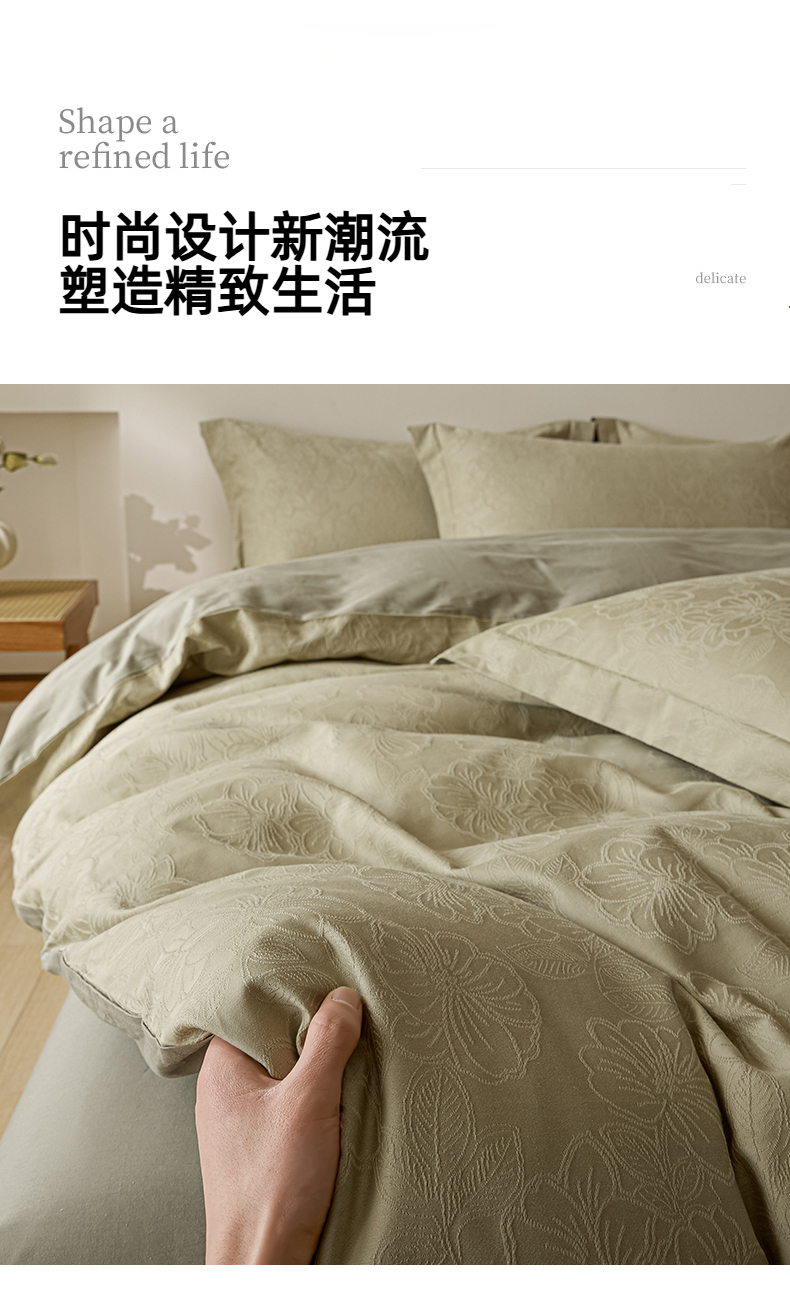 当前位置: 91家纺网 > 商品网购 > 床品套件 > 四件套 > 全棉普通四件套 > 禾时 2026春夏新品全棉立体浮雕提花双拼色四件套-繁花 奶绿-浅绿灰