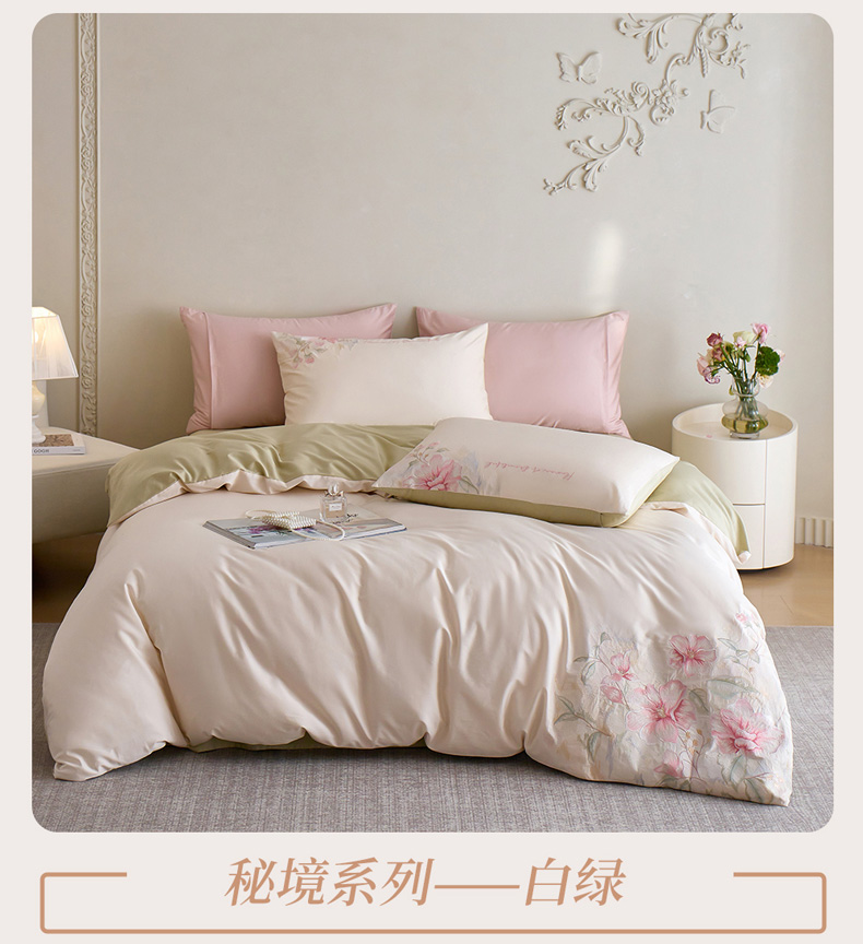 (总)爱缦 2026新款100S全棉CR工艺极简轻奢刺绣四件套-秘境系列(券后控价:标准318,大号338),白粉色,白绿,粉色,浅蓝