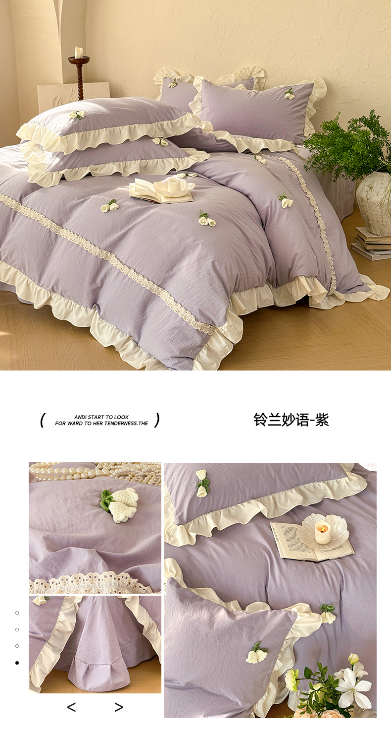 商品名称:庭笙 2026新款古法水洗棉感法式立体花韩版花边四件套-铃兰妙语 铃兰妙语-紫