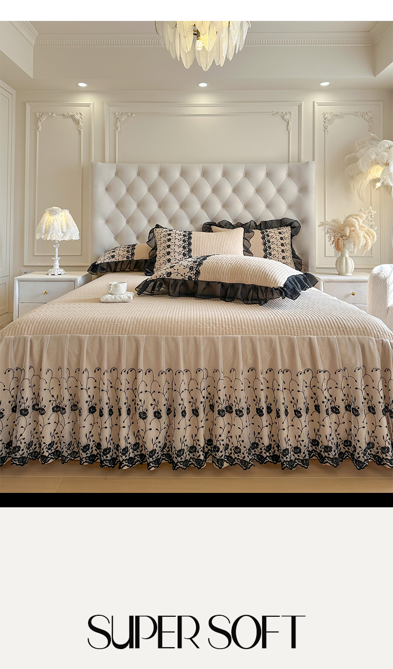 瑞宝 2026新款泡芙棉花边床裙三件套-南法玫瑰 南法玫瑰-奶茶色