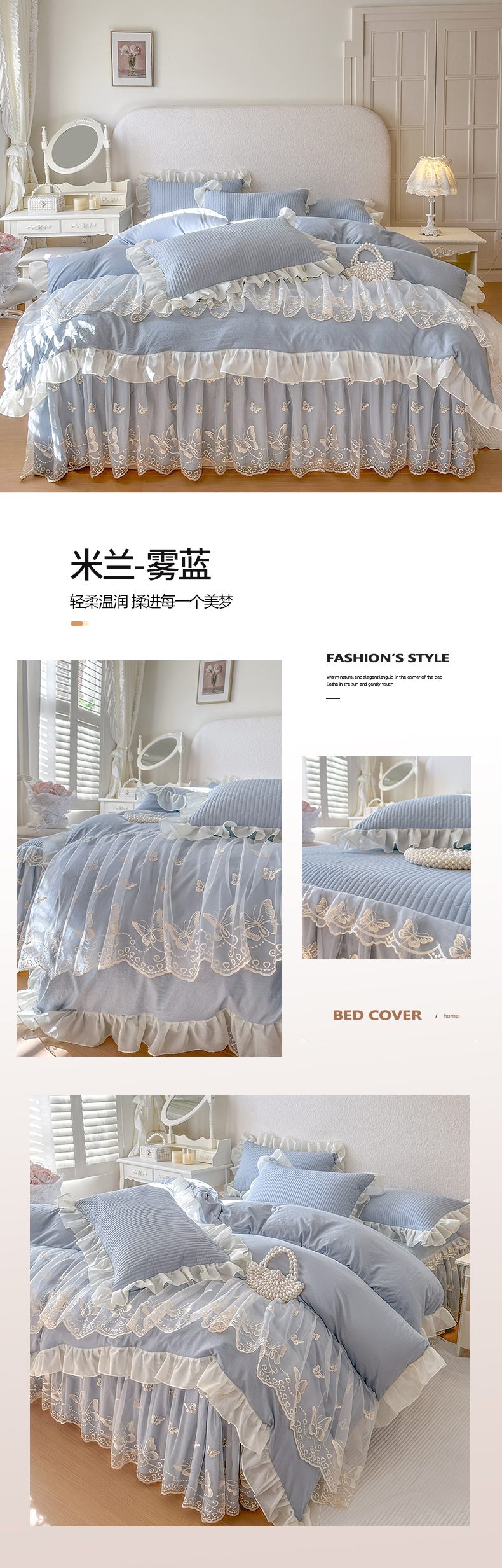 商品名称:瑞宝 2026新款泡芙棉花边床裙四件套-米兰系列 米兰-天蓝