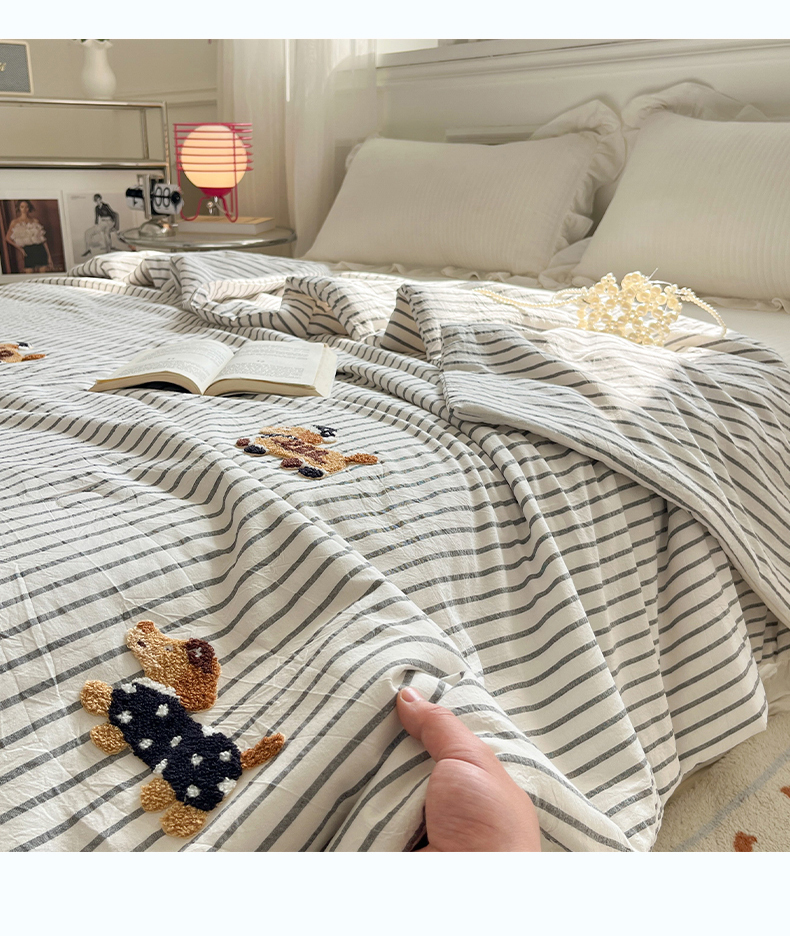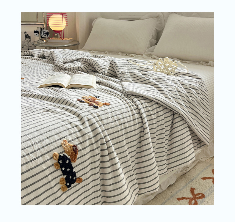 一加一 2026新款全棉色织水洗棉毛巾绣大豆夏被夏凉被空调被-腊肠狗 腊肠狗-灰条