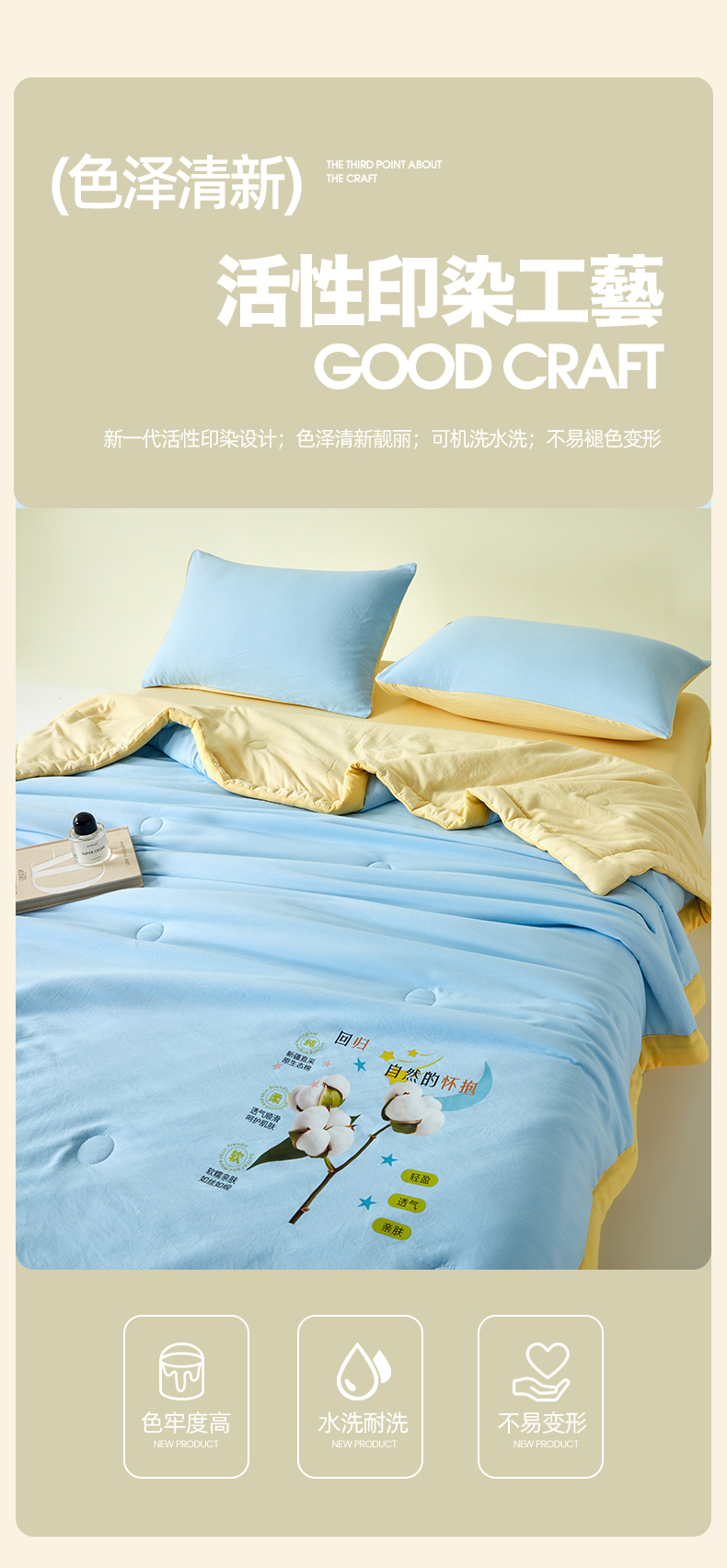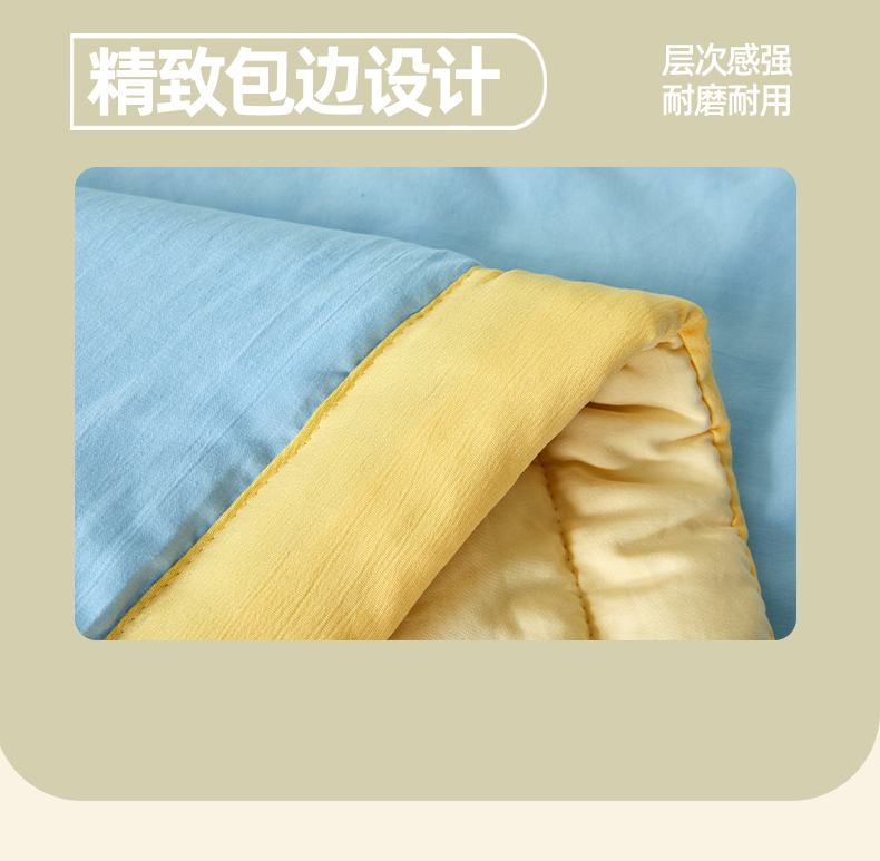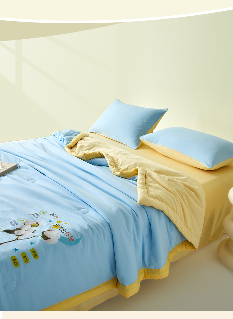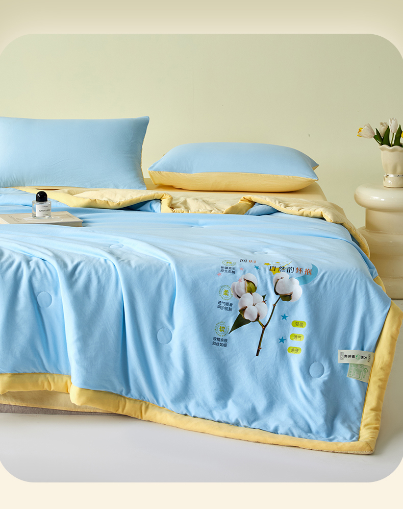• 91家纺网 家纺一手货源 找家纺 卡斯诺家纺馆 2026新款水洗棉棉花夏被四件套 天蓝奶黄