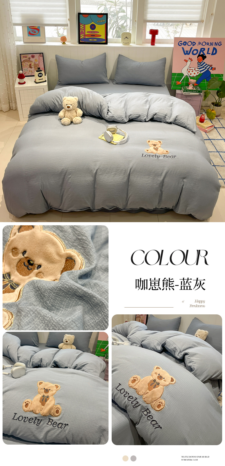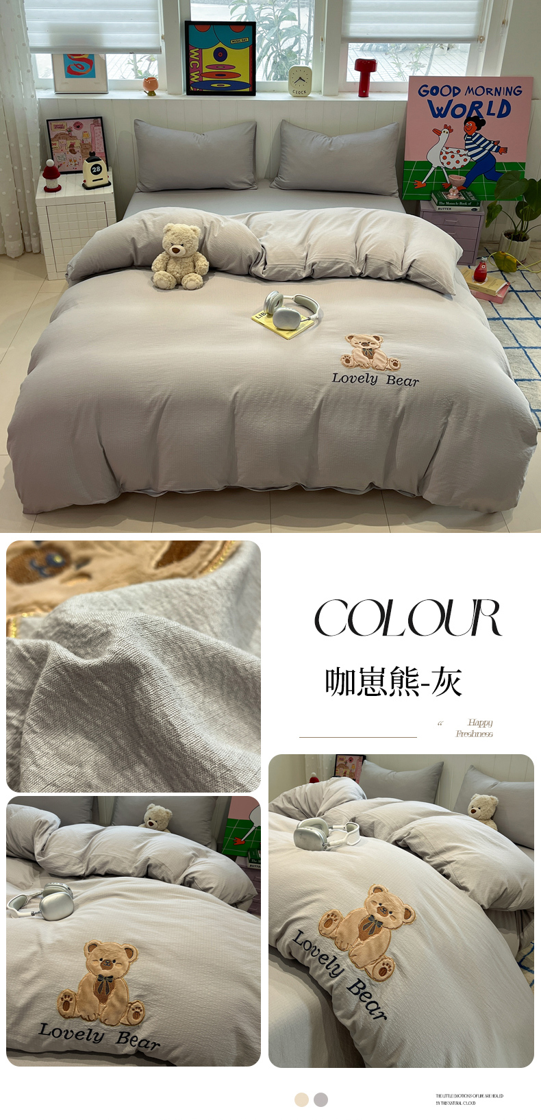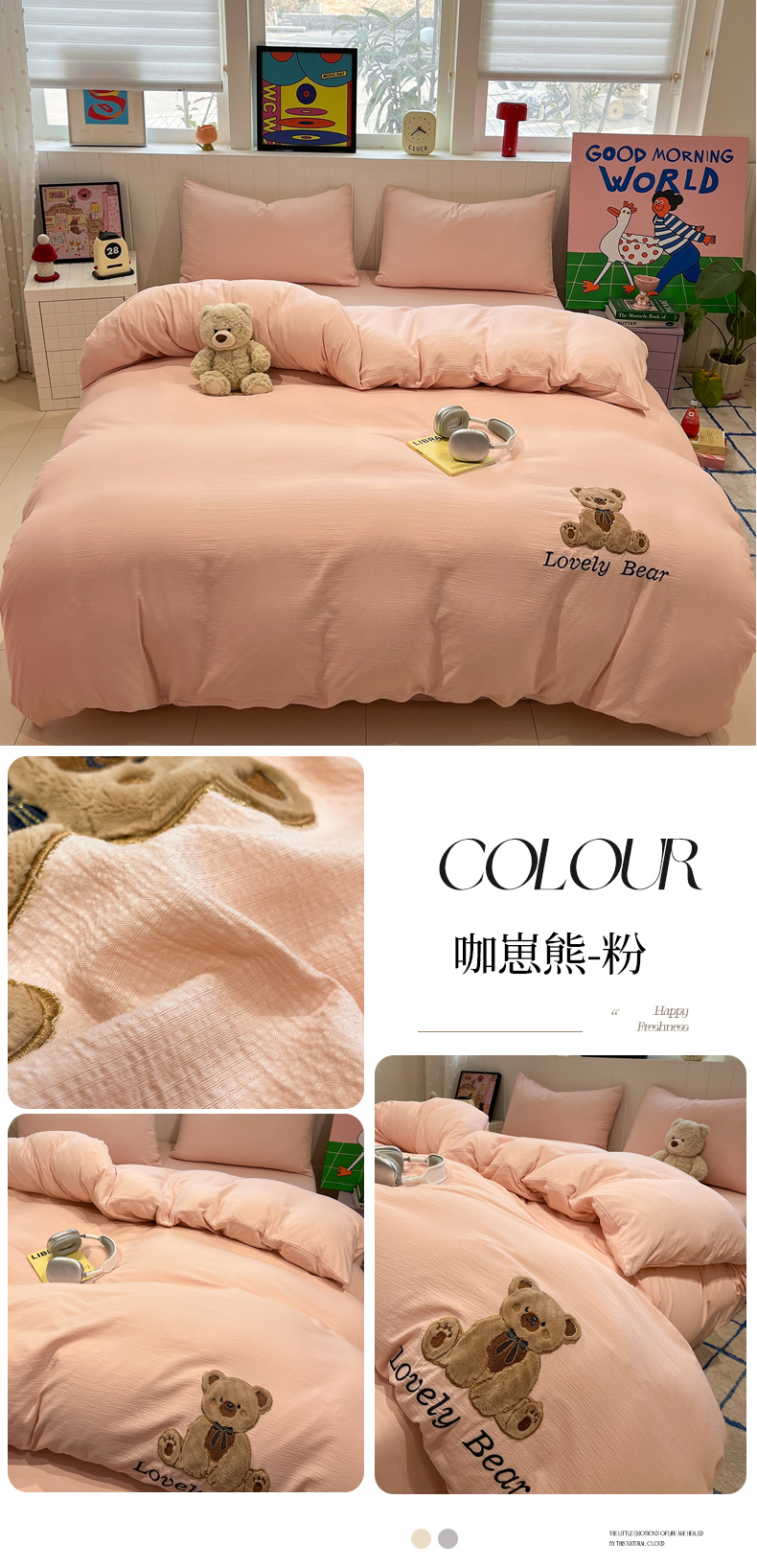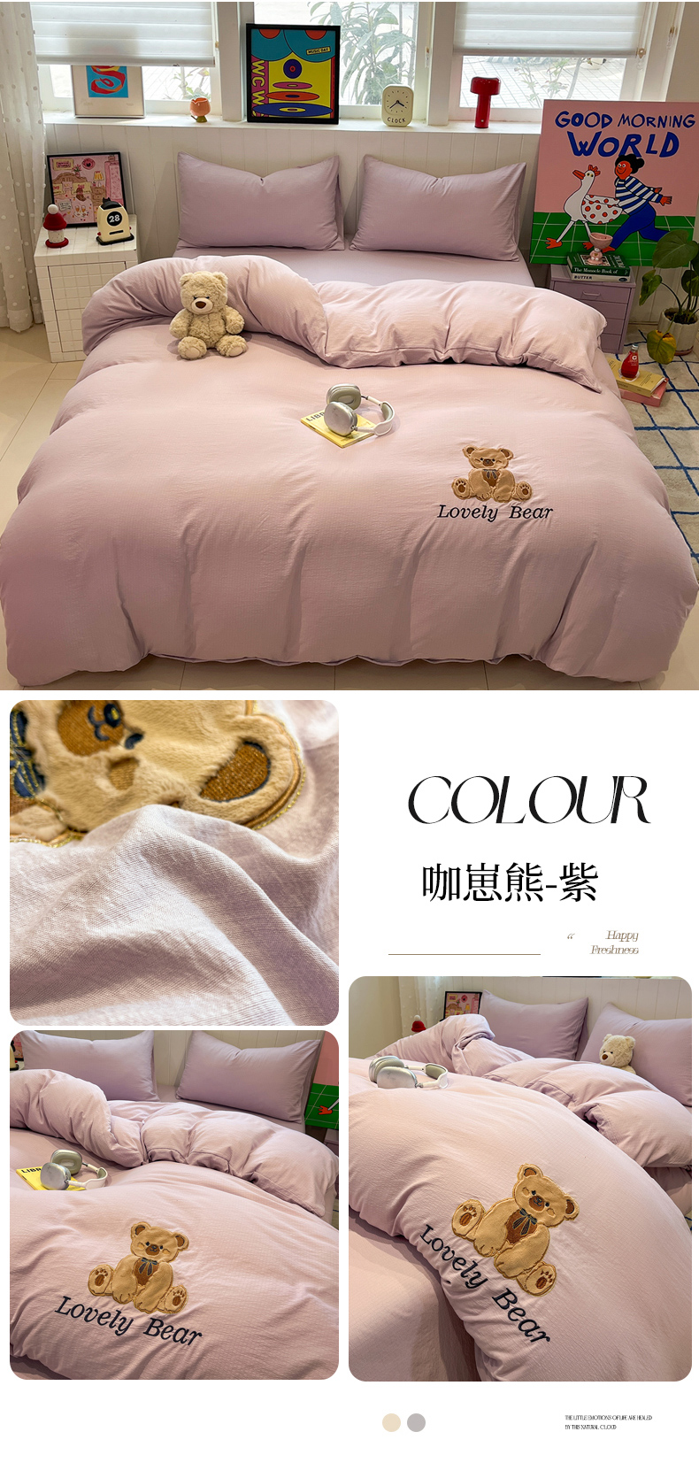 (总)爱思凯家纺 2026新款皱皱纱卡通贴布绣-咖崽熊四件套,咖崽熊-茶色,咖崽熊-浅米,咖崽熊-粉,咖崽熊-灰,咖崽熊-蓝灰,咖崽熊-绿,咖崽熊-紫