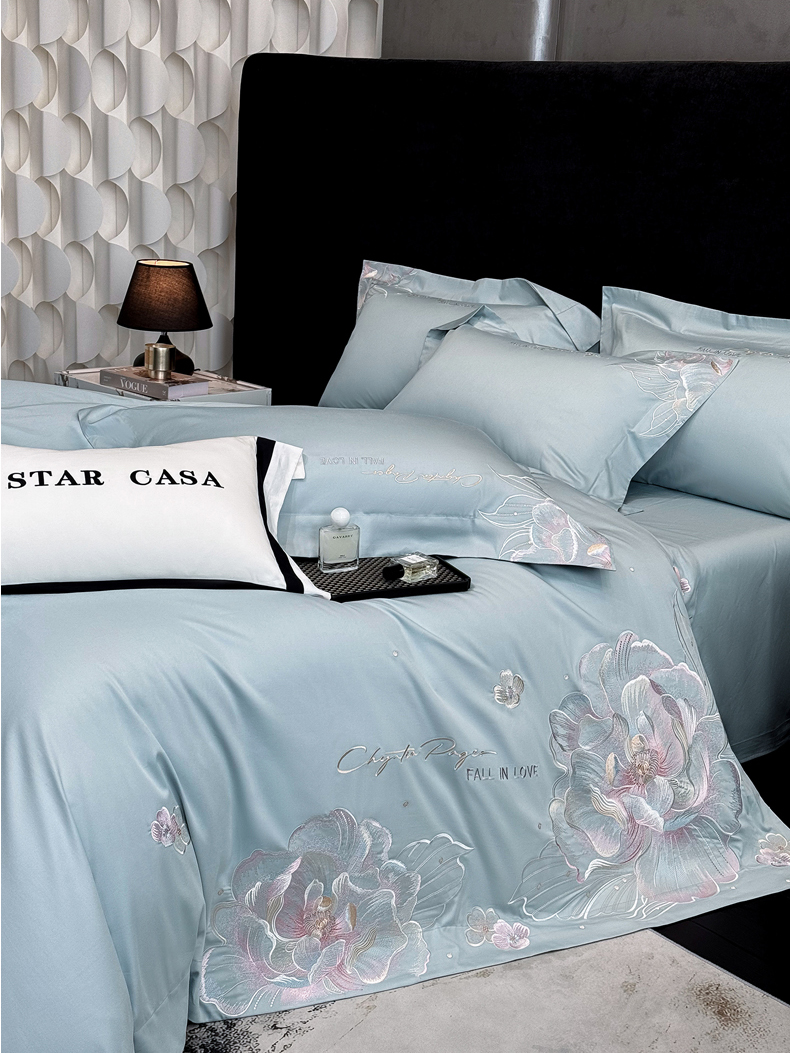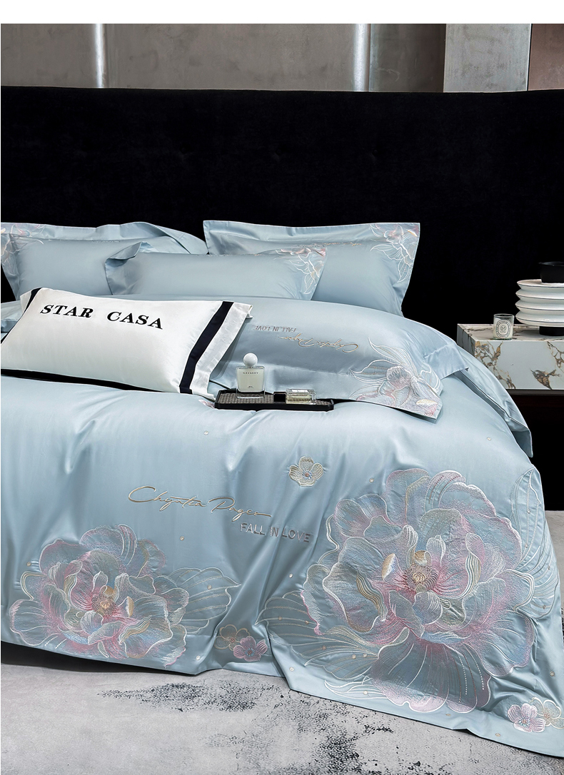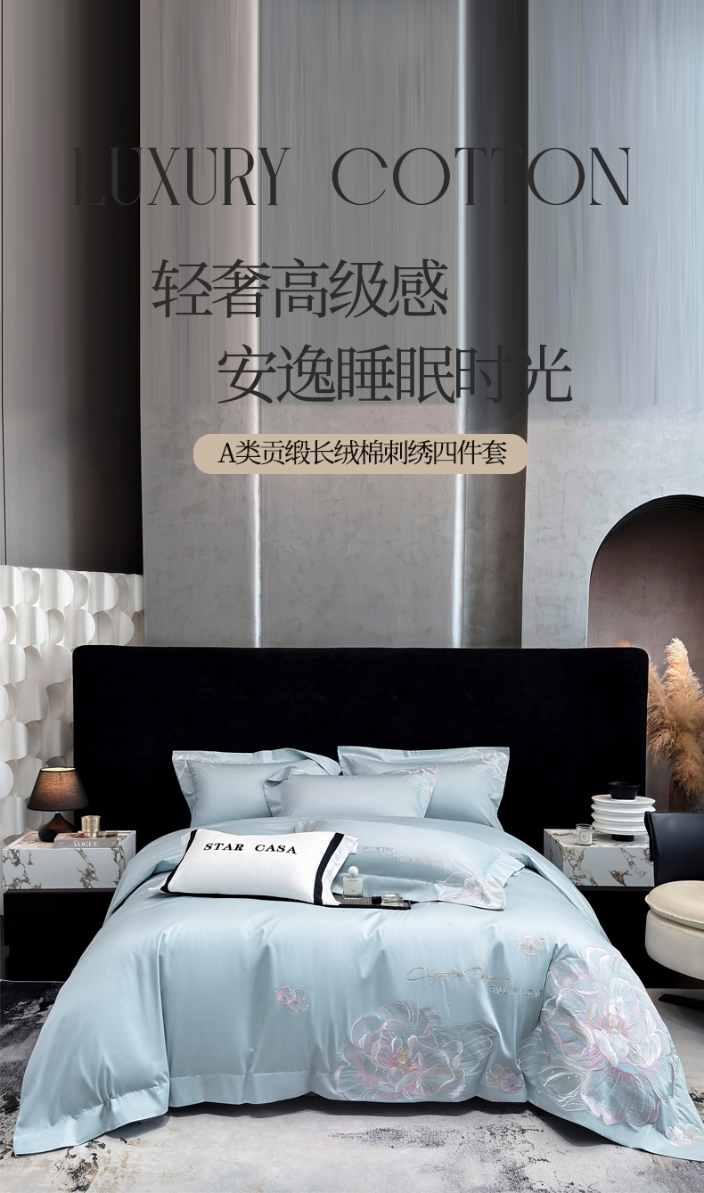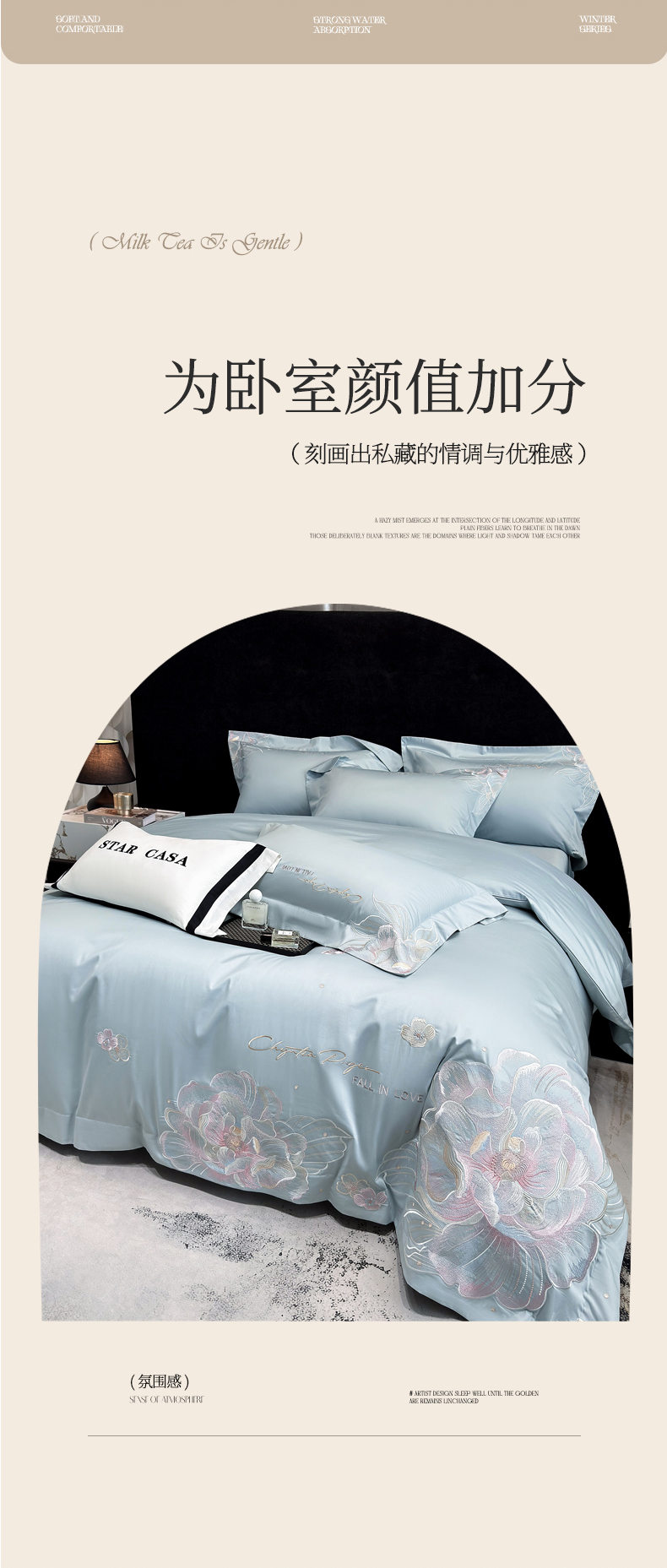 (总)星蕴家纺 2025新款新疆贡缎全棉刺绣四件套-黛尔【高档礼盒包装】,繁星蓝,白拼玉,浅香槟,雅灰粉