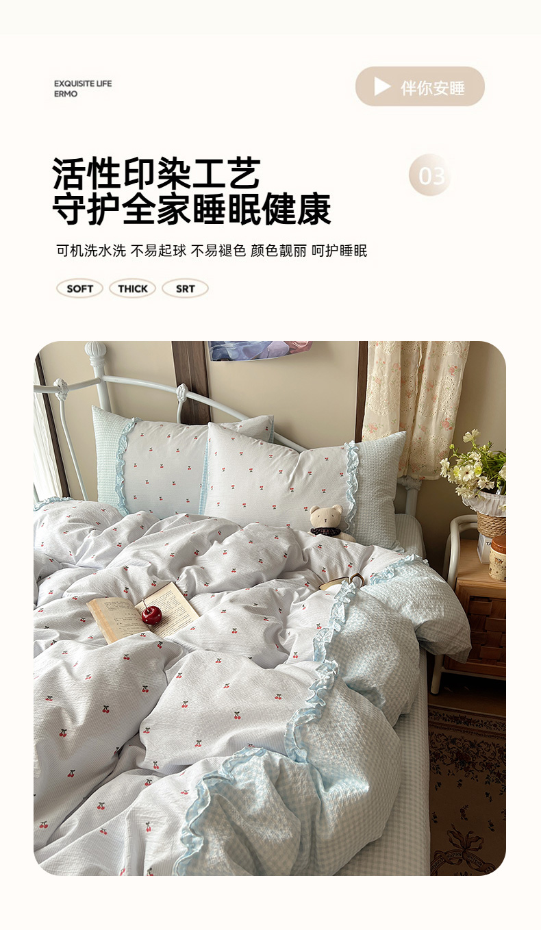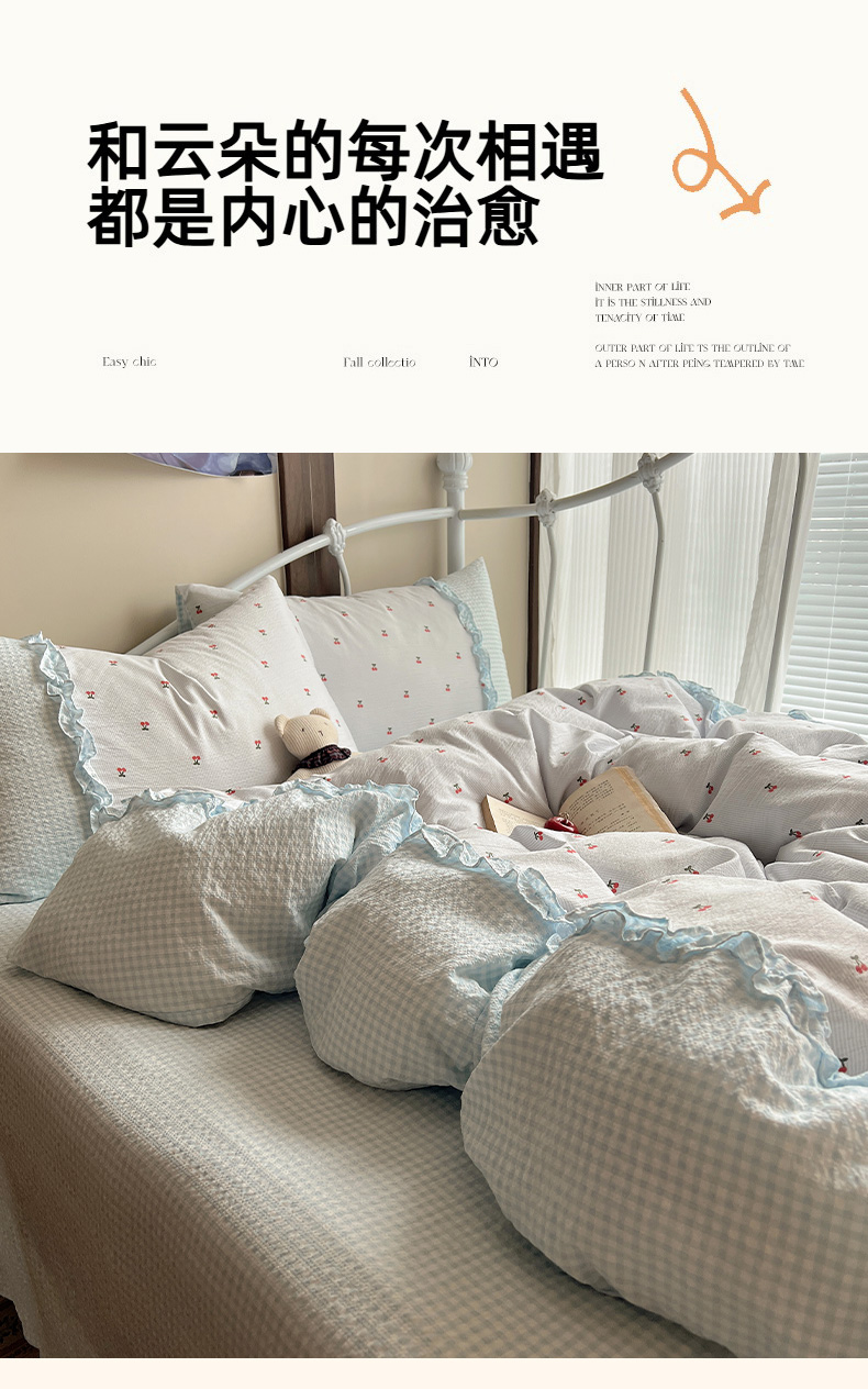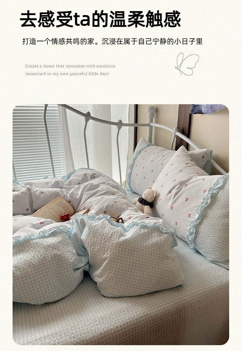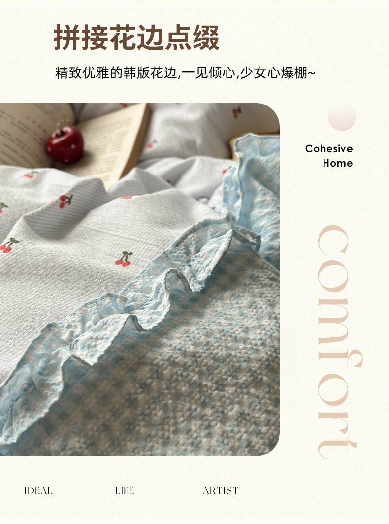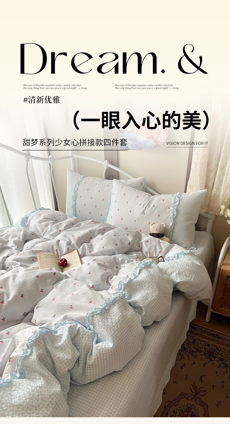 当前位置: 91家纺网 > 商品网购 > 床品套件 > 四件套 > 其它四件套 > 繁花家居 2026殷桃晚风甜梦系列少女心拼接工艺四件套 晚风甜梦-蓝