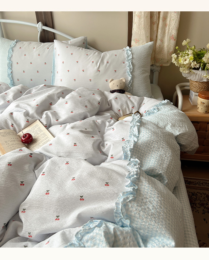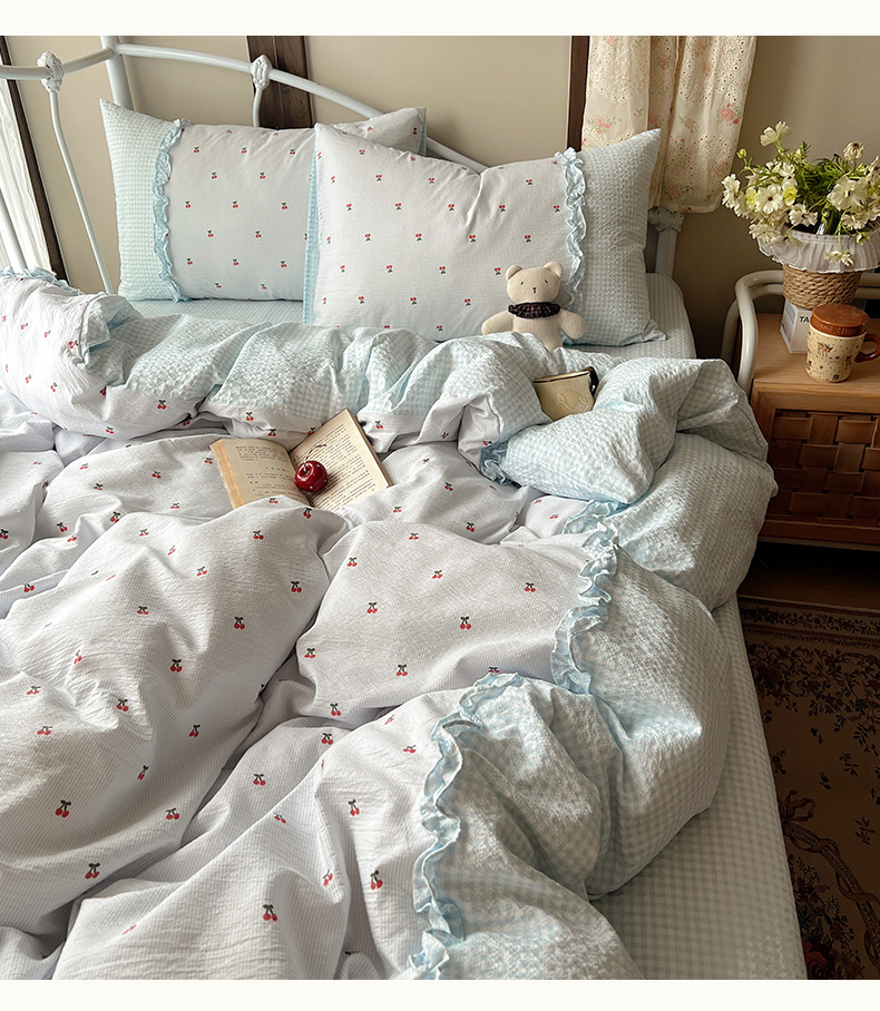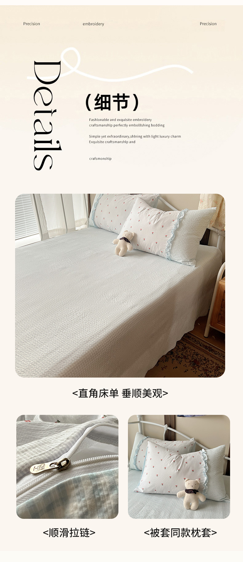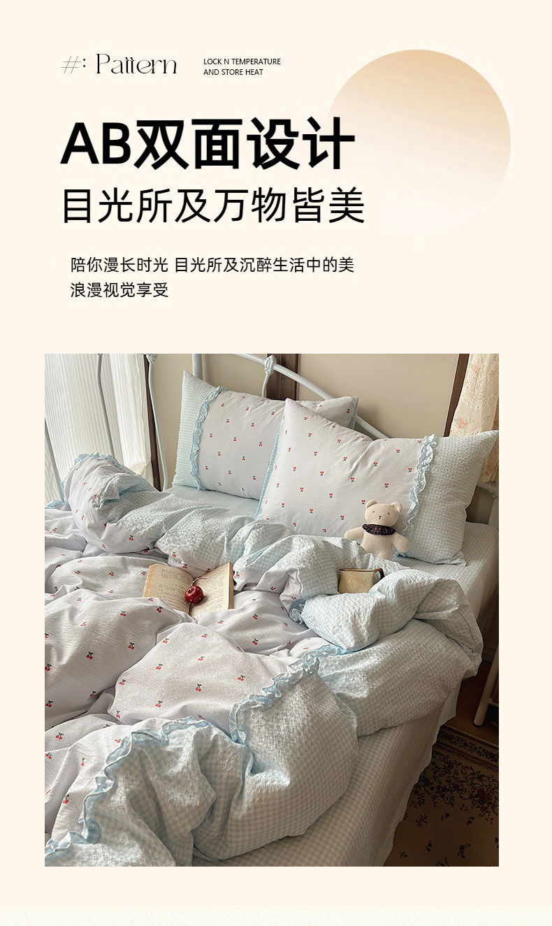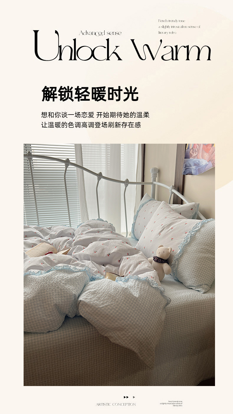 当前位置: 91家纺网 > 商品网购 > 床品套件 > 四件套 > 其它四件套 > 繁花家居 2026殷桃晚风甜梦系列少女心拼接工艺四件套 晚风甜梦-蓝