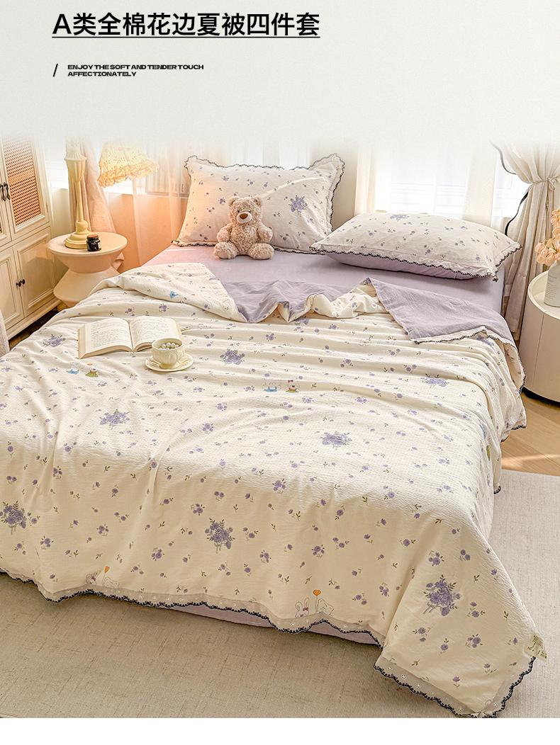 当前位置: 91家纺网 > 商品网购 > 被子 > 夏被 > 招财星家纺 2026新款A类全棉花边云感双层纱大豆纤维夏被四件套夏被夏凉被空调被(带质检报告买家秀) 花边款-花园秘密