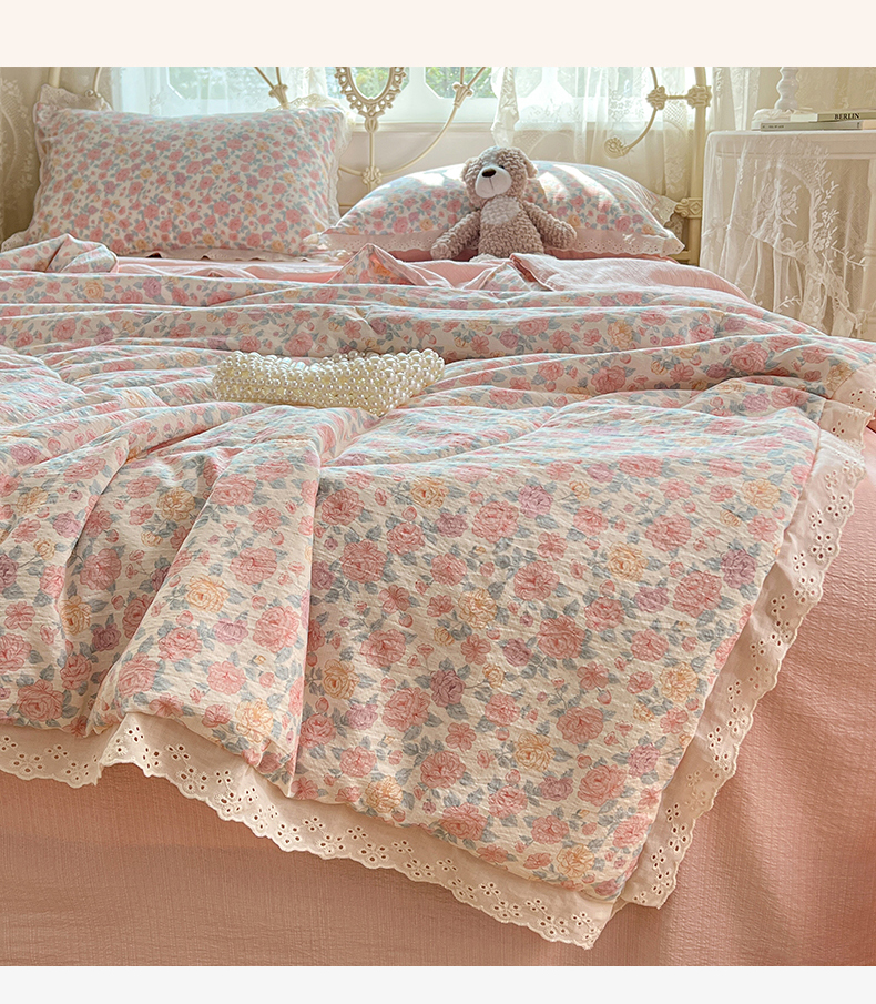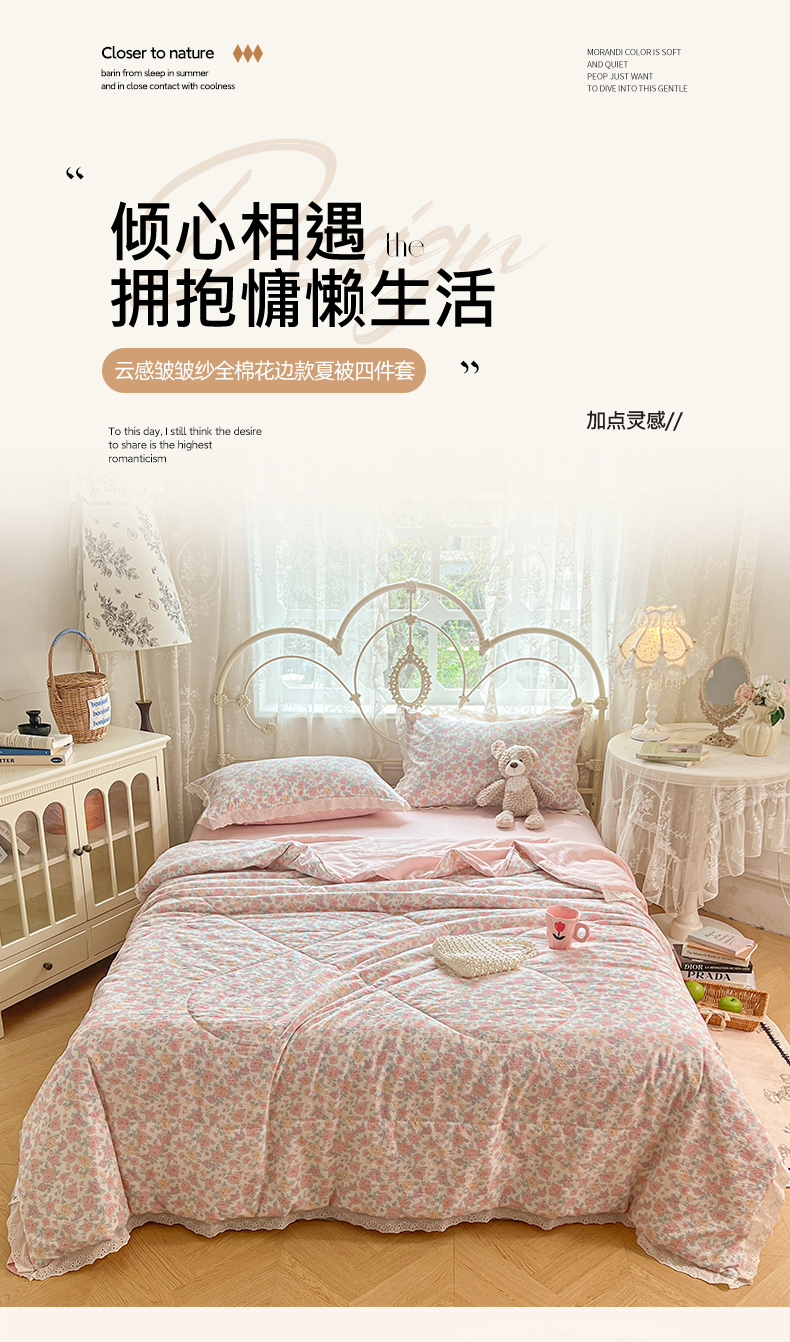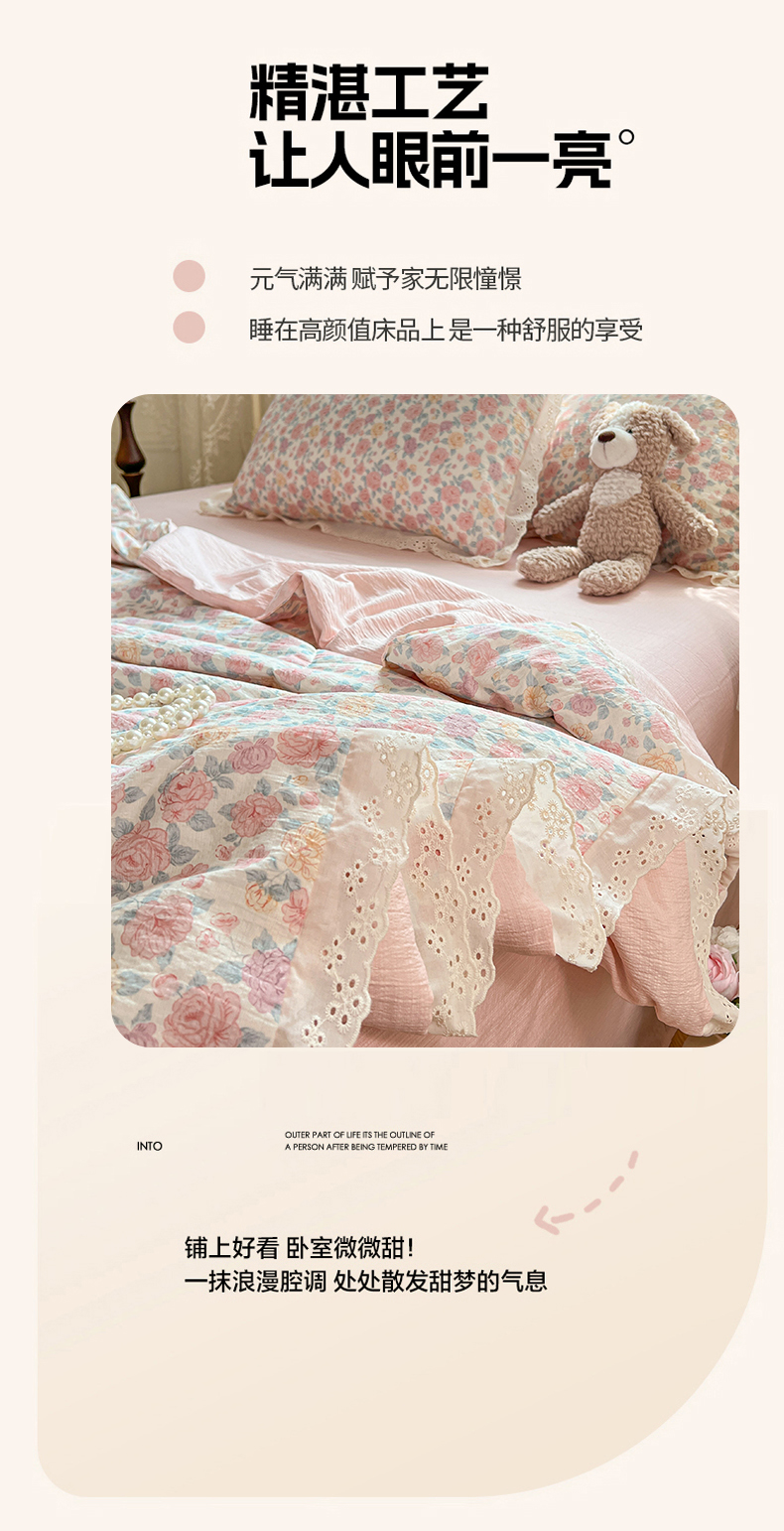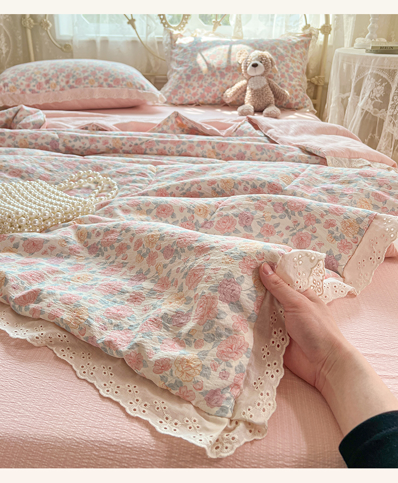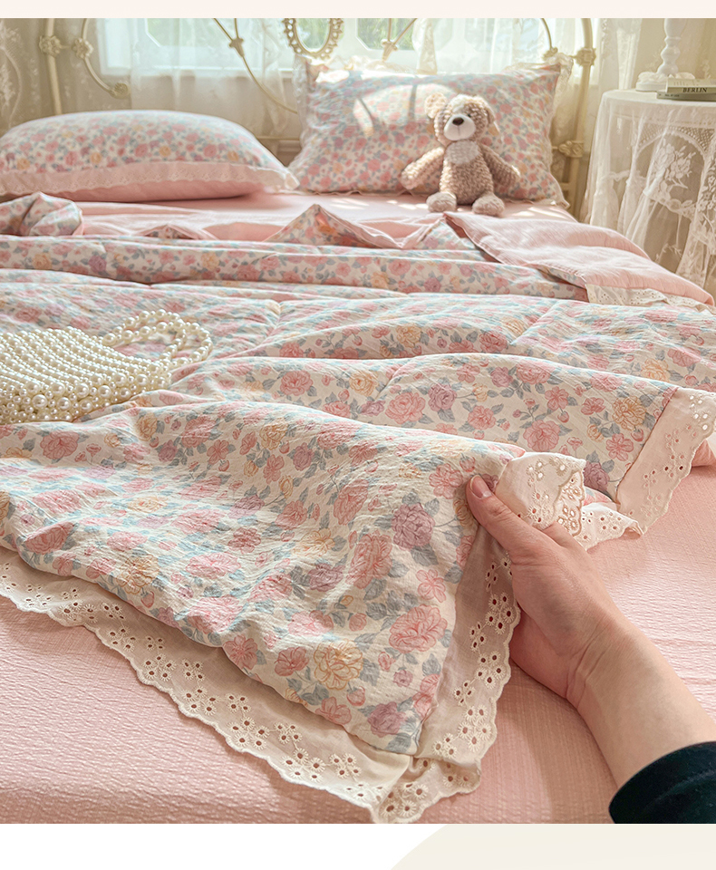 商品名称:优佳优品 2026新款云感皱皱纱全棉花边款夏被四件套 粉糯