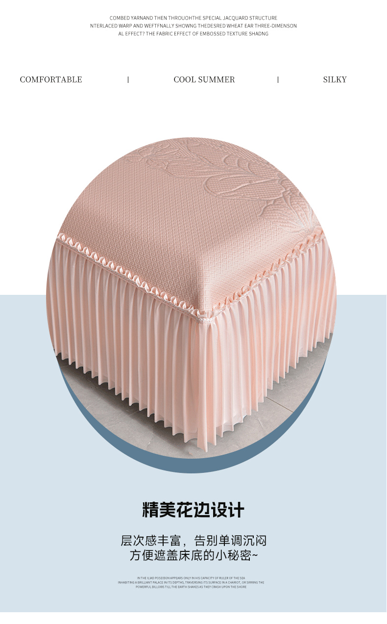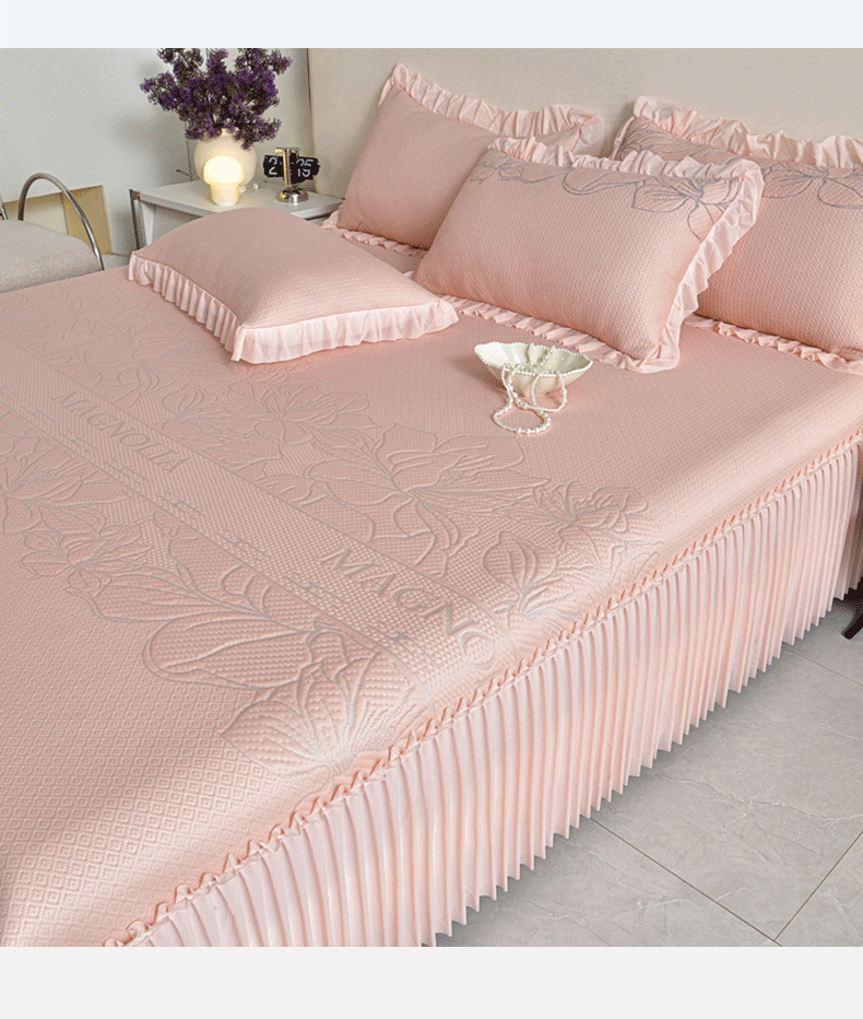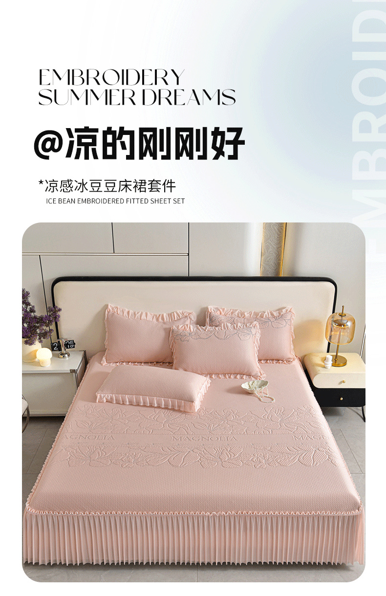 (总)畅畅家纺 2026新款锦氨夏被PE凉感豆豆凉席绣花三明治复合床裙三件套四件套,格韵-粉-床裙款,格韵-灰-床裙款,格韵-蓝-床裙款,格韵-绿-床裙款