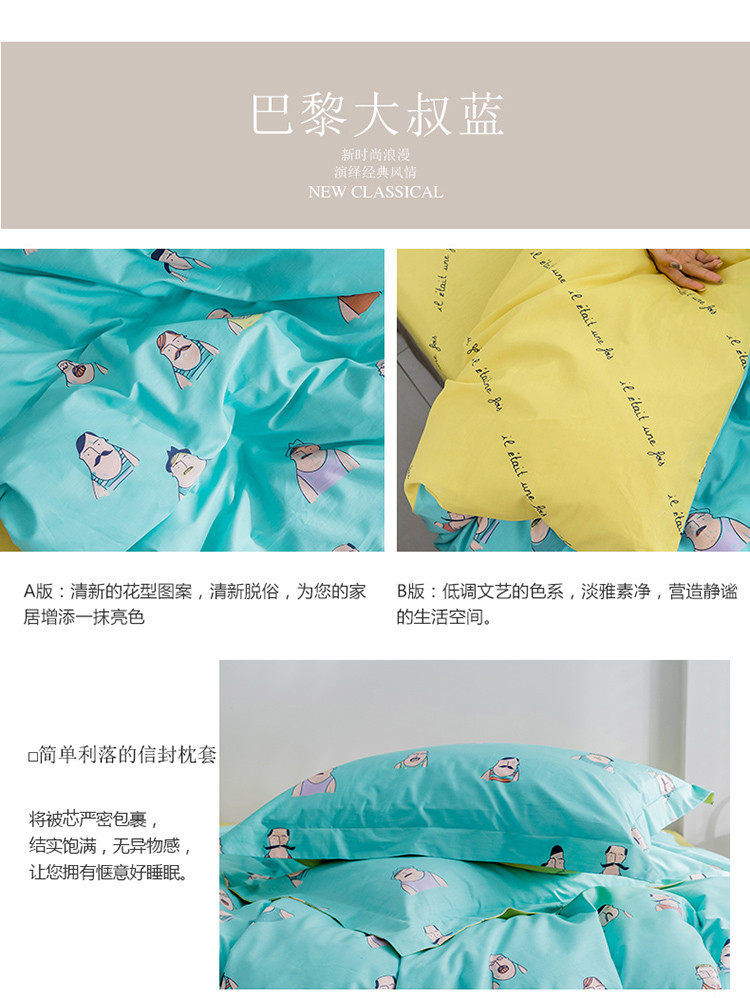 窝米2019全棉13372卡通花卉系列四件套床单款巴黎大叔蓝