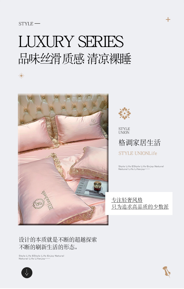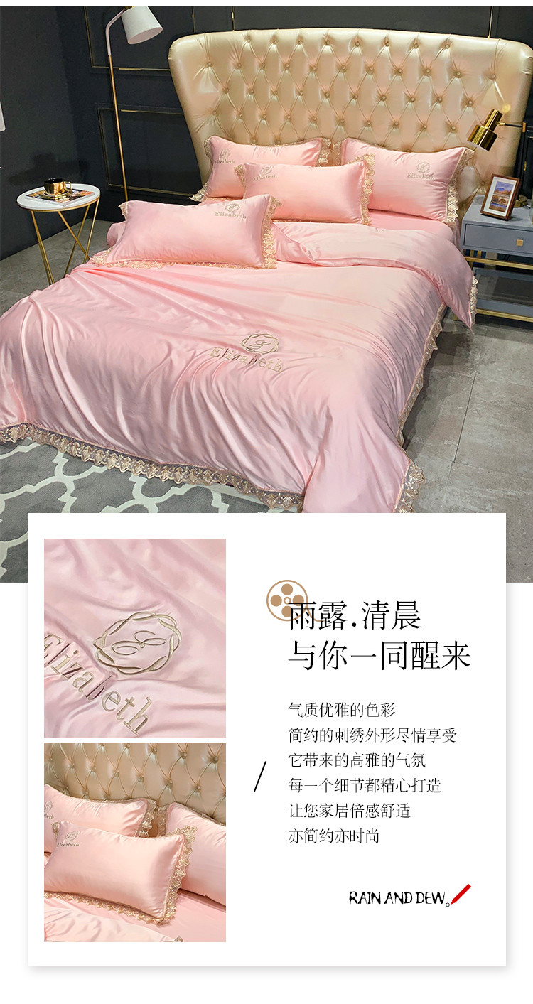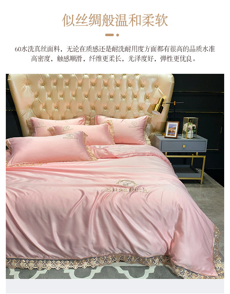 米奈 2020新款水洗真丝蕾丝花边爱琳系列四件套 嫩粉