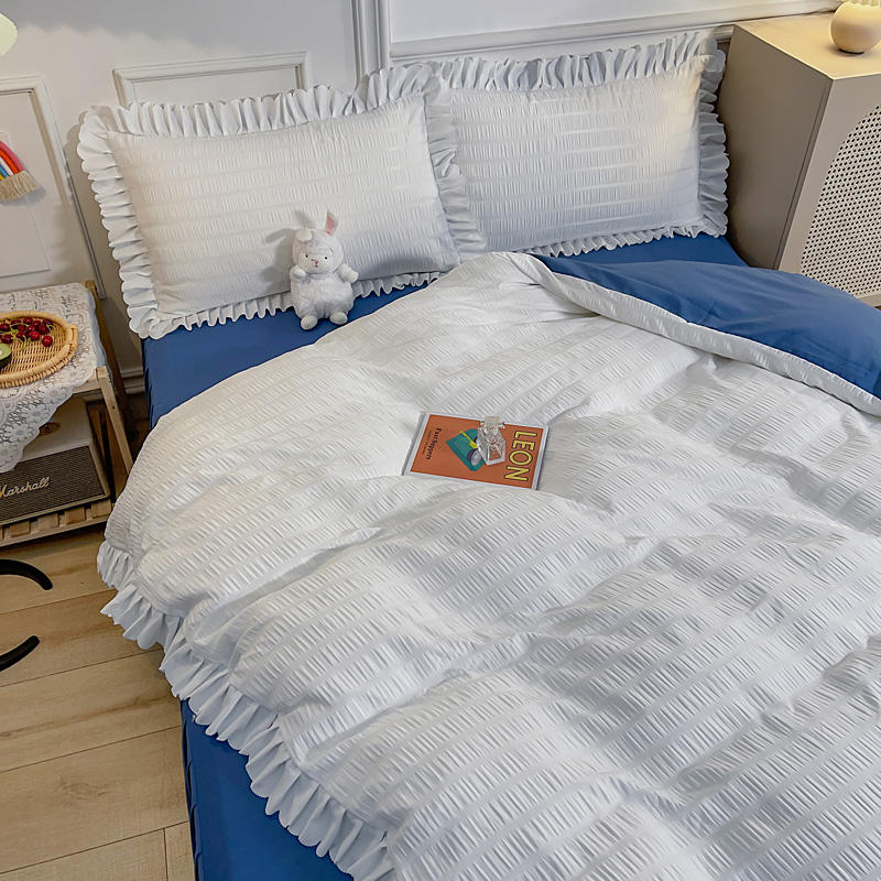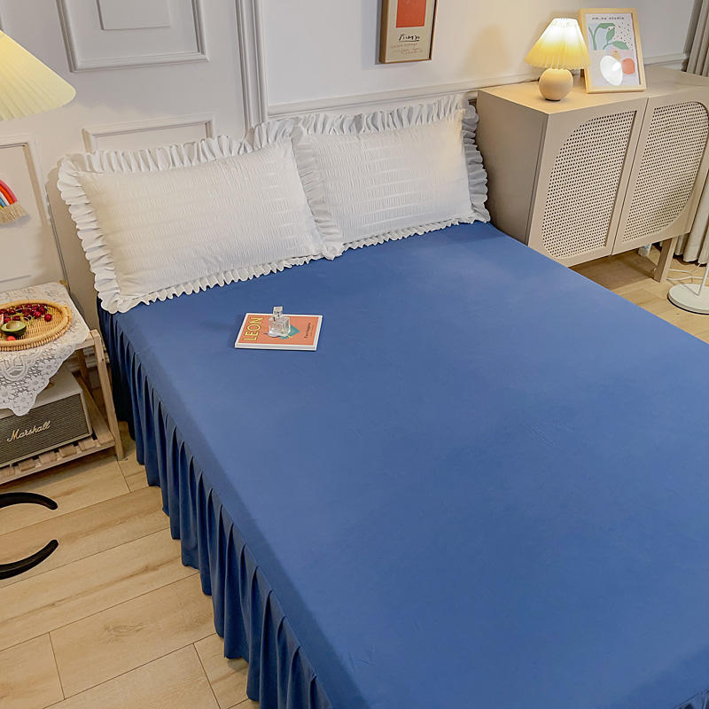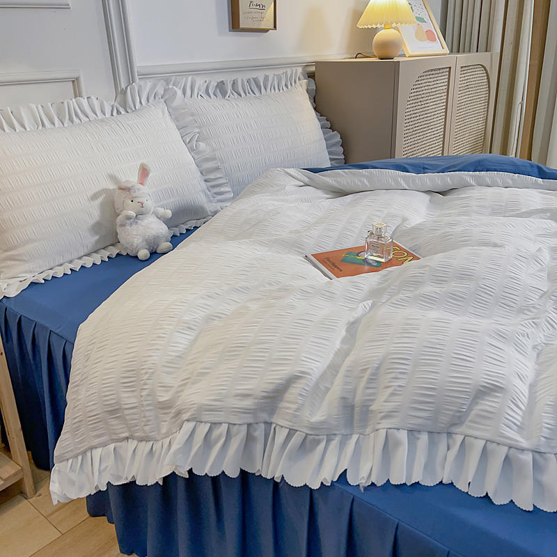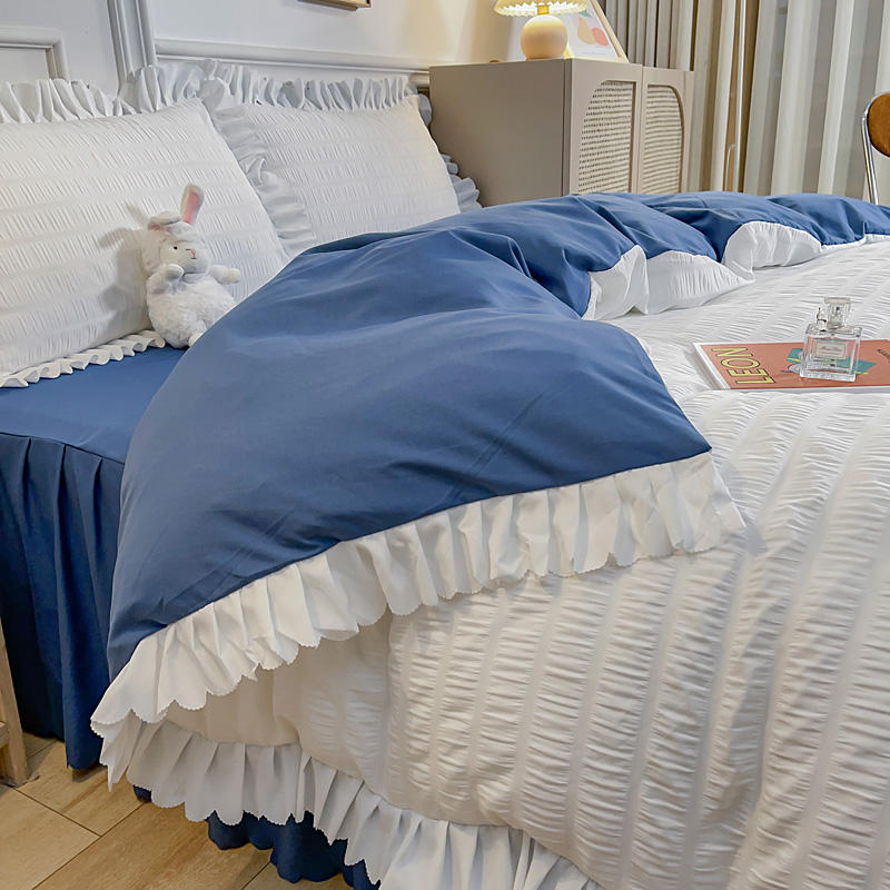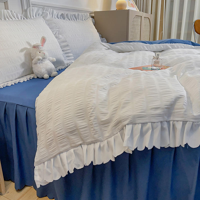 当前位置: 91家纺网 > 商品网购 > 床品套件 > 四件套 > 化纤普通四件套 > 秋艳 荷叶边泡泡纱床裙四件套床单公主系列 泡泡小姐-蓝白