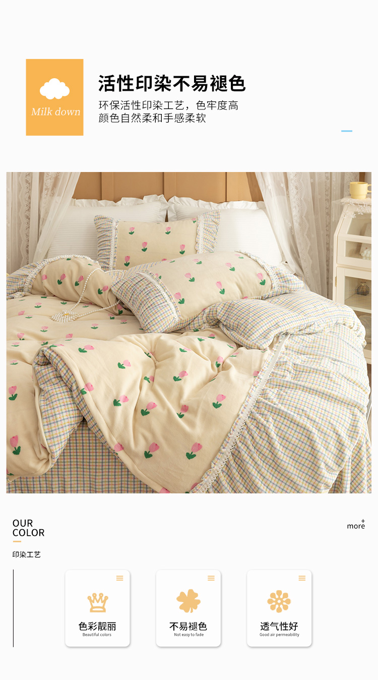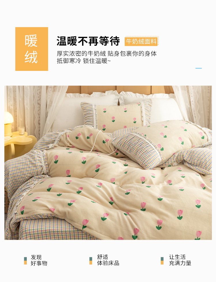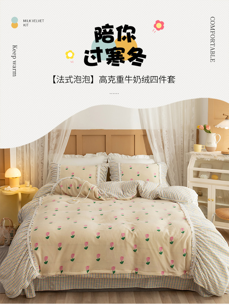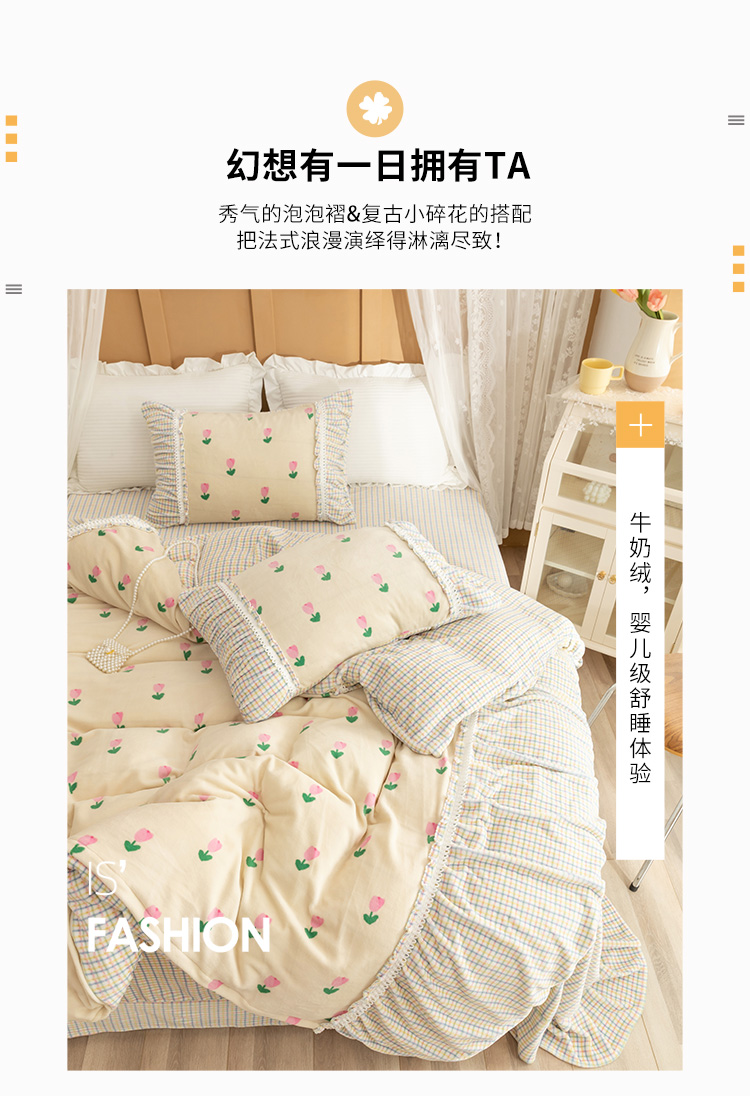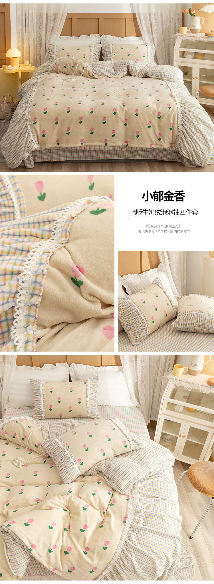 金爱家 2021新款直播热卖牛奶绒220g泡泡袖四件套 小郁金香