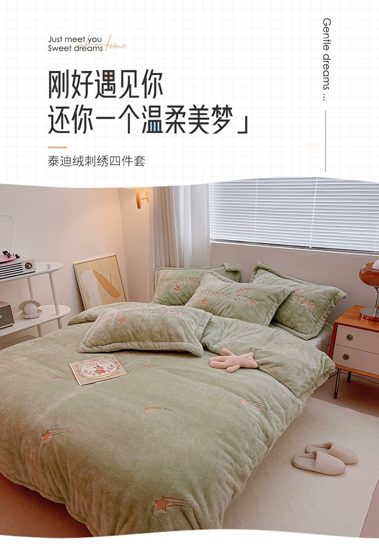 雅居纺 2022新款泰迪绒绣花四件套拍摄风格1 许愿星-果绿
