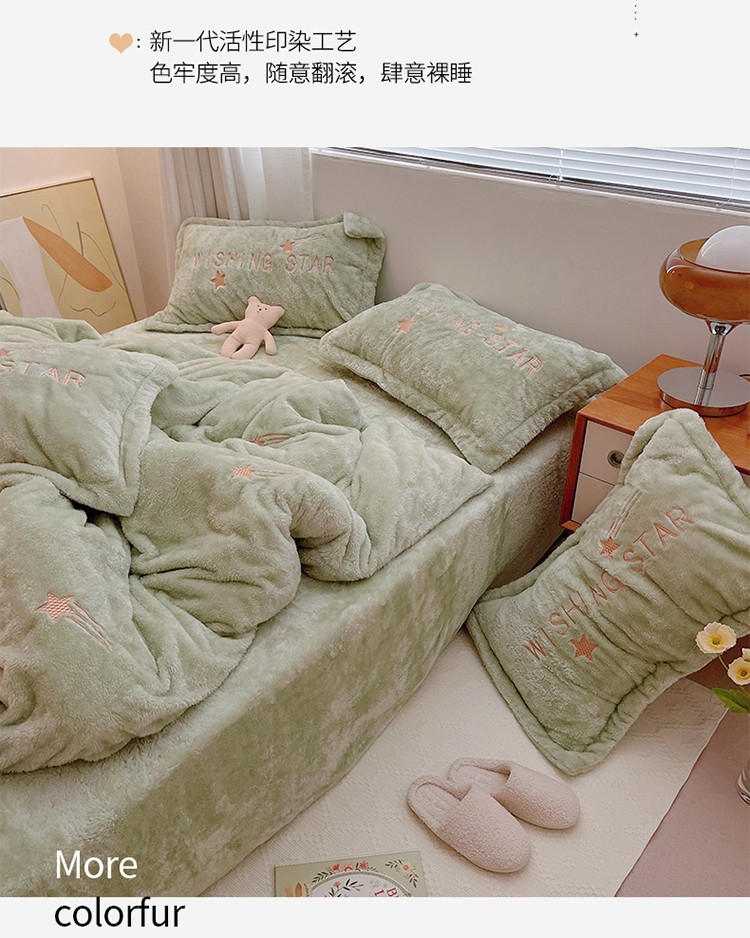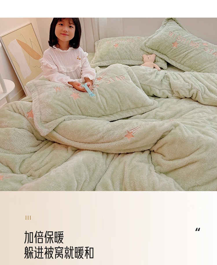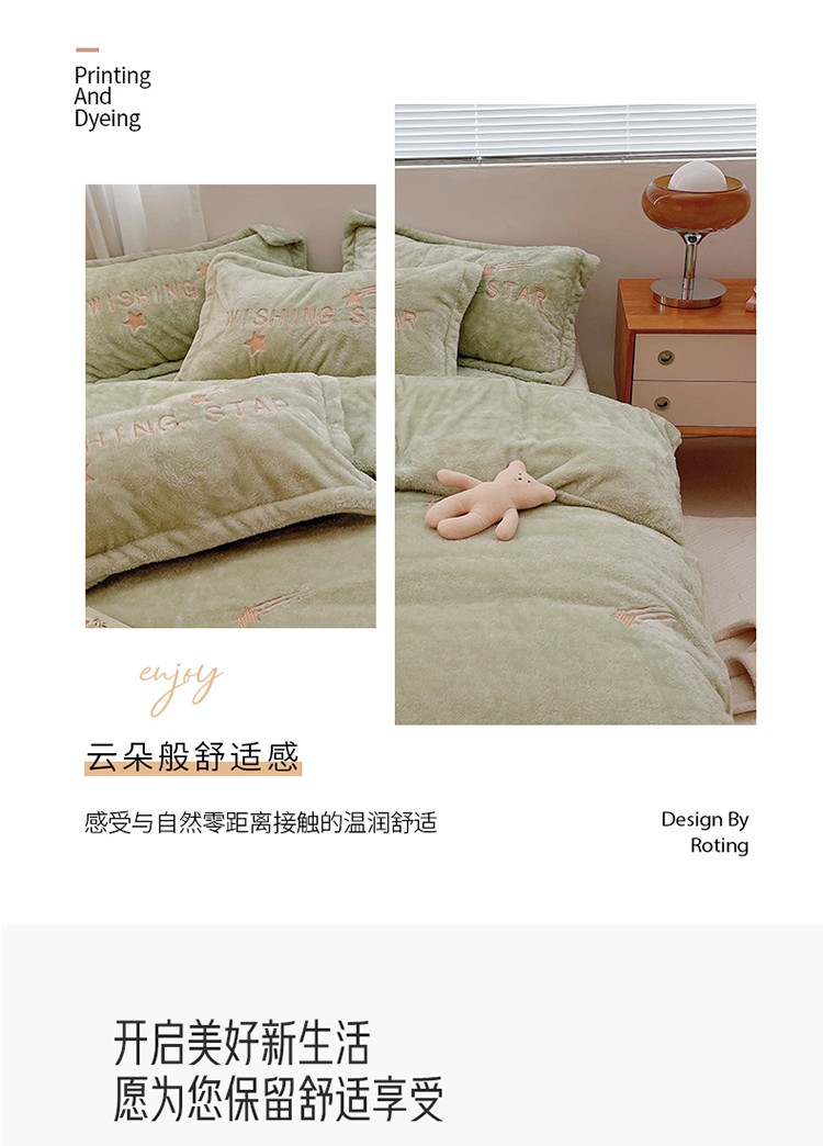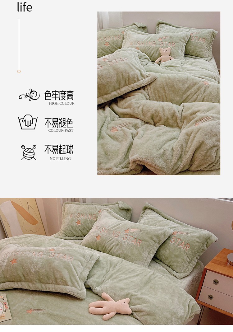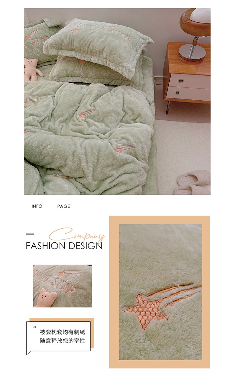商品名称:雅居纺 2022新款泰迪绒绣花四件套拍摄风格1 许愿星-果绿