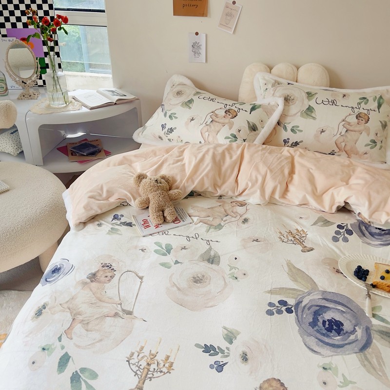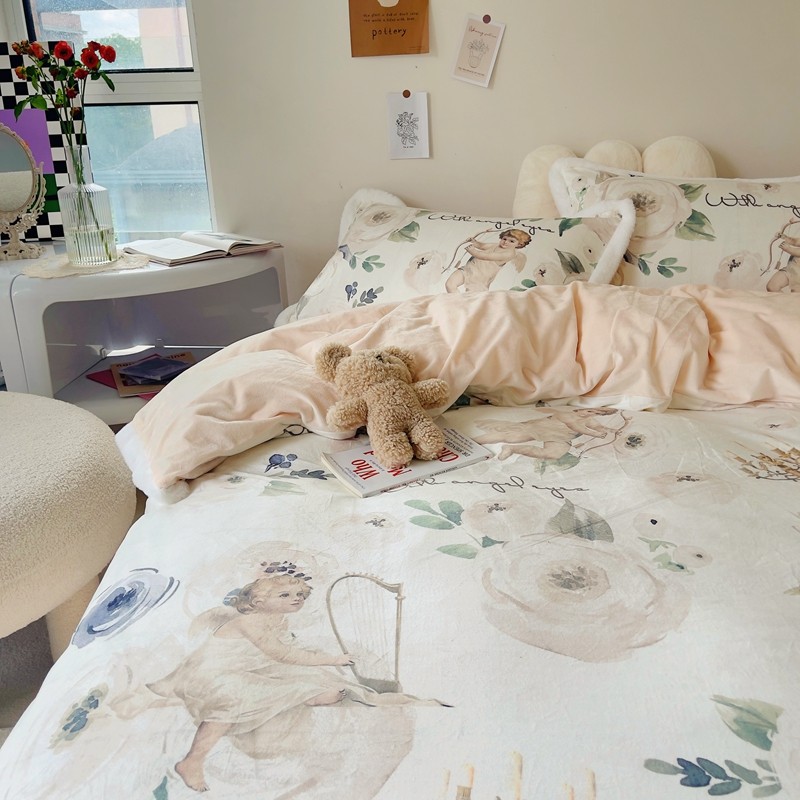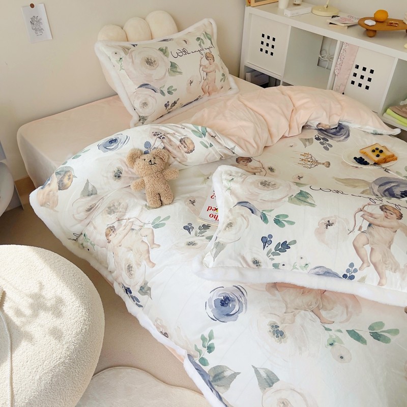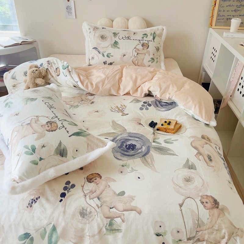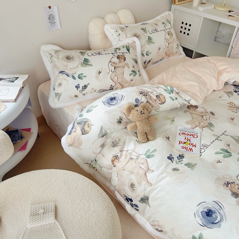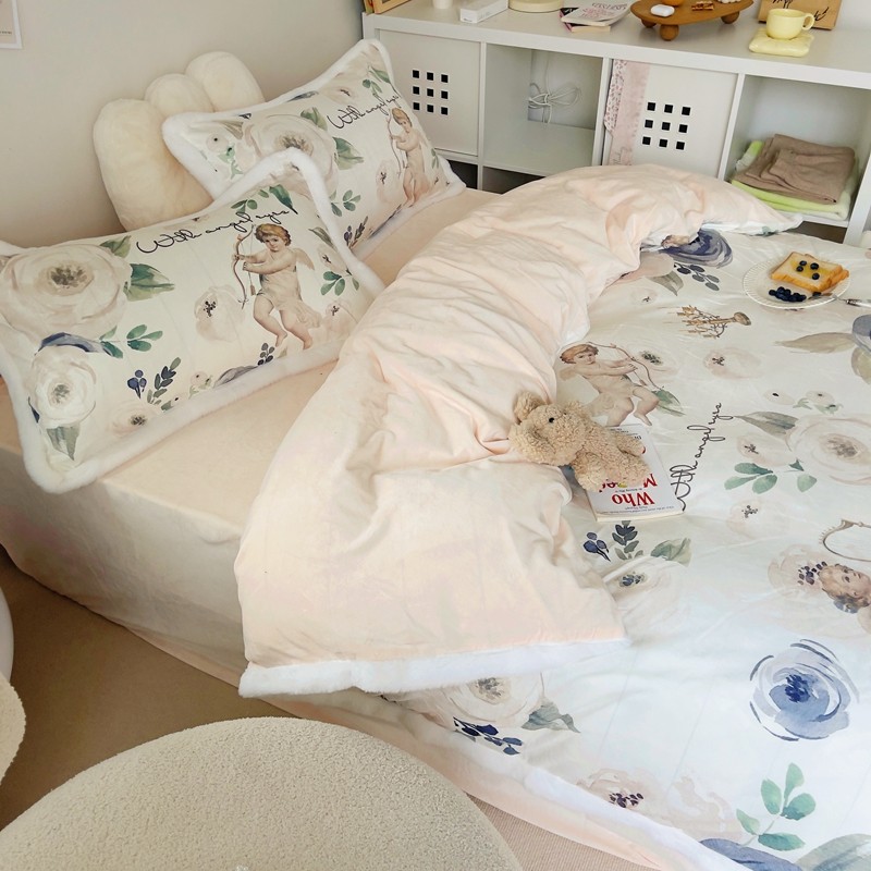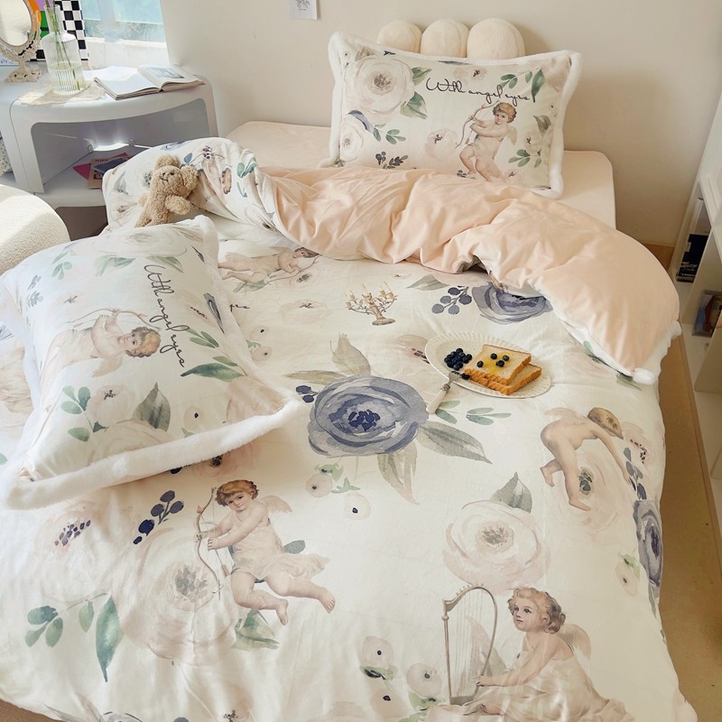 圆岛家纺 新款冬季数码印花高档婴儿绒兔兔绒四件套 复古天使