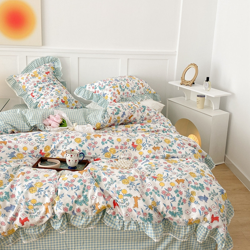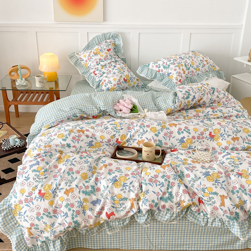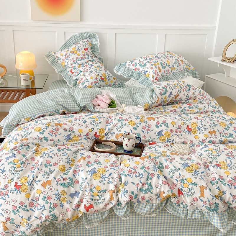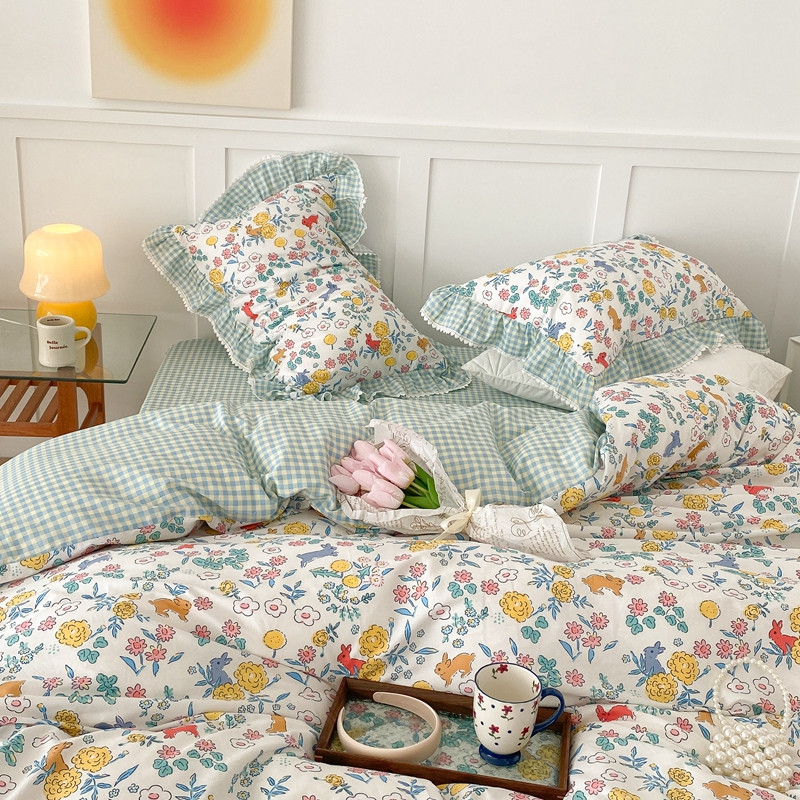 昔可家纺 2022新款全棉格子花边款四件套 田园兔兔