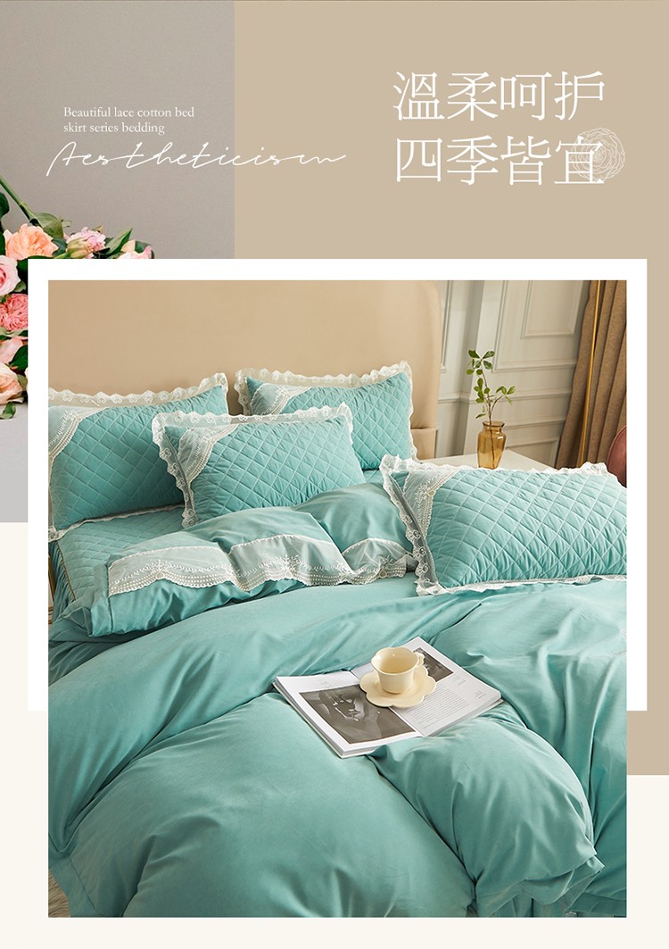 网红馆 2025新款唯美蕾丝夹棉床裙四件套婉约佳人 青绿色