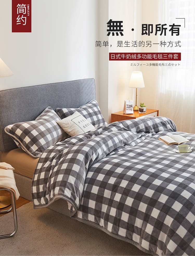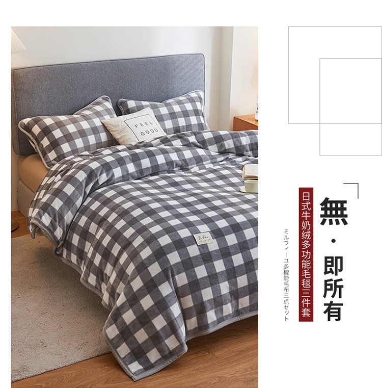 当前位置: 91家纺网 > 商品网购 > 床品套件 > 三件套 > 丝幔 2025新款日式牛奶绒多功能毛毯三件套 灰大格